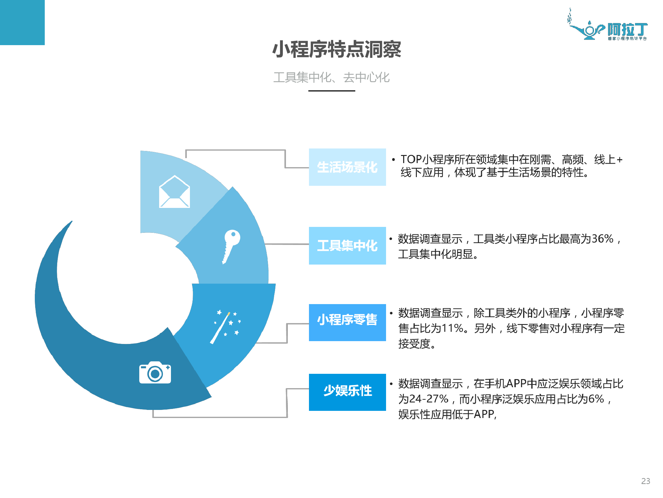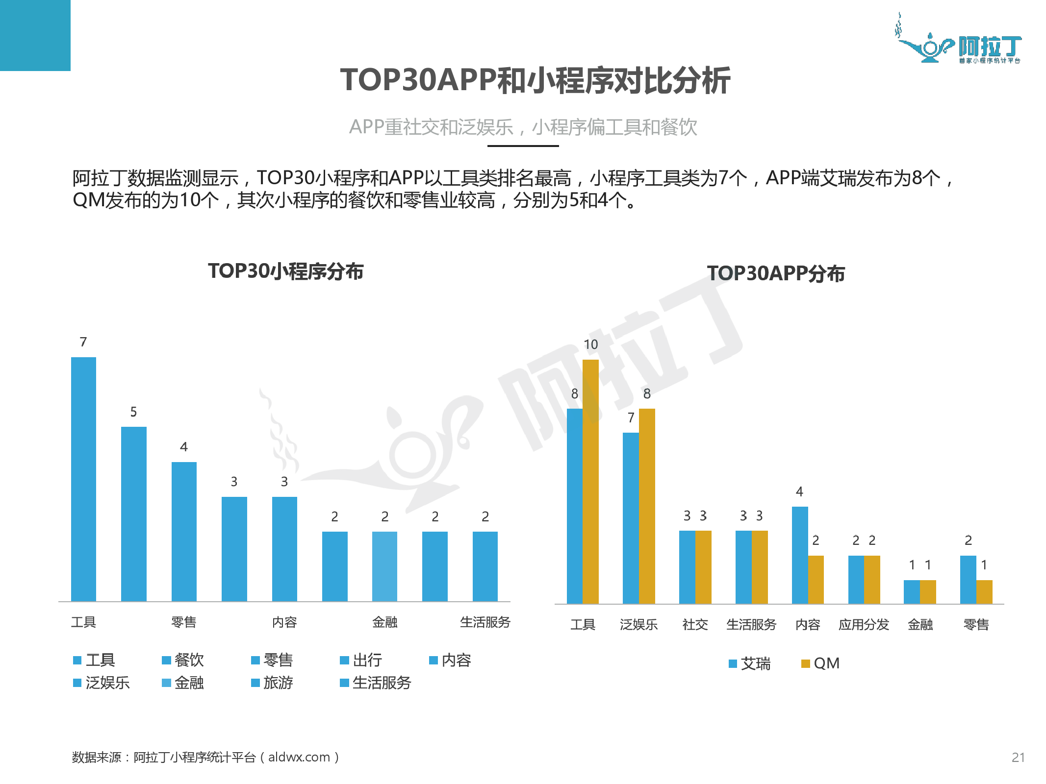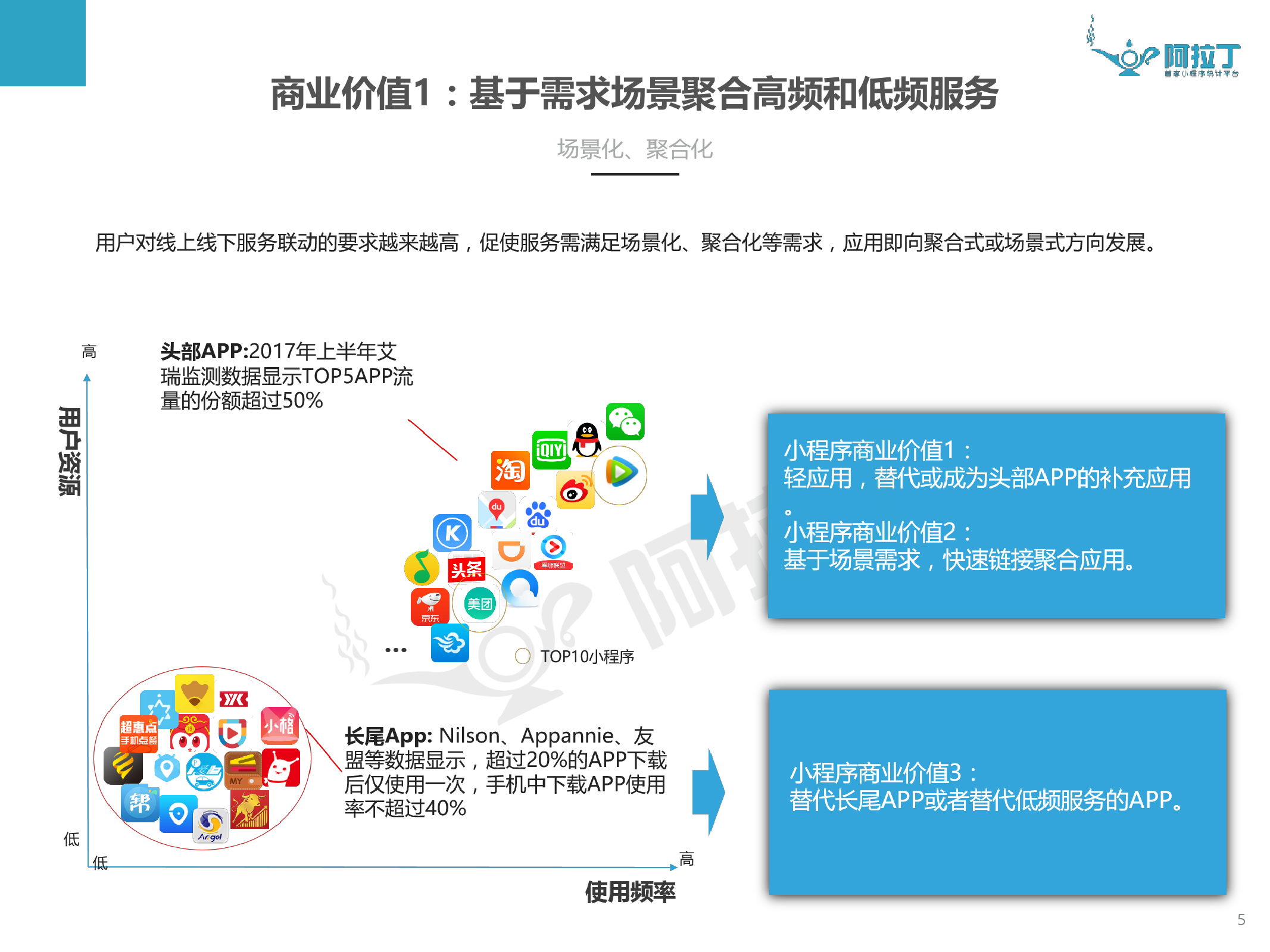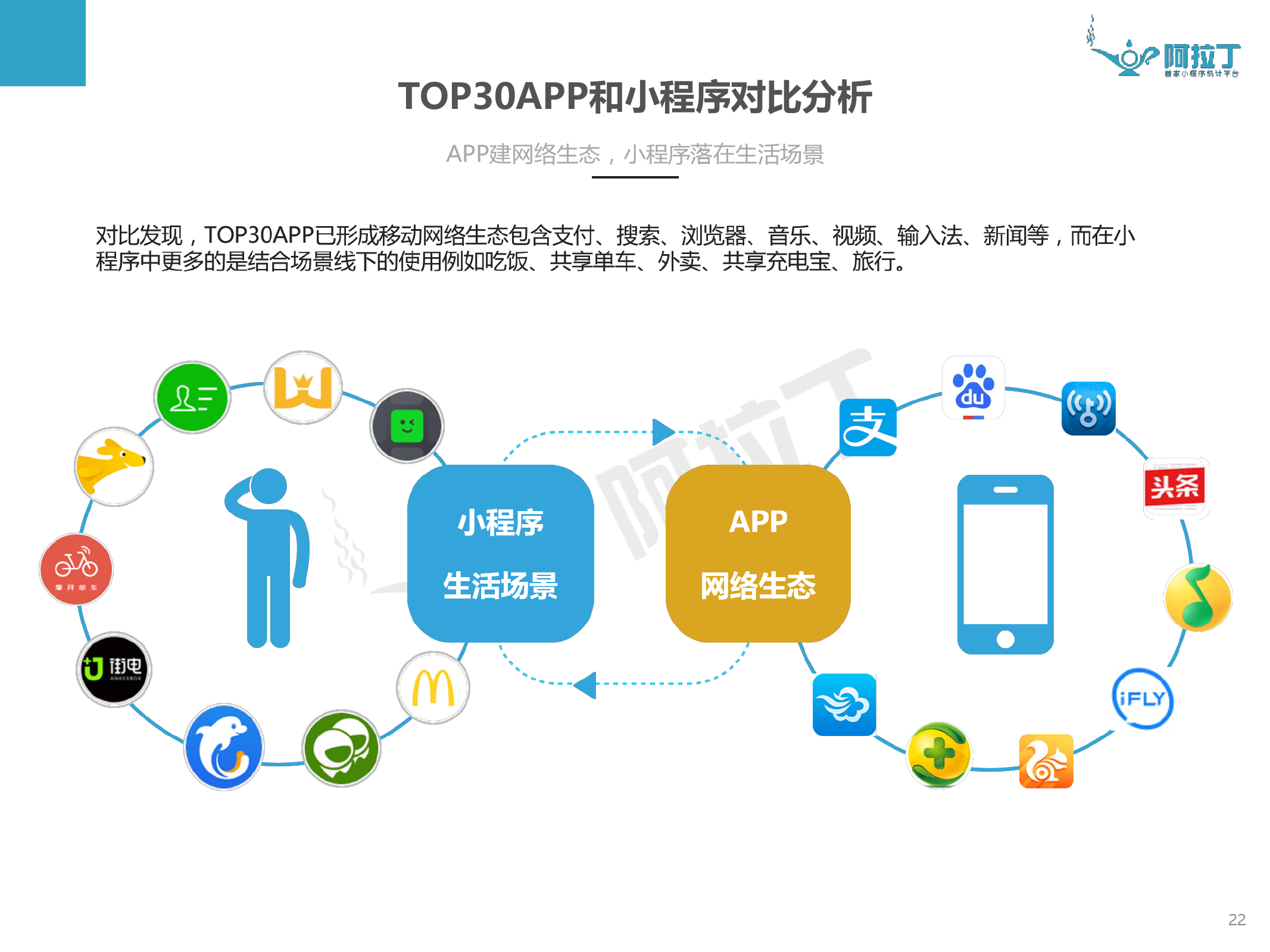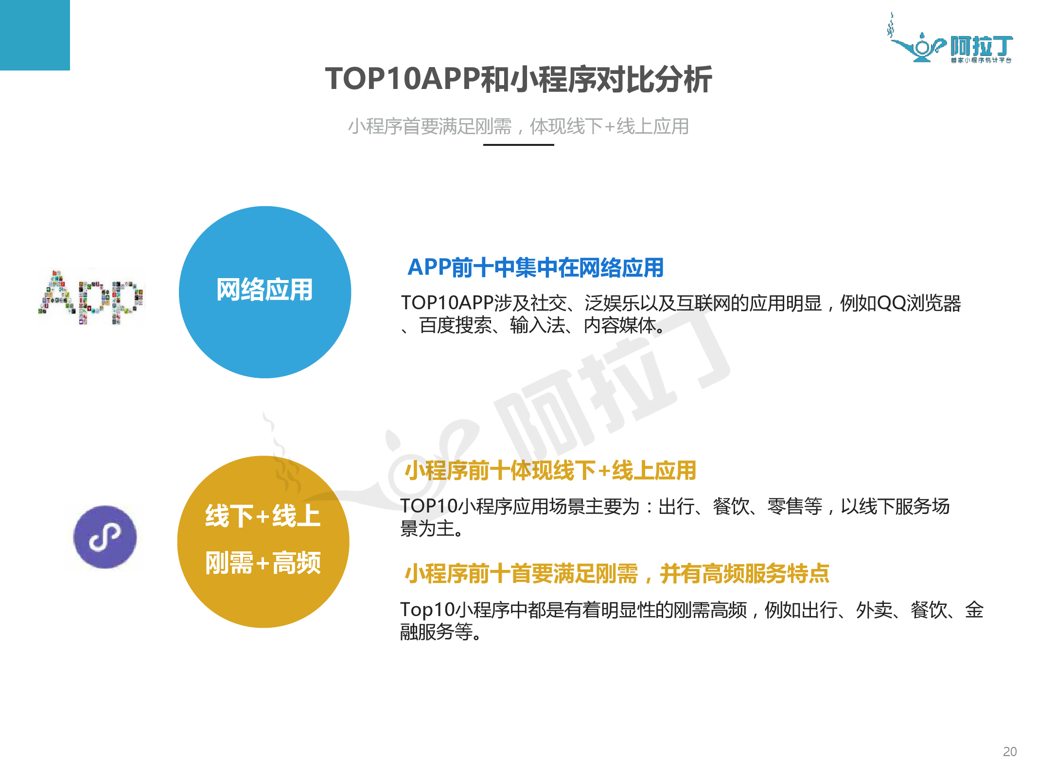 从阿拉丁发布的报告数据来看,微信小程序对于长尾、低频特征的应用上,可以替代原生APP这类载体。与此同时,APP生态中占据主导地位的高频和刚需类应用,在小程序生态同样表现活跃。