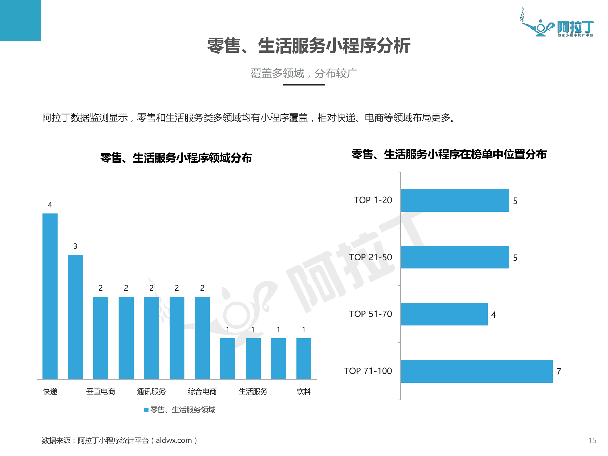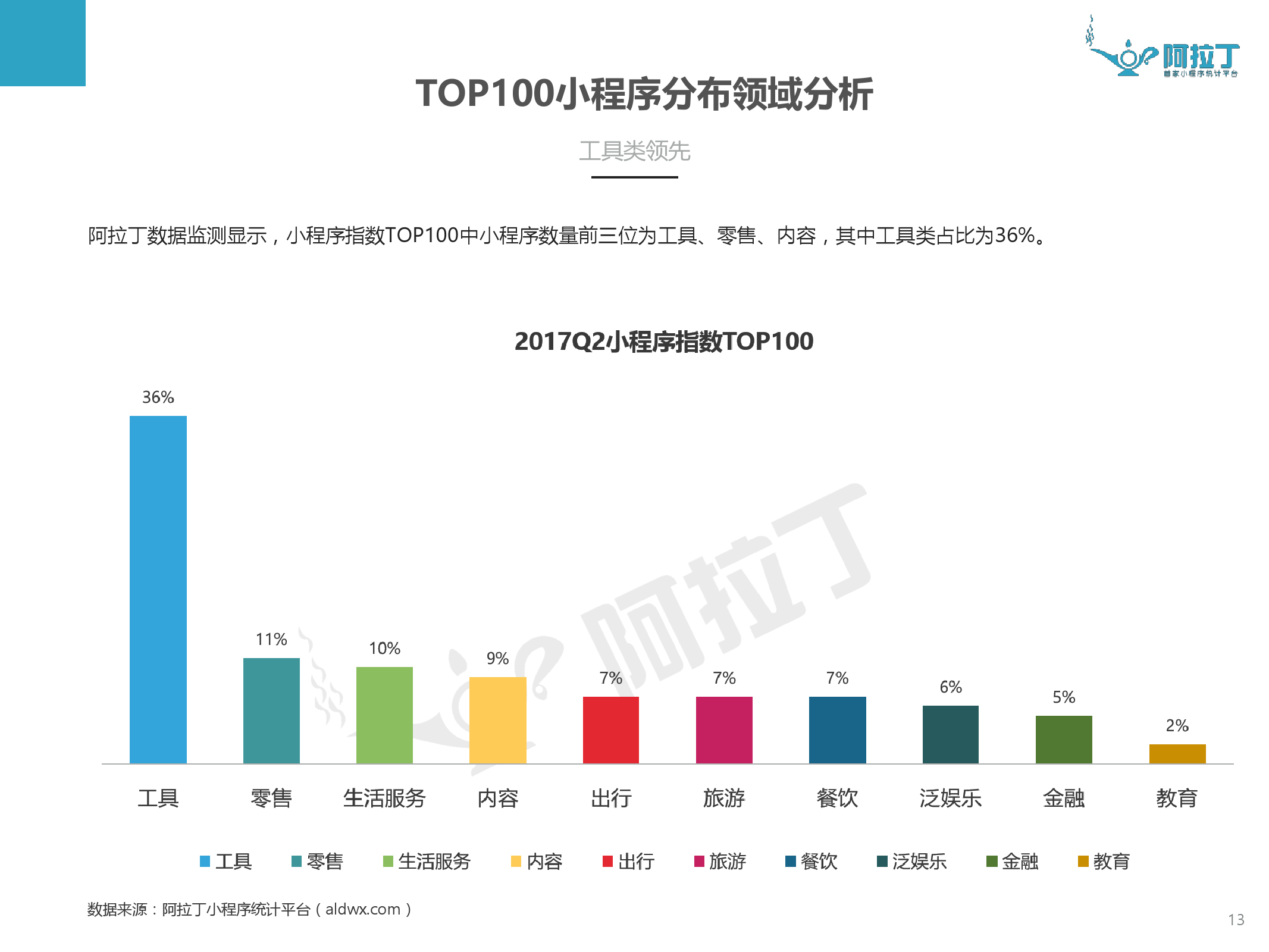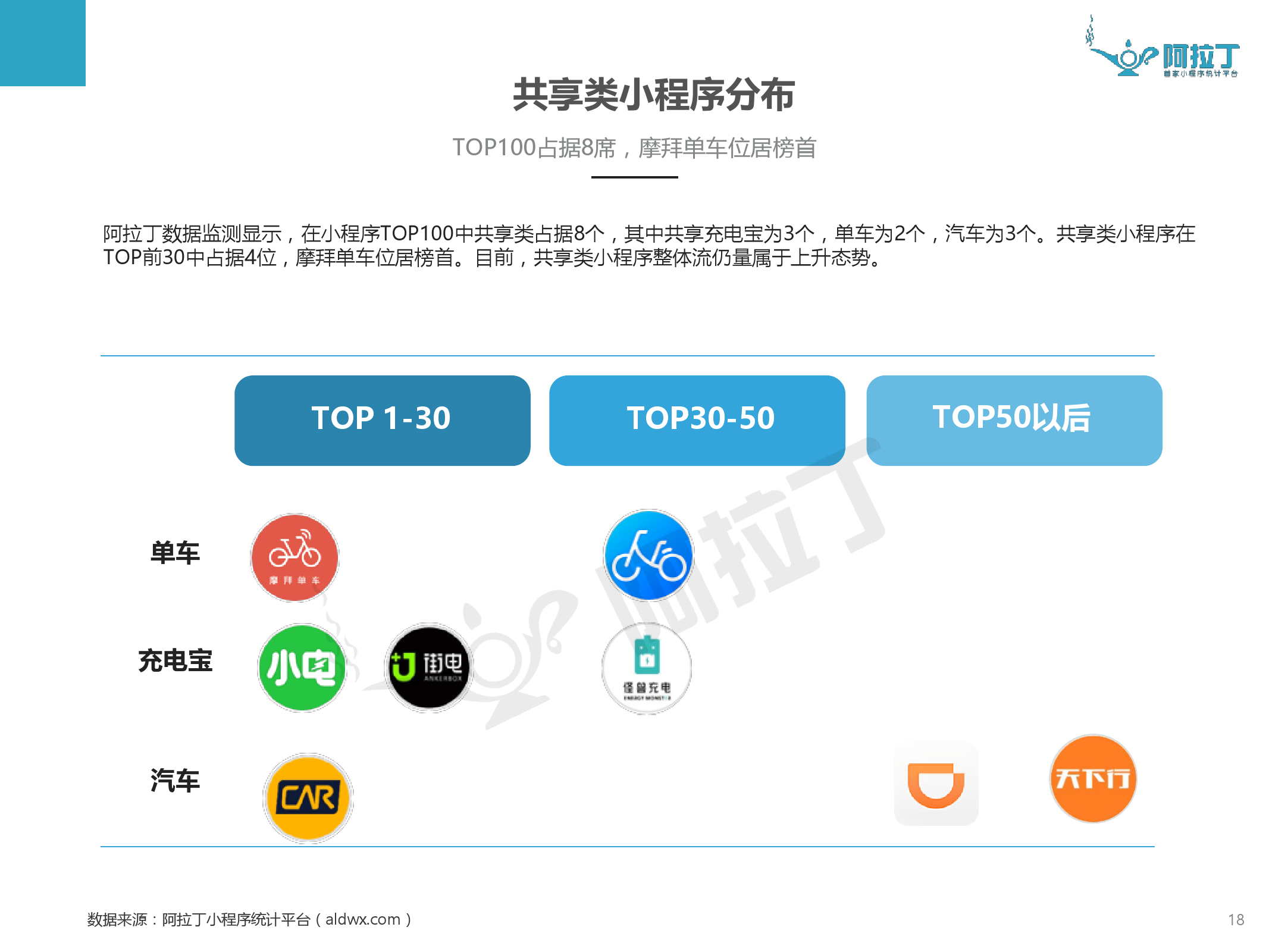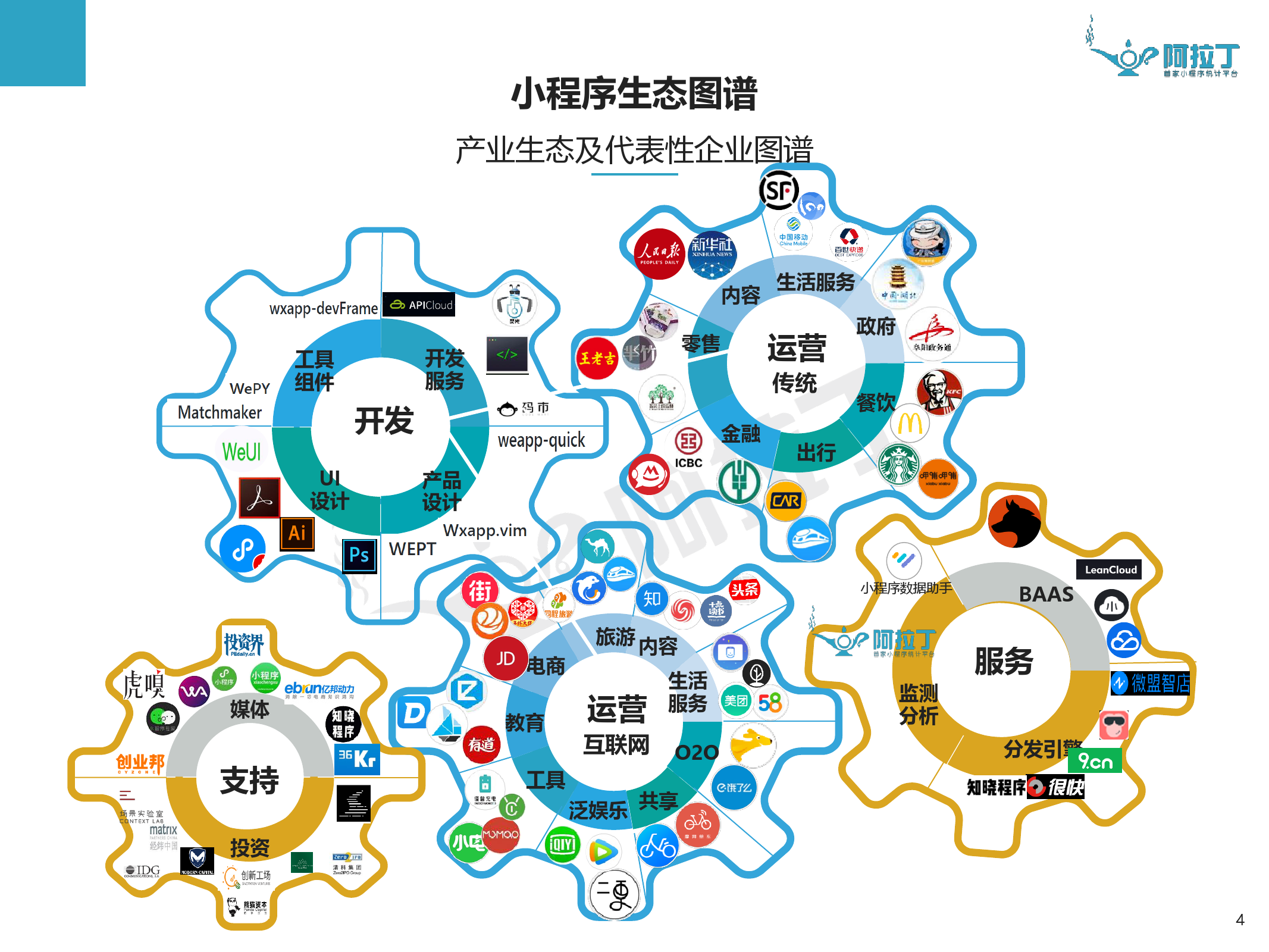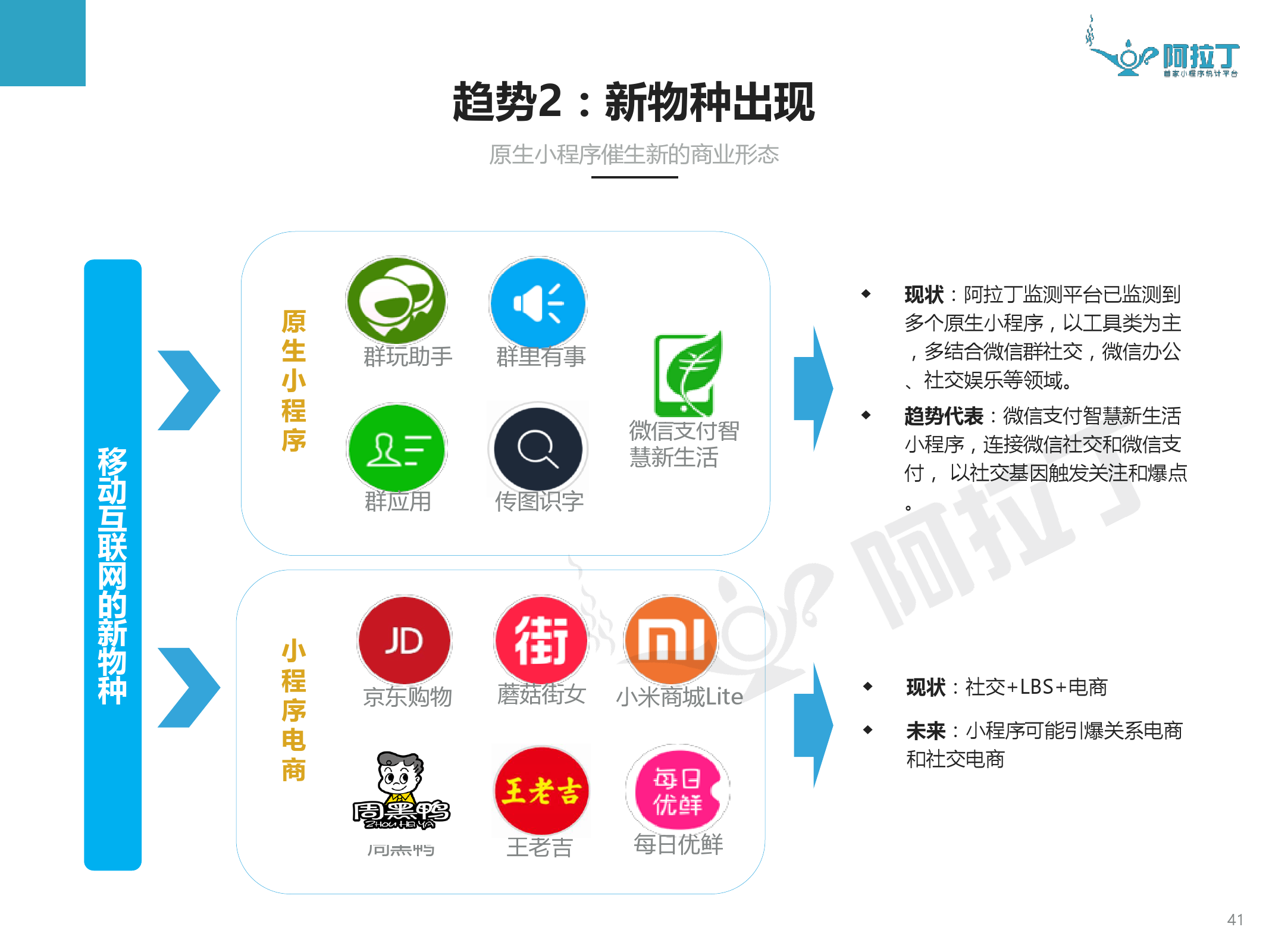 从阿拉丁发布的报告数据来看,微信小程序对于长尾、低频特征的应用上,可以替代原生APP这类载体。与此同时,APP生态中占据主导地位的高频和刚需类应用,在小程序生态同样表现活跃。