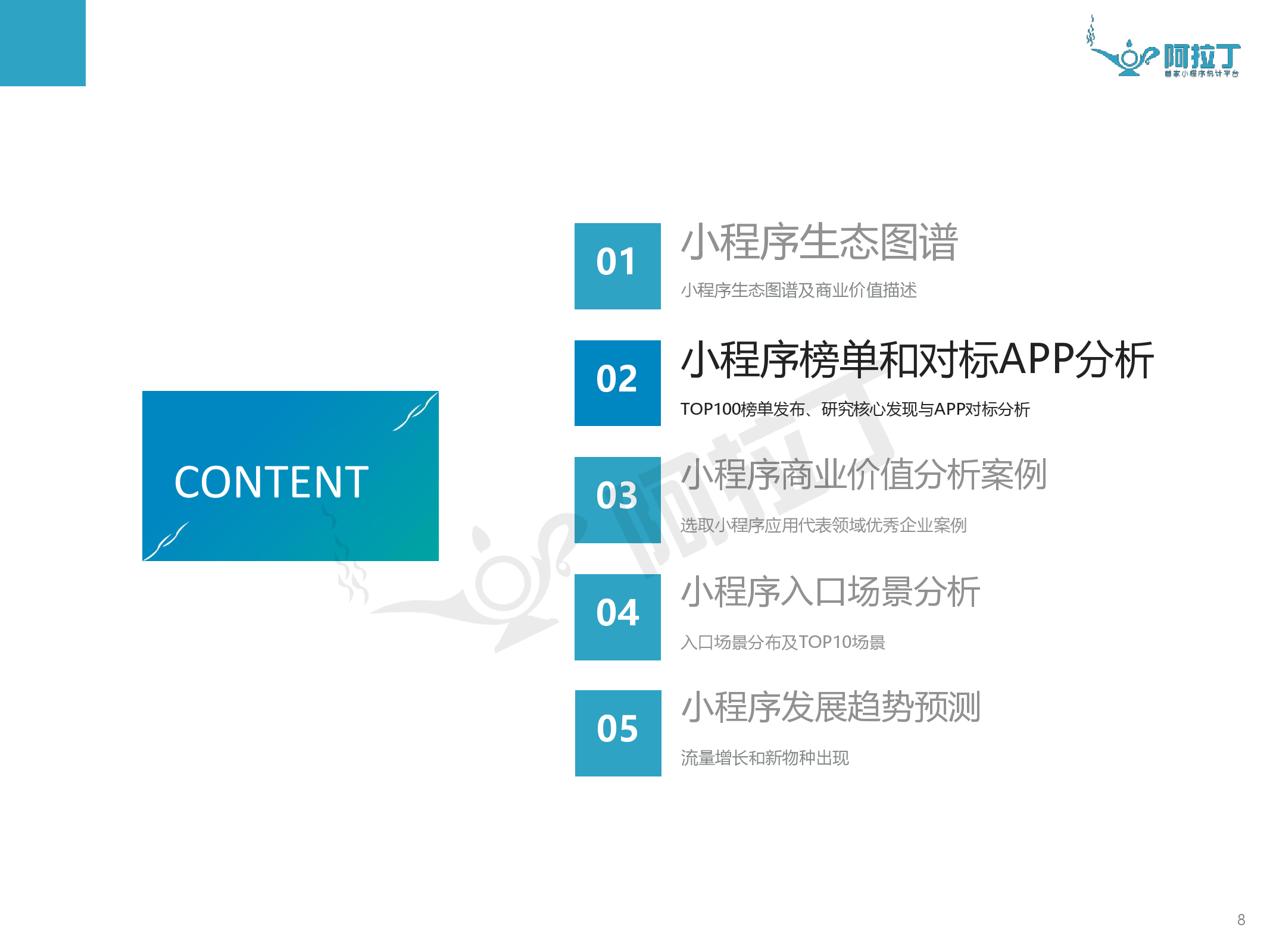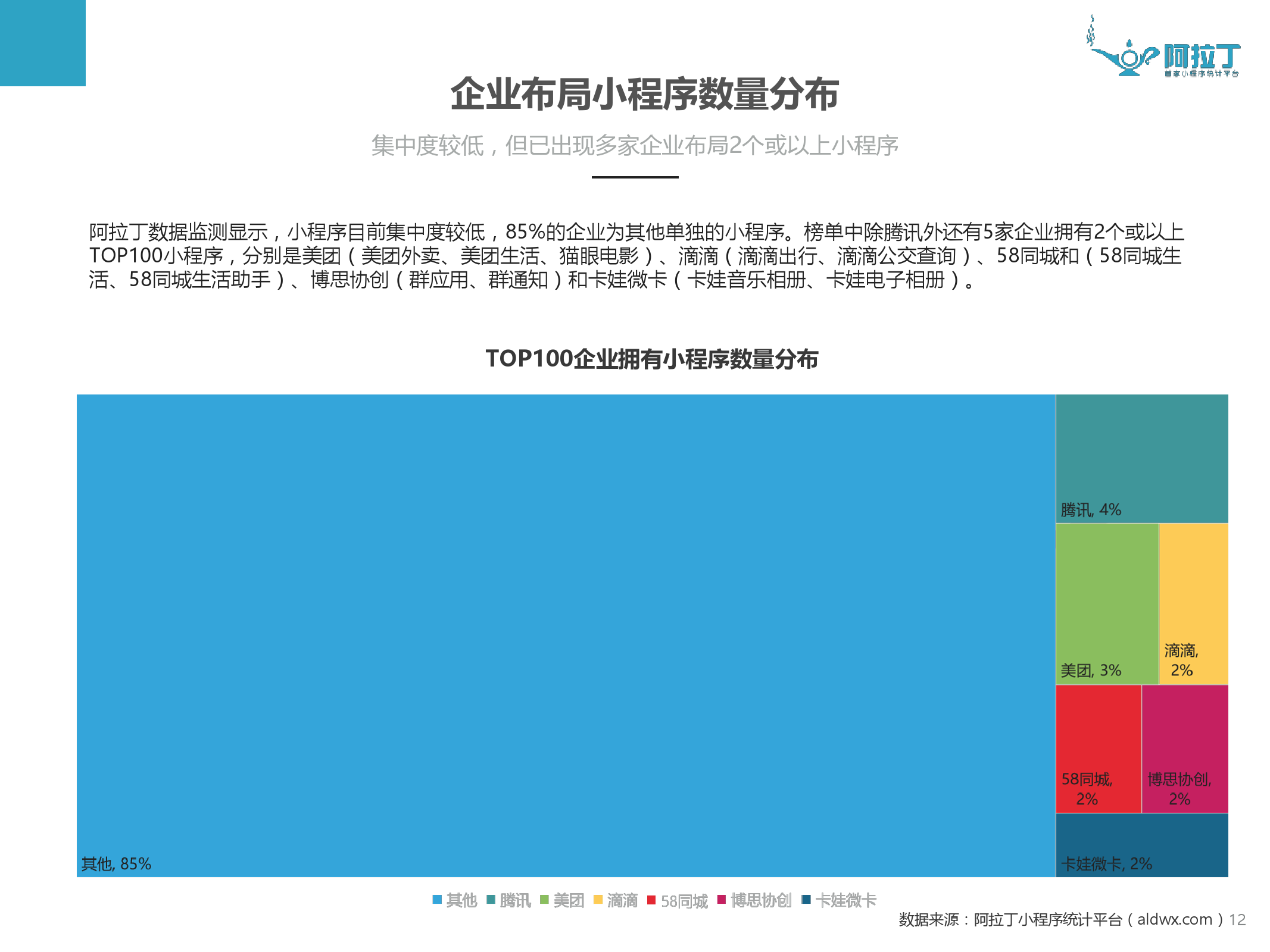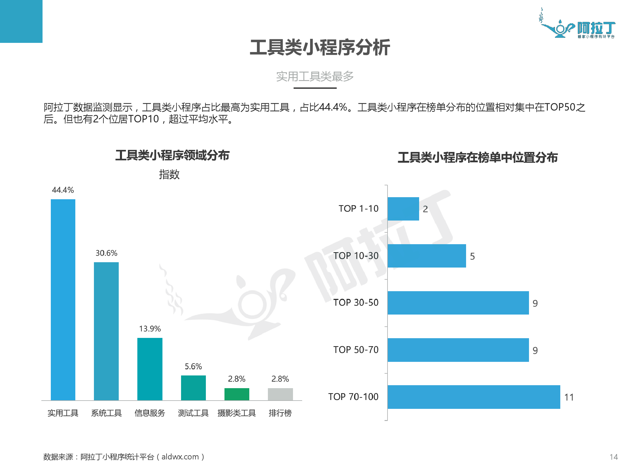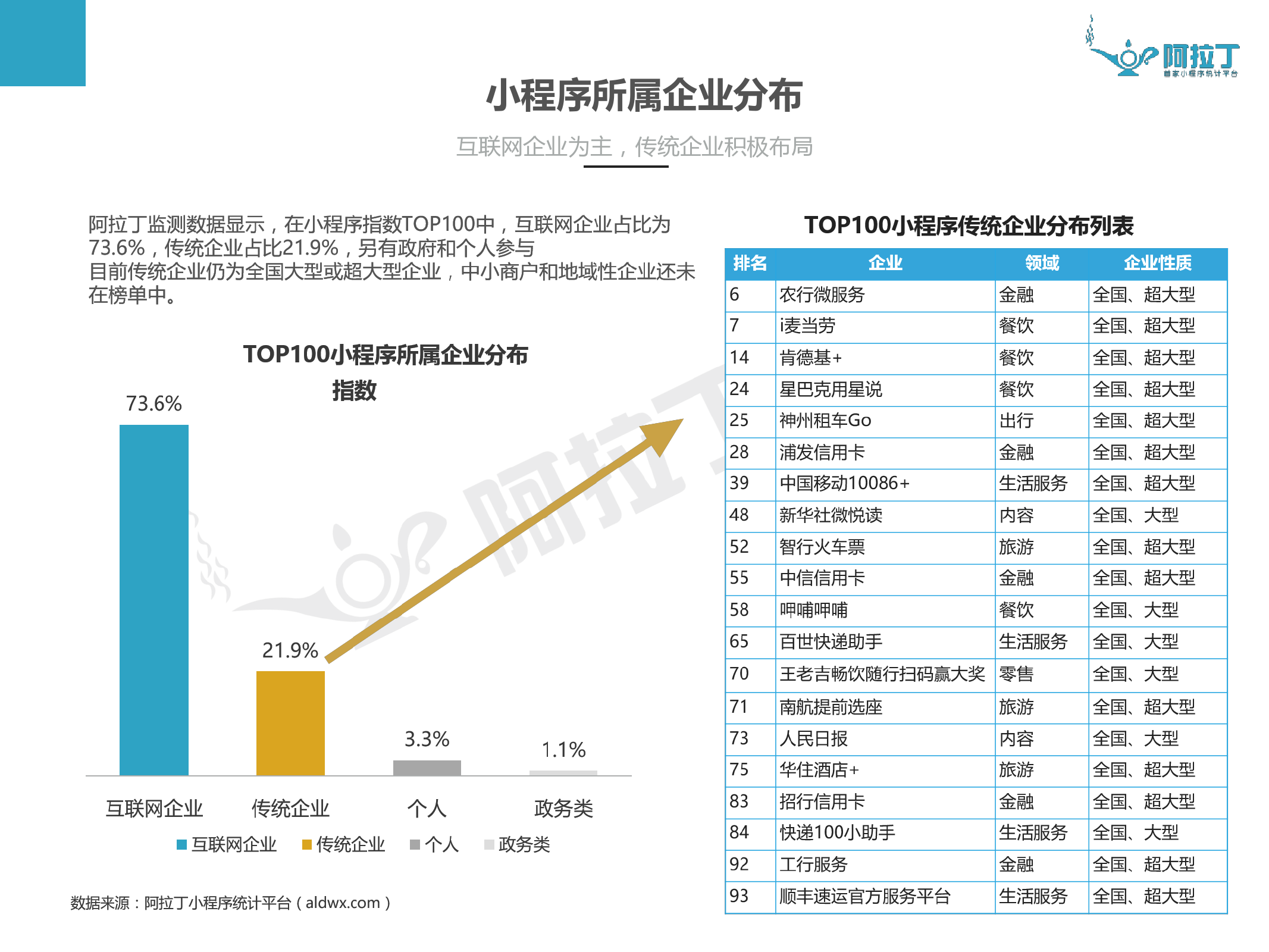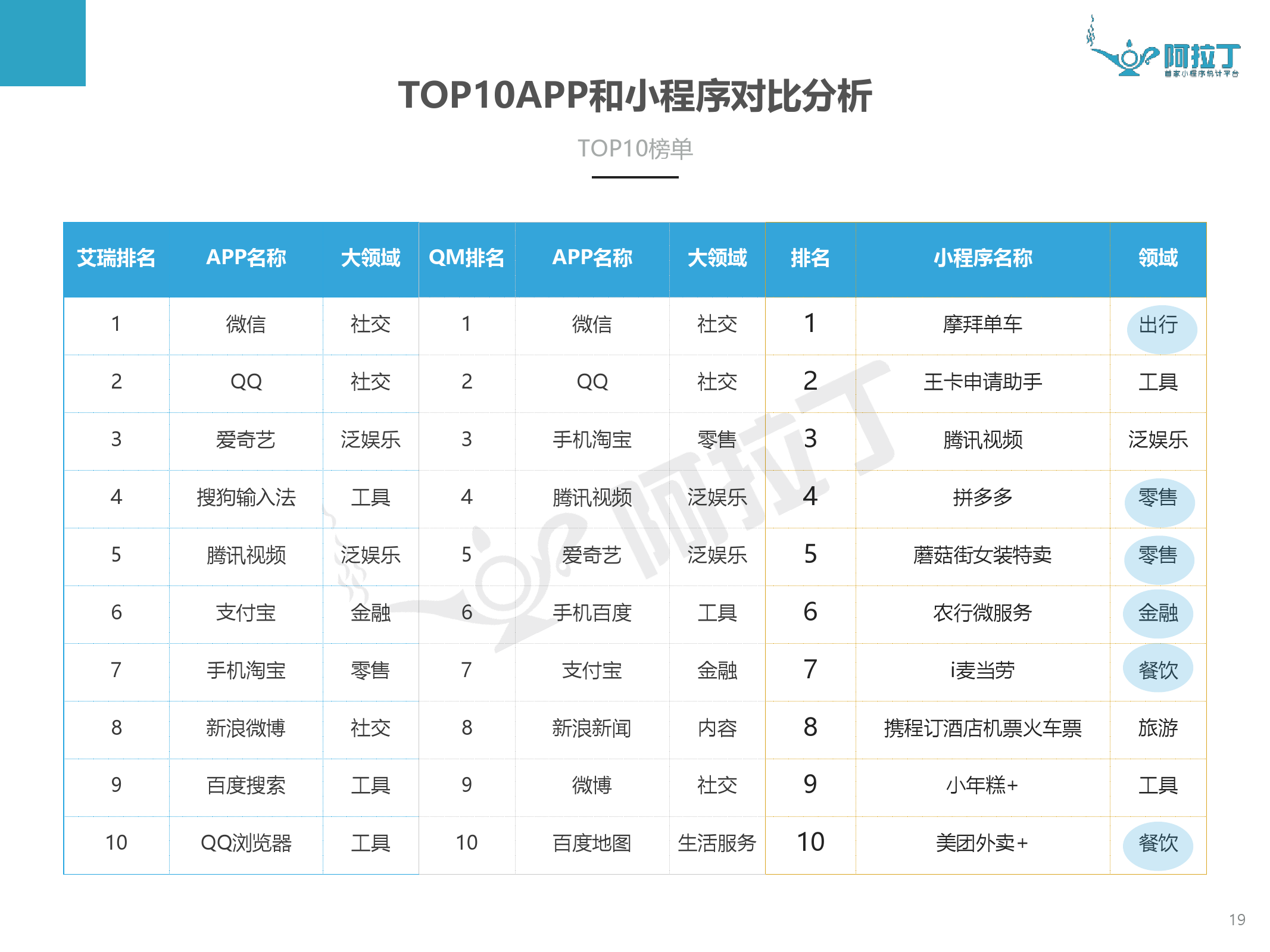 从阿拉丁发布的报告数据来看,微信小程序对于长尾、低频特征的应用上,可以替代原生APP这类载体。与此同时,APP生态中占据主导地位的高频和刚需类应用,在小程序生态同样表现活跃。