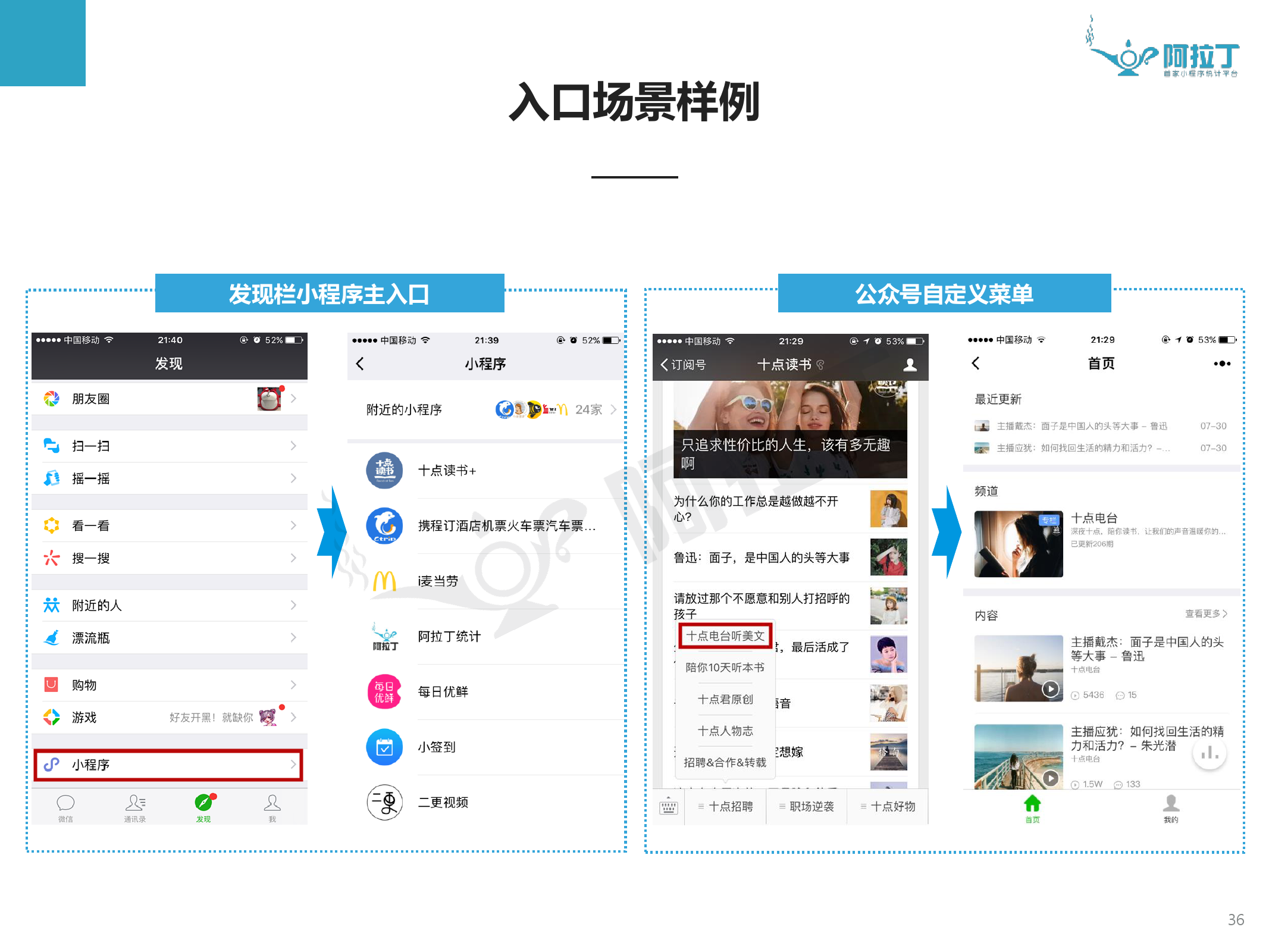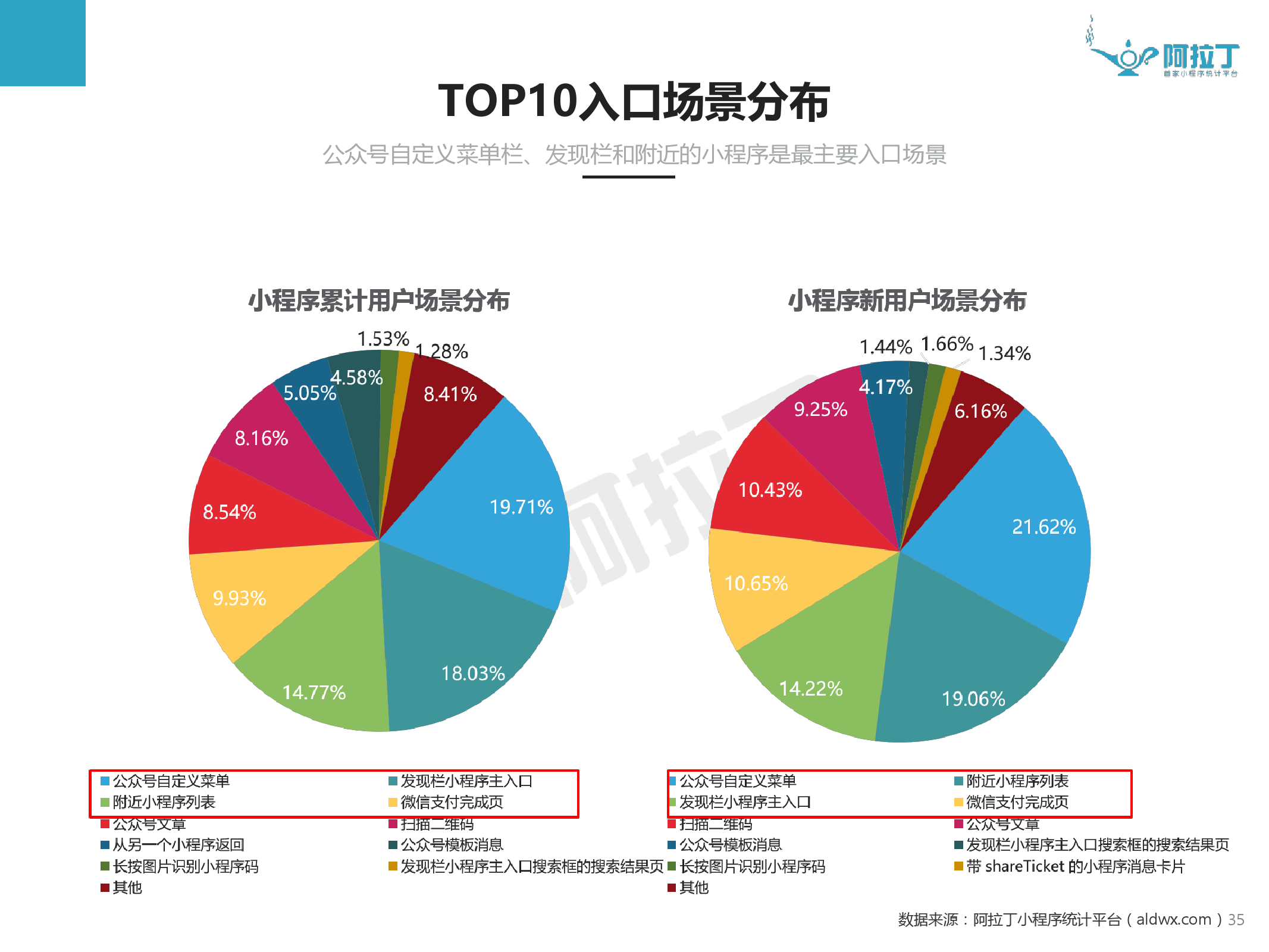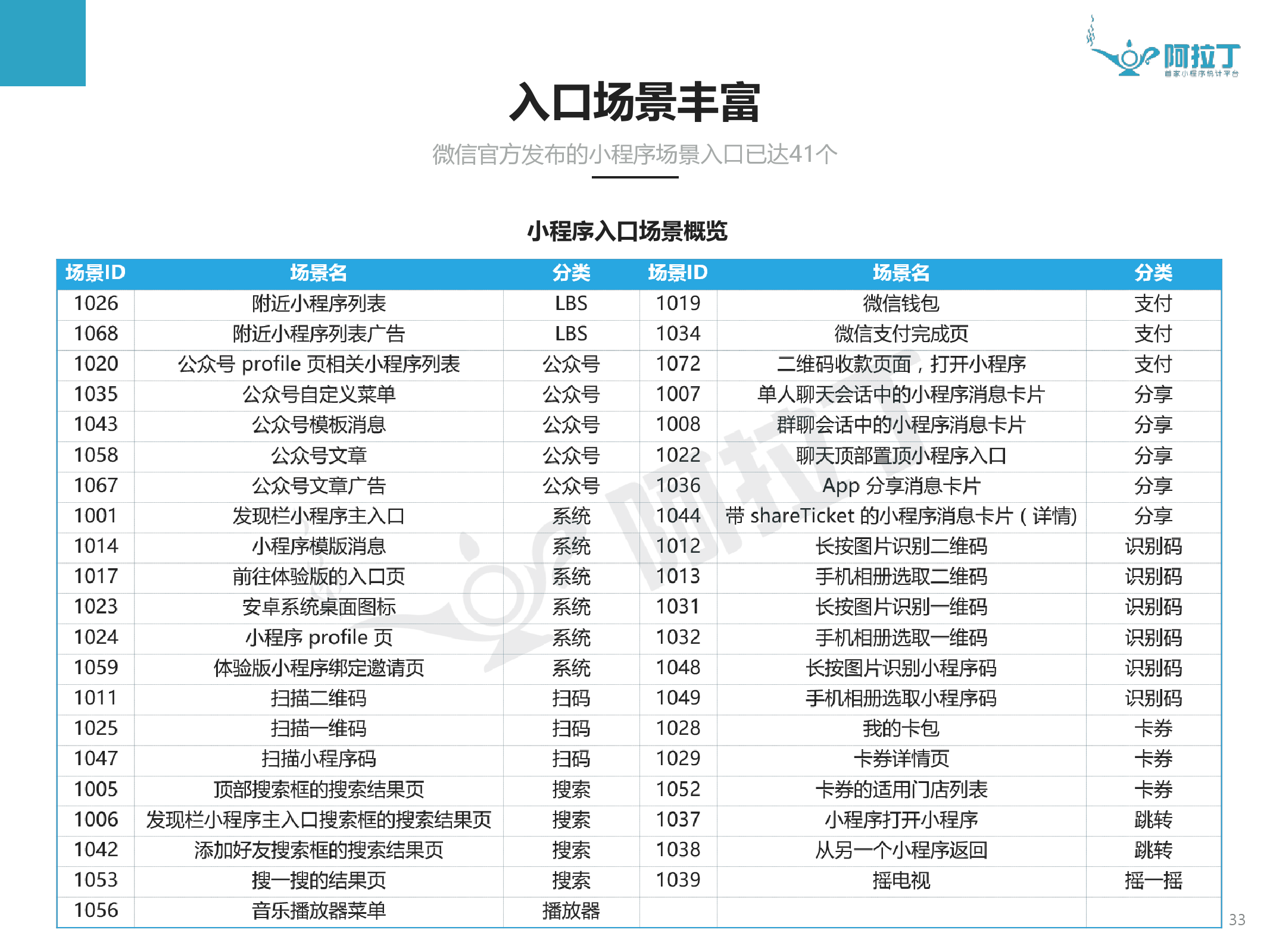 不过据阿拉丁统计,目前微信小程序的入口,包括微信群、朋友圈、搜一搜、看一看、订阅号在内,已经多达到41个。