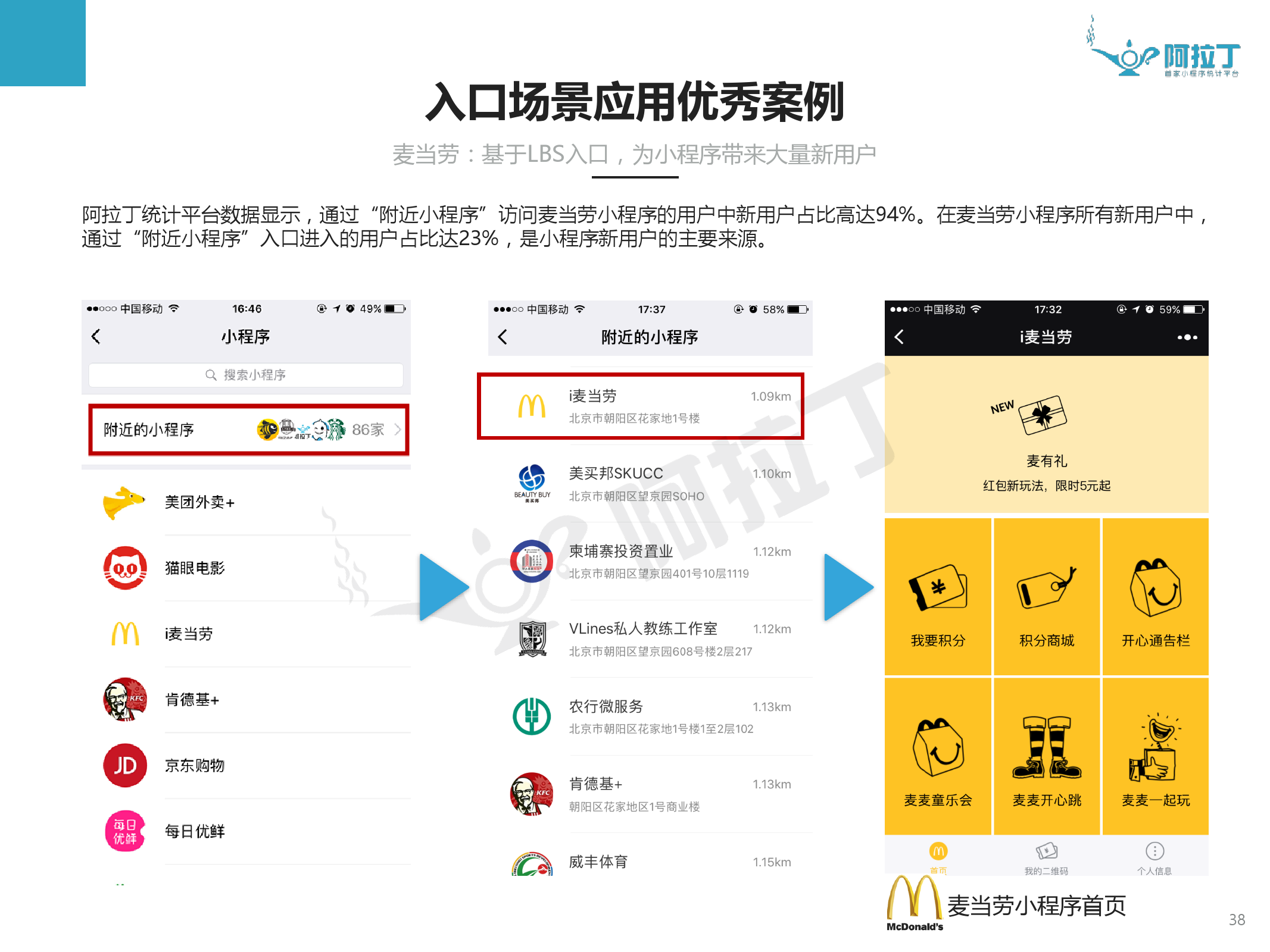 在APP生态内,相对而言来自传统产业的开发者缺乏动力,但这种状况在小程序生态却出现了反转。以麦当劳为例,在所有新增用户中,通过“附近的小程序”入口进入的比例达到23%,贡献了主要新增流量。