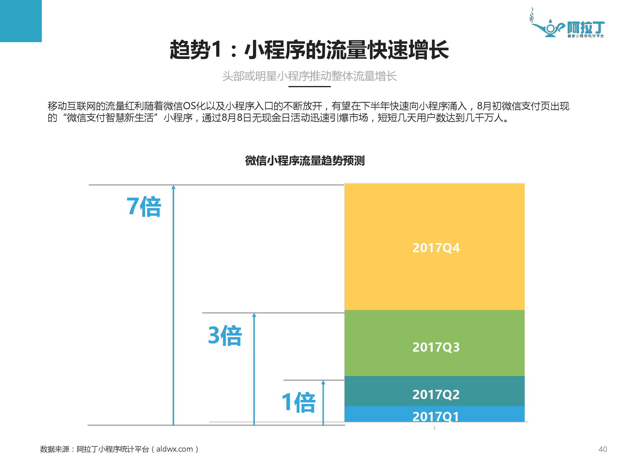 小程序统计平台阿拉丁发布Q2季度微信小程序报告,目前该平台已经汇集1万名开发者。根据该平台监测的数据显示,相对于Q2时期小程序增长陷入短暂凝滞,受微信不断开放入口及流量政策影响,今年下半年小程序将迎来爆发期,Q3季度流量数字获得三倍于Q1。