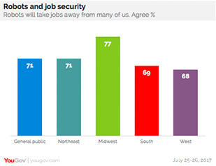 YouGov 的最新调查发现,71%的美国人认为机器人将会剥夺工作机会,但是,66%的受访者认为机器不会做的比自己更好。