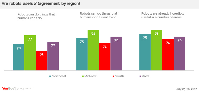 70%的美国人认为机器人可以做人类不能做的事情,而且中西部人对这一想法也更强烈(77%)。3/4的美国人认为机器人可以做人类不想做的事情,中西部地区同意这一观点的人也更多(81%)。最后,大多数美国人承认,机器人在许多领域已经非常有用,中西部地区的人们仍然比其他地区更强烈地这么认为(81%)。