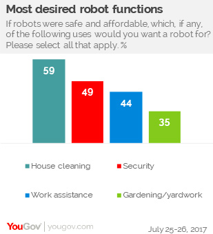 59%的美国人欢迎机器人帮忙打扫房间,44%的美国人希望机器人协助自己的工作,例如检索或拿重的东西。