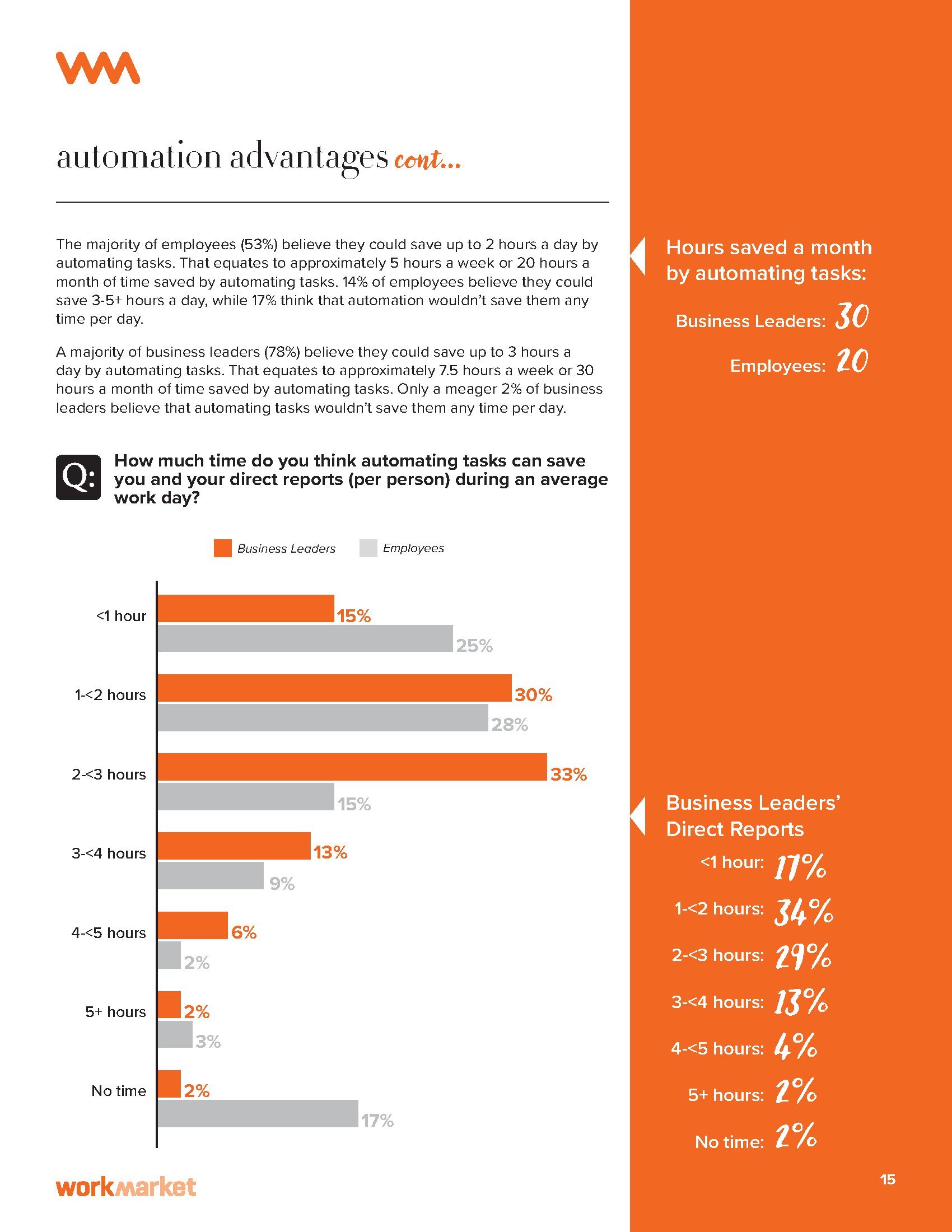 53%的员工认为通过自动化每个工作日可以节省2个小时,相当于每个月20个小时。