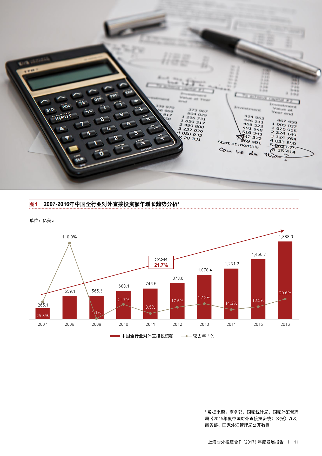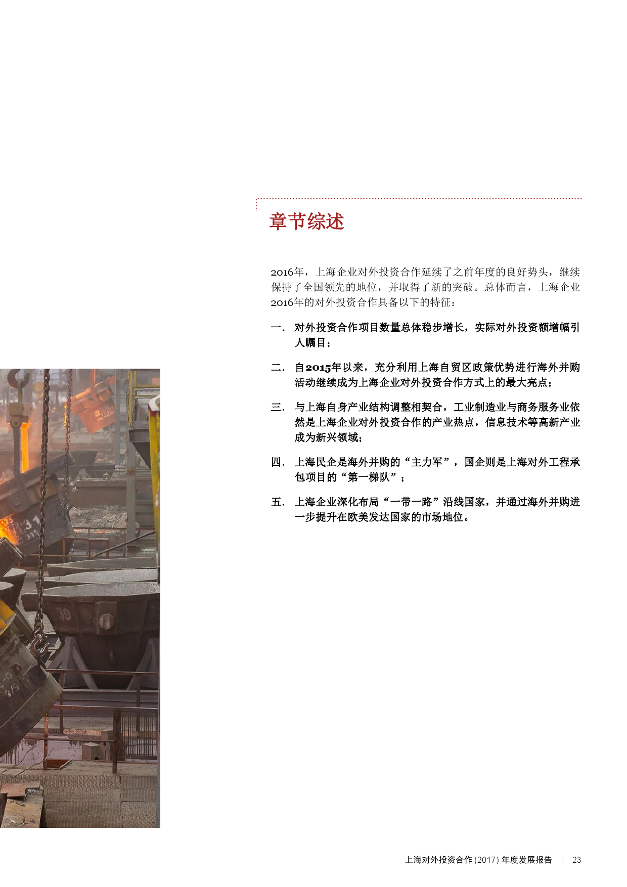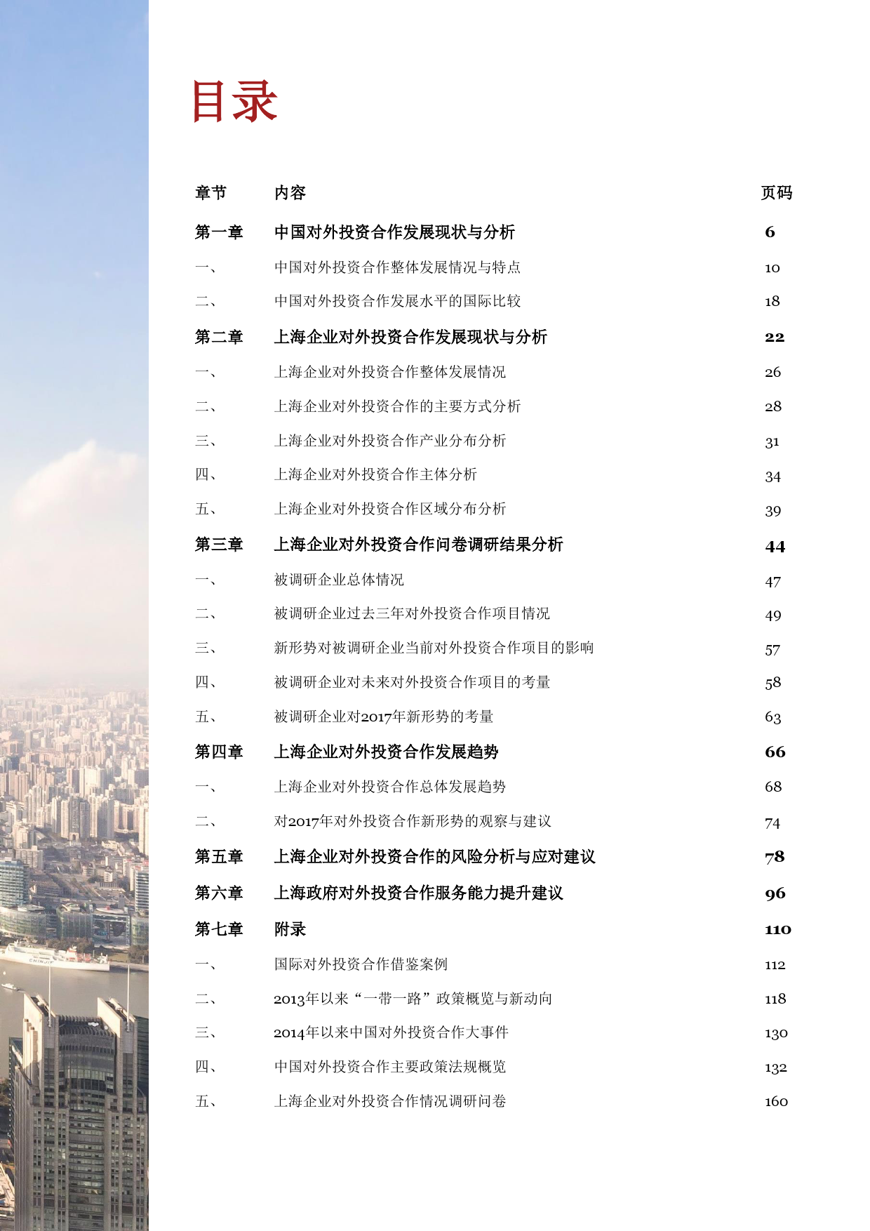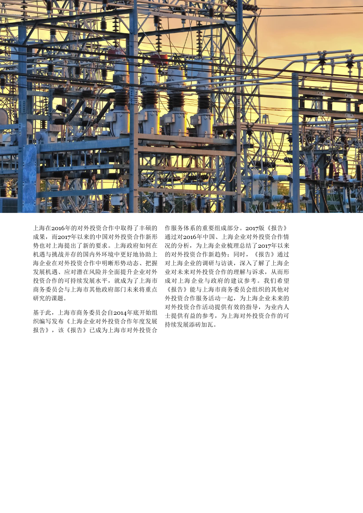 基于此,上海市商务委员会自2014年底开始组织编写发布《上海企业对外投资合作年度发展报告》,该《报告》已成为上海市对外投资合作服务体系的重要组成部分。2017版《报告》通过对2016年中国、上海企业对外投资合作情况的分析,为上海企业梳理总结了2017年以来的对外投资合作新趋势;同时,《报告》通过对上海企业的调研与访谈,深入了解了上海企业对未来对外投资合作的理解与诉求,从而形成对上海企业与政府的建议参考。我们希望《报告》能与上海市商务委员会组织的其他对外投资合作服务活动一起,为上海企业未来的对外投资合作活动提供有效的指导,为业内人士提供有益的参考,为上海对外投资合作的可持续发展添砖加瓦。