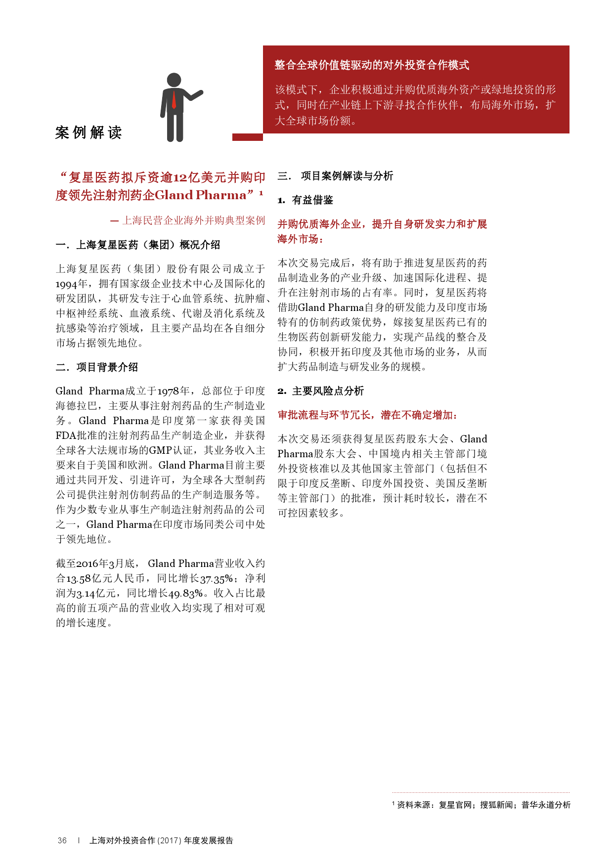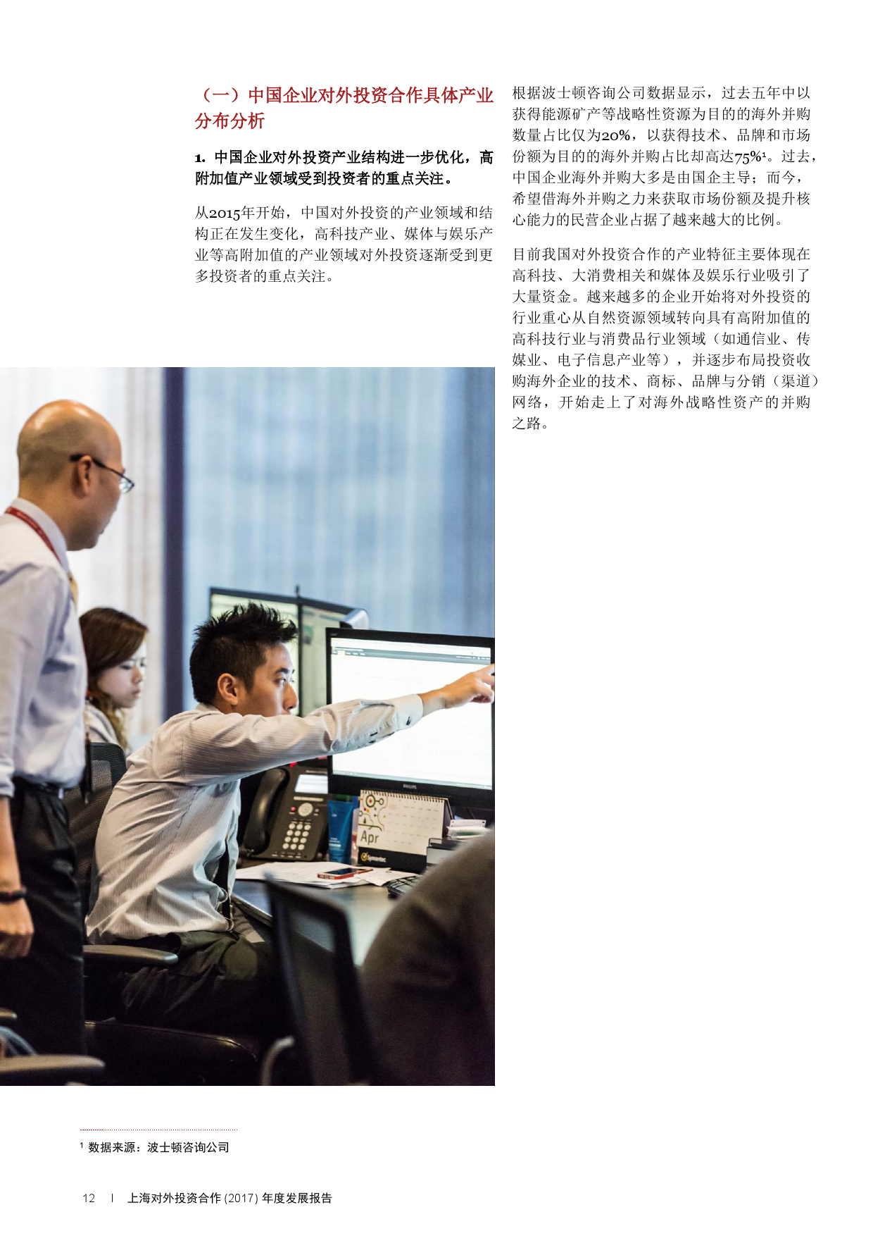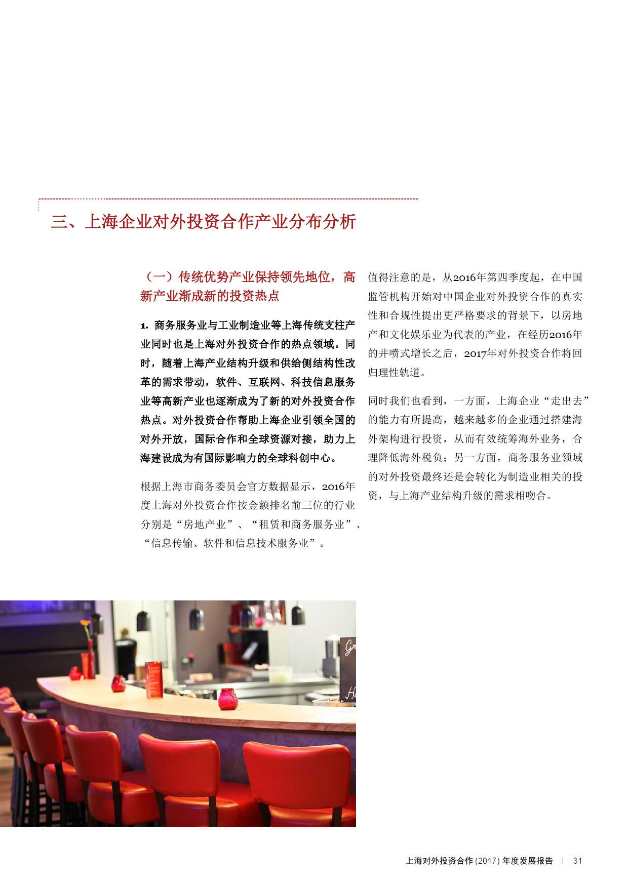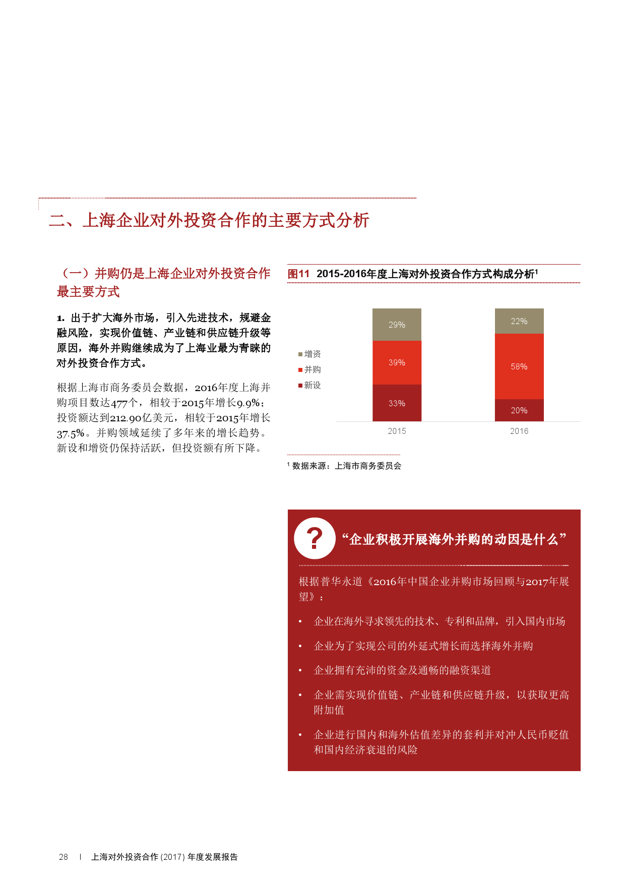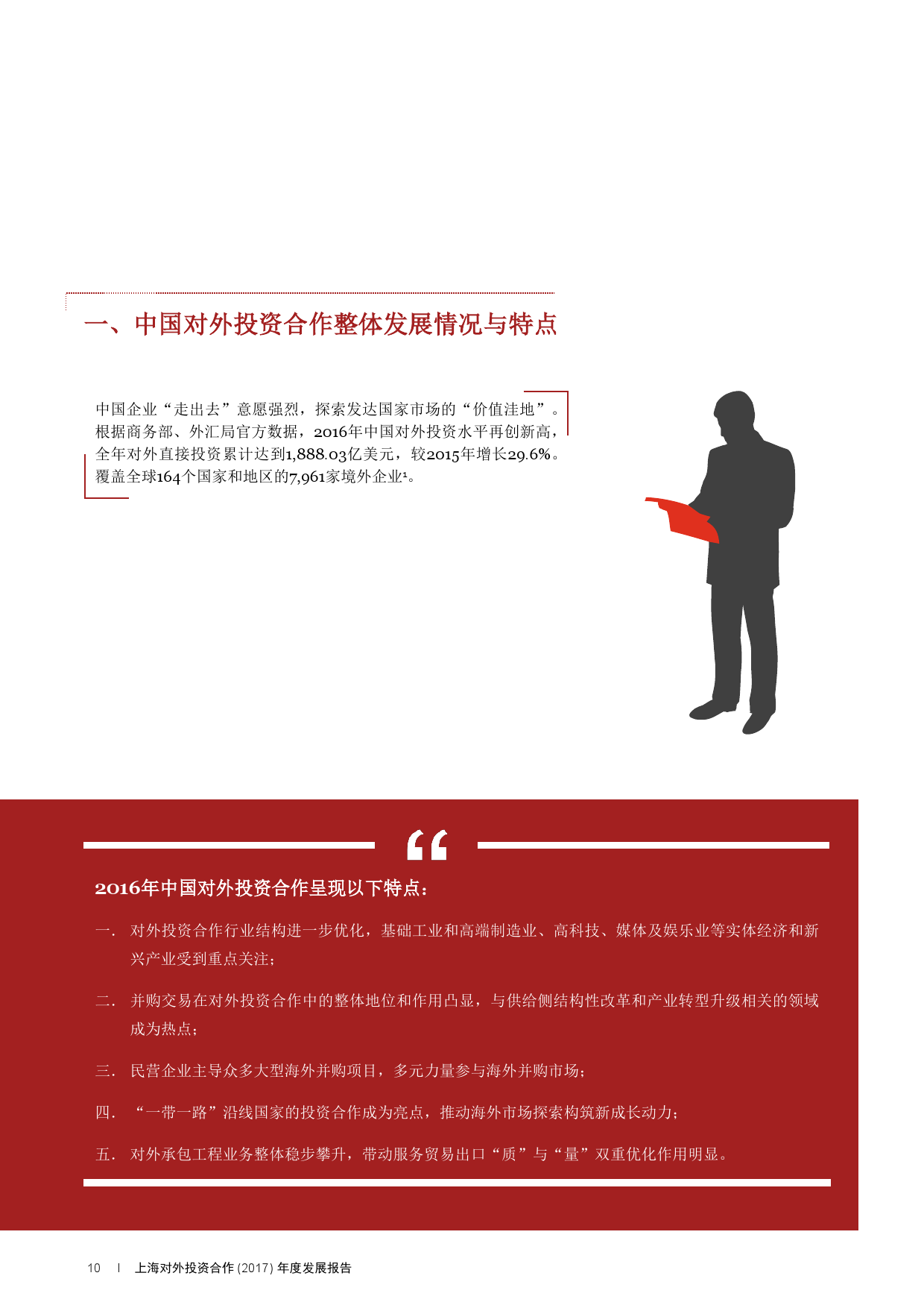 基于此,上海市商务委员会自2014年底开始组织编写发布《上海企业对外投资合作年度发展报告》,该《报告》已成为上海市对外投资合作服务体系的重要组成部分。2017版《报告》通过对2016年中国、上海企业对外投资合作情况的分析,为上海企业梳理总结了2017年以来的对外投资合作新趋势;同时,《报告》通过对上海企业的调研与访谈,深入了解了上海企业对未来对外投资合作的理解与诉求,从而形成对上海企业与政府的建议参考。我们希望《报告》能与上海市商务委员会组织的其他对外投资合作服务活动一起,为上海企业未来的对外投资合作活动提供有效的指导,为业内人士提供有益的参考,为上海对外投资合作的可持续发展添砖加瓦。