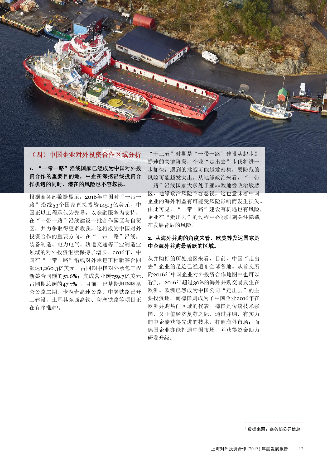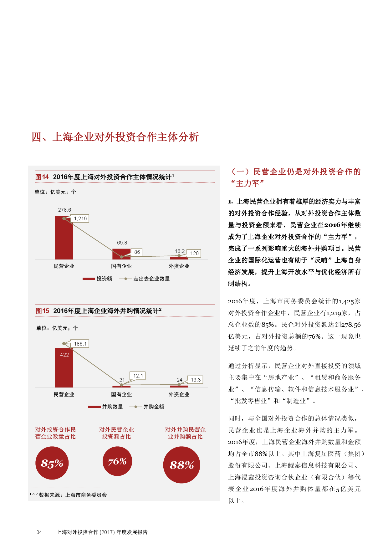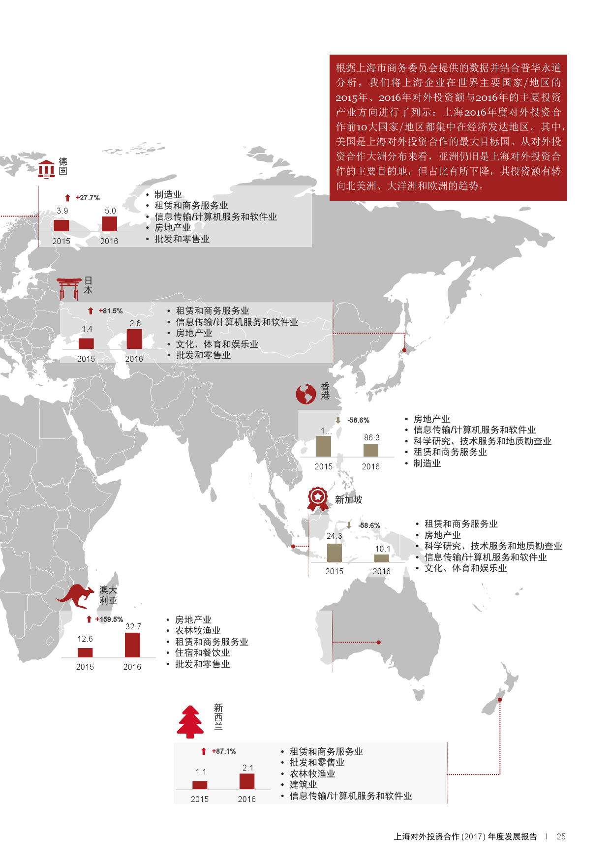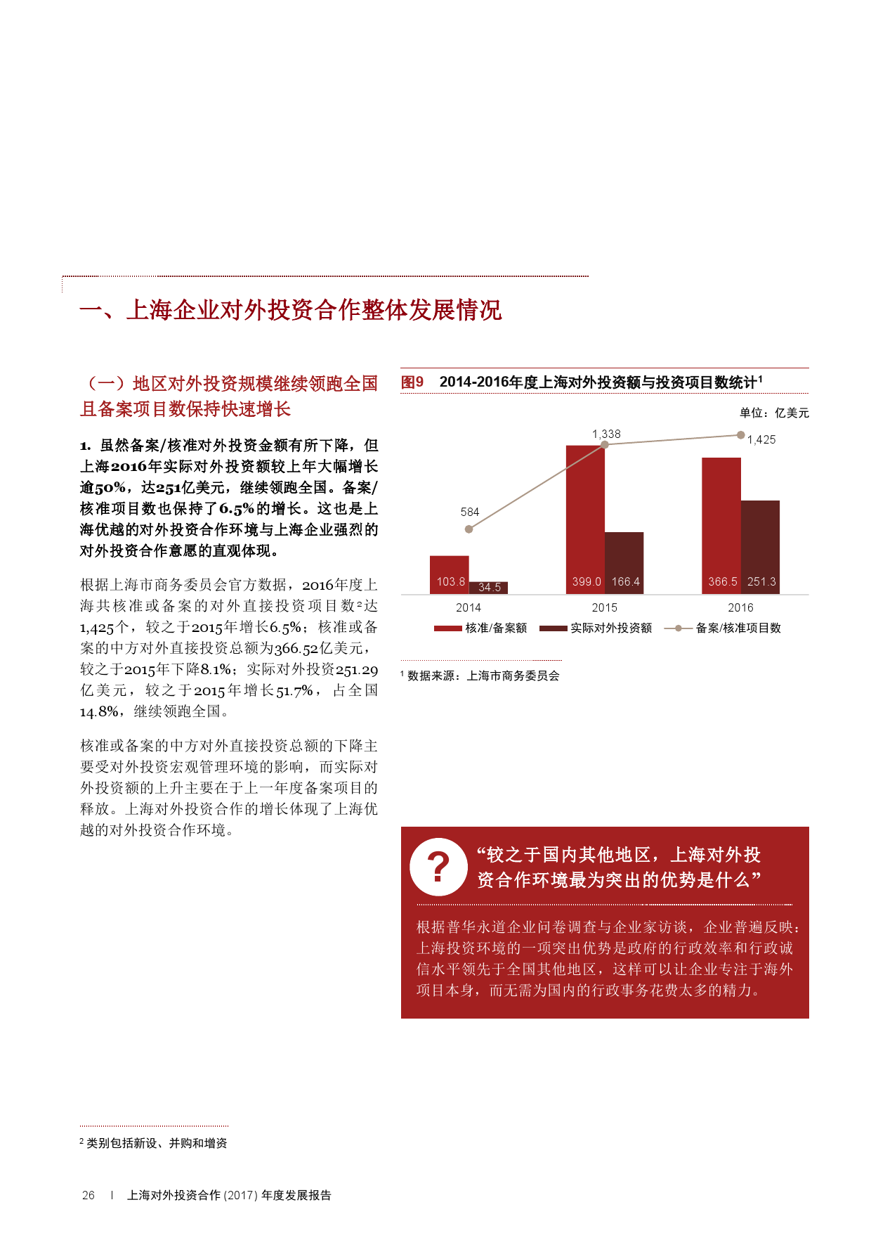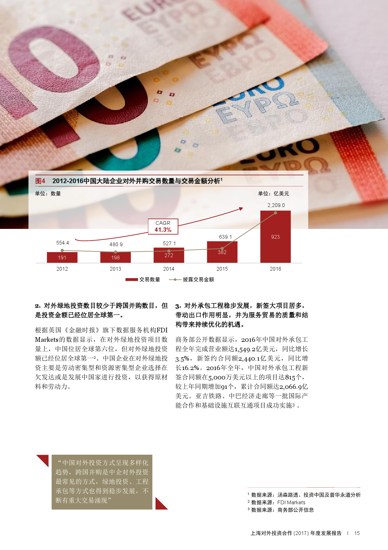 上海在2016年的对外投资合作中取得了丰硕的成果,而2017年以来的中国对外投资合作新形势也对上海提出了新的要求。上海政府如何在机遇与挑战并存的国内外环境中更好地协助上海企业在对外投资合作中明晰形势动态、把握发展机遇、应对潜在风险并全面提升企业对外投资合作的可持续发展水平,就成为了上海市商务委员会与上海市其他政府部门未来将重点研究的课题。