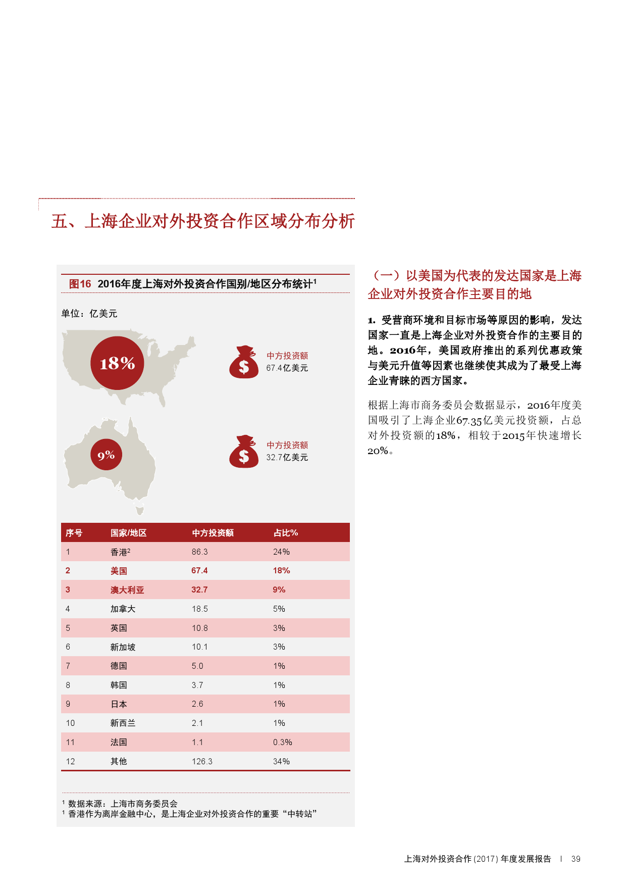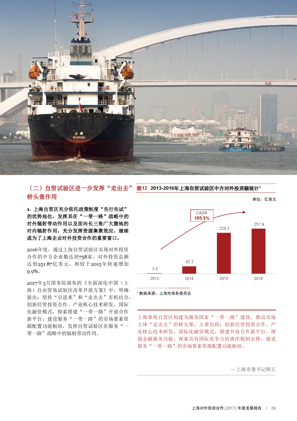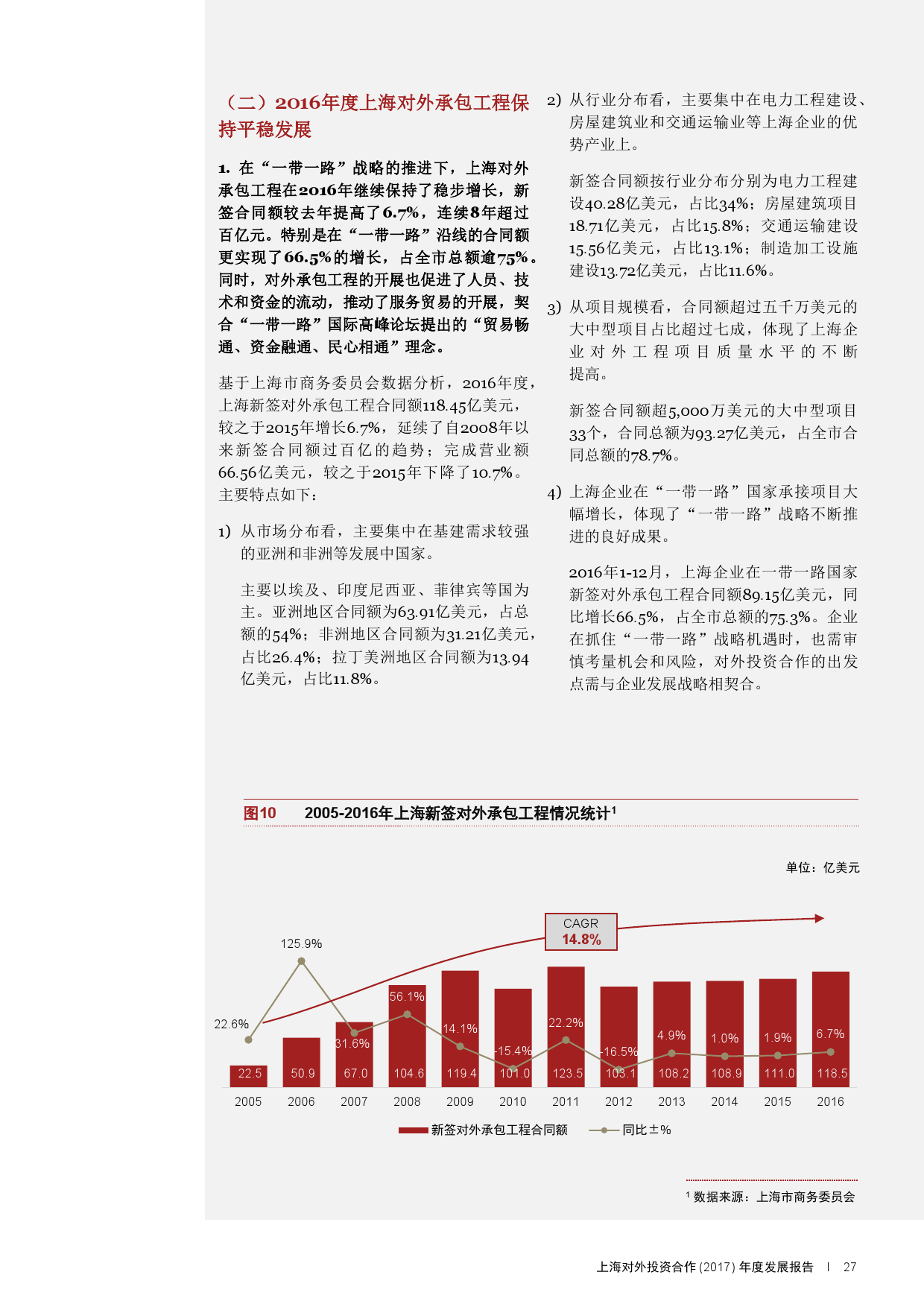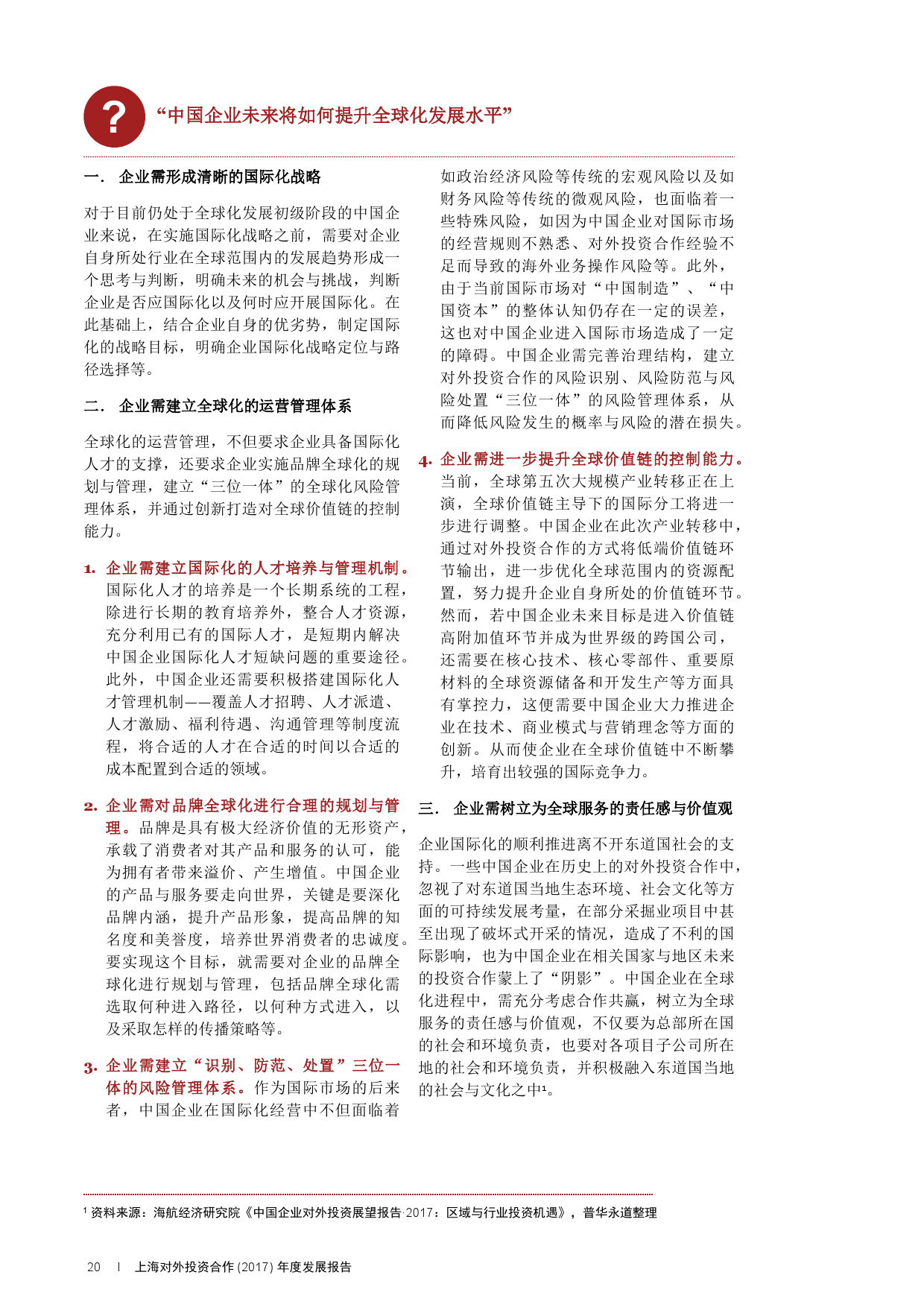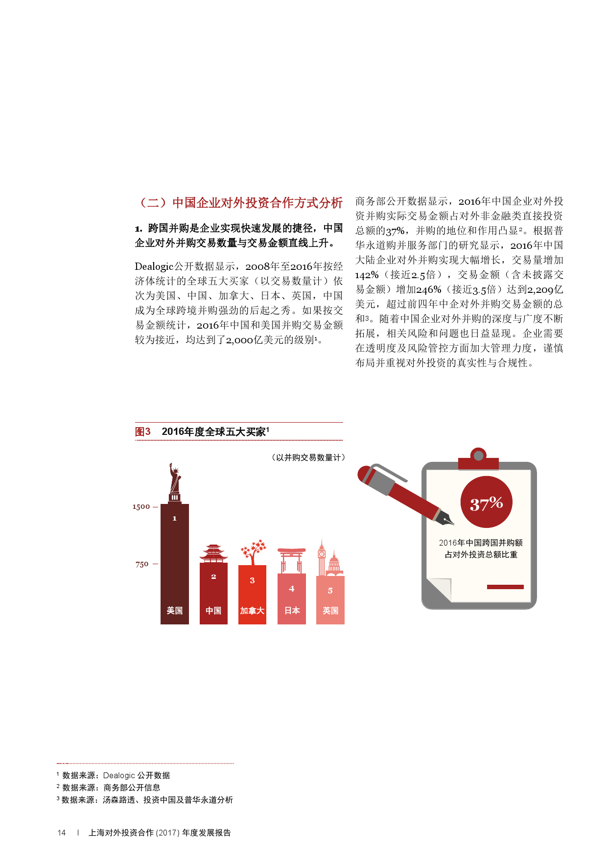 上海在2016年的对外投资合作中取得了丰硕的成果,而2017年以来的中国对外投资合作新形势也对上海提出了新的要求。上海政府如何在机遇与挑战并存的国内外环境中更好地协助上海企业在对外投资合作中明晰形势动态、把握发展机遇、应对潜在风险并全面提升企业对外投资合作的可持续发展水平,就成为了上海市商务委员会与上海市其他政府部门未来将重点研究的课题。