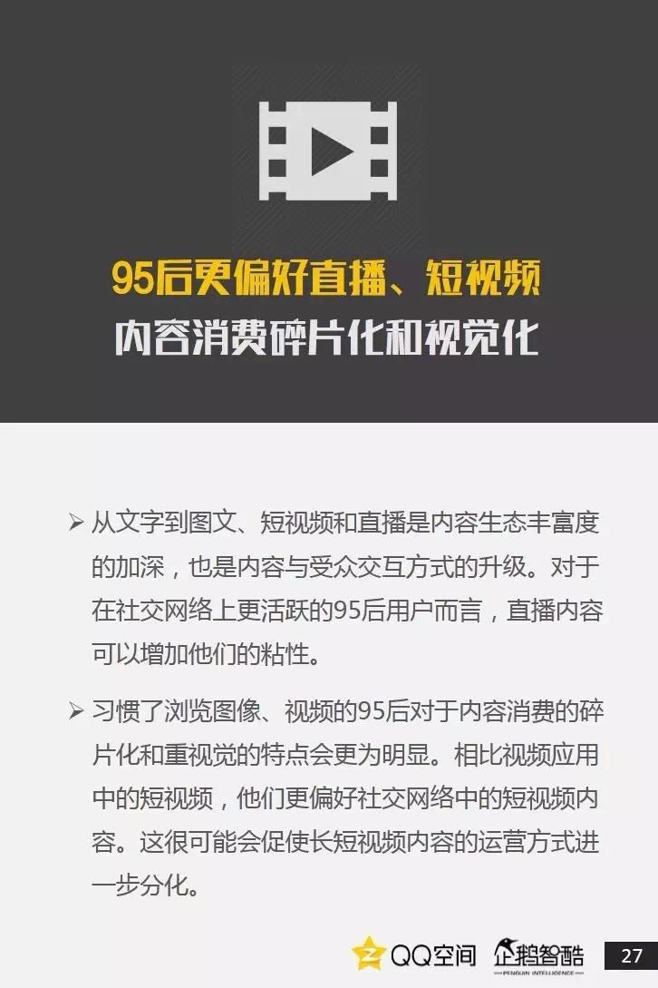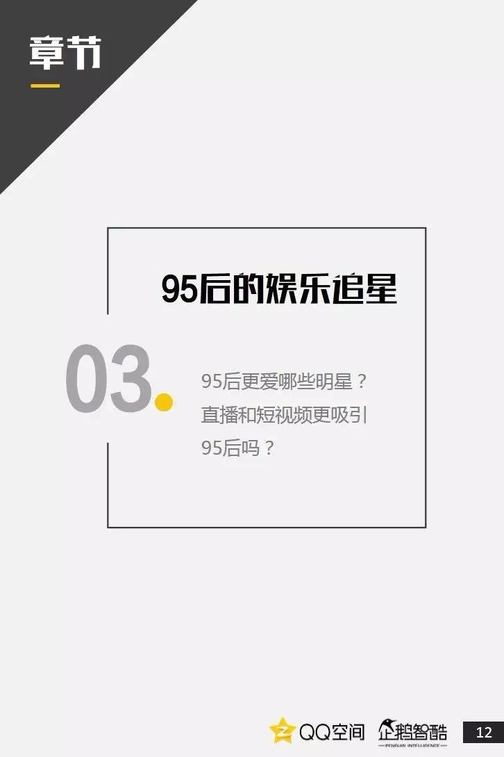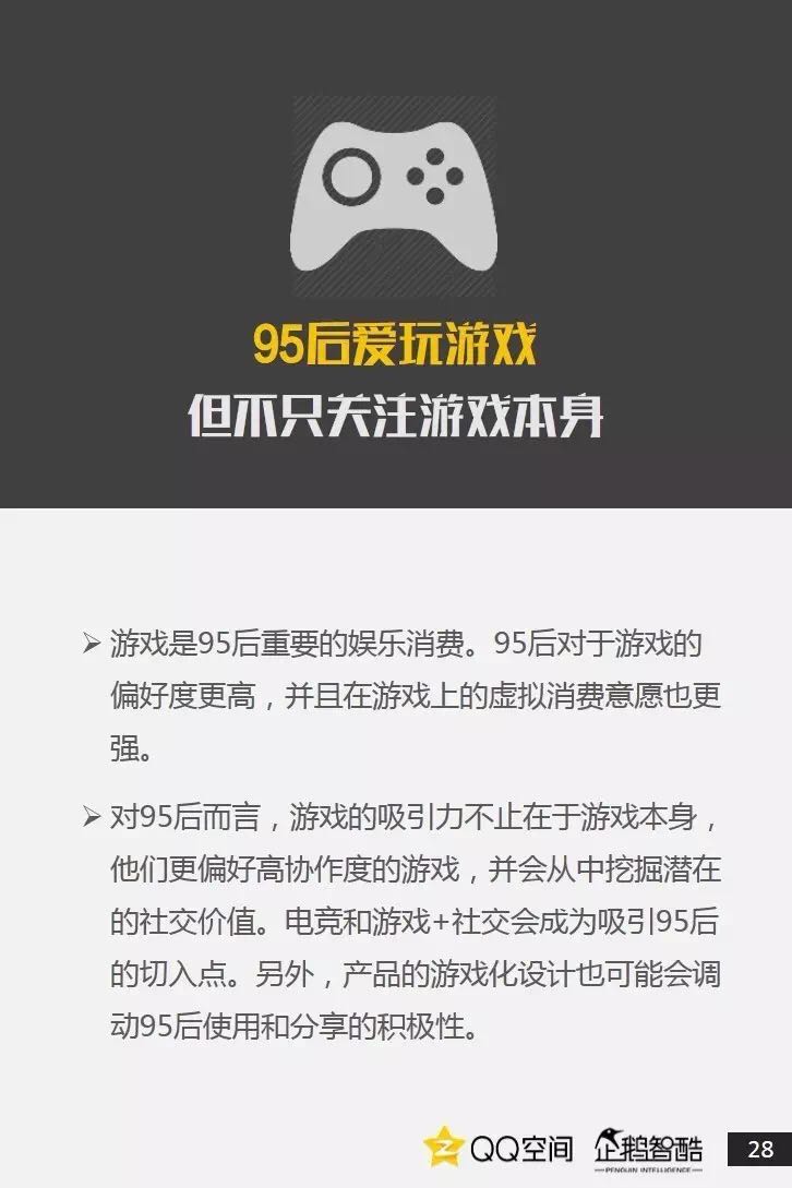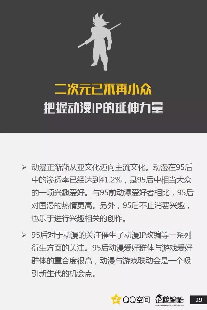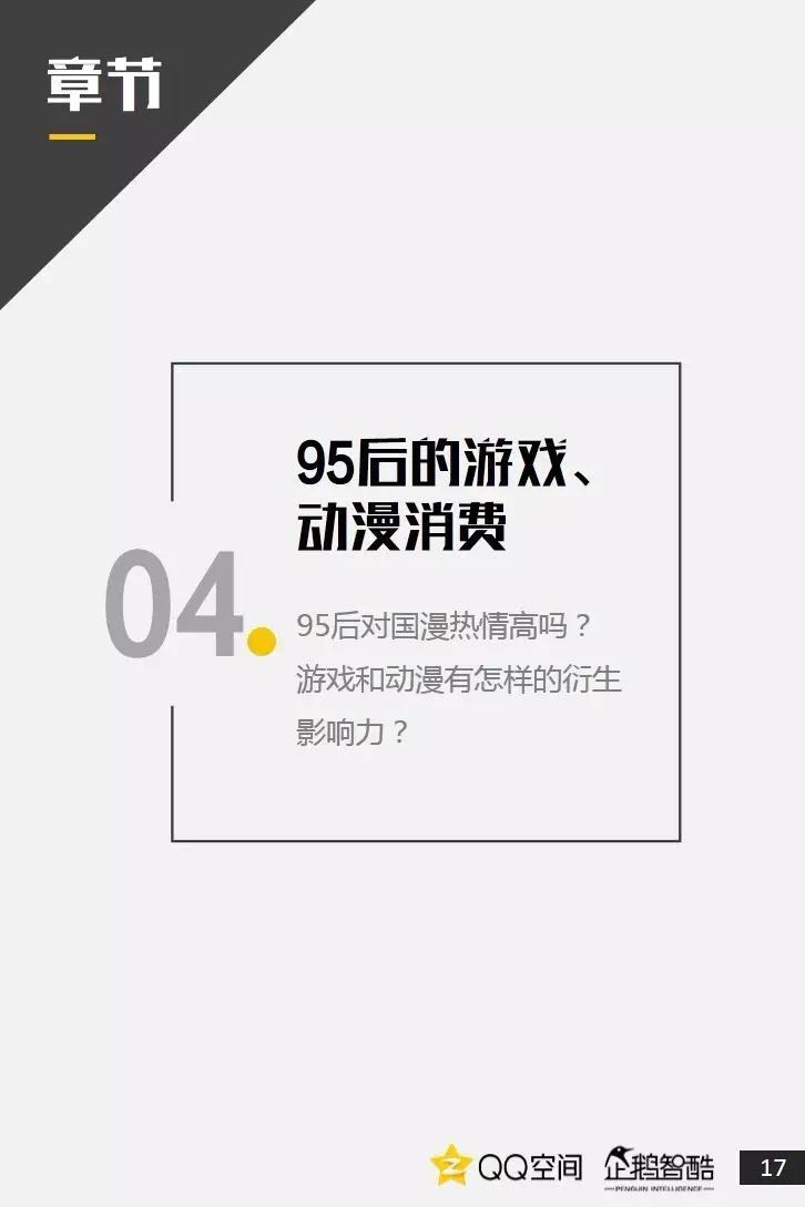 95后是活跃社交者,更善于把握兴趣+社交机会。95后也爱追星,但内在动机却有着新的演变。95后偏爱直播、短视频,内容消费更加碎片化和视觉化。95后当然爱玩游戏,但他们不只关注游戏本身。二次元已不再小众,95后撑起了动漫IP的价值空间。