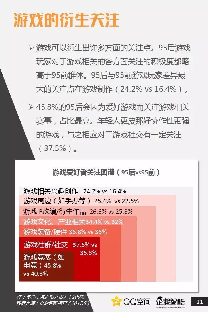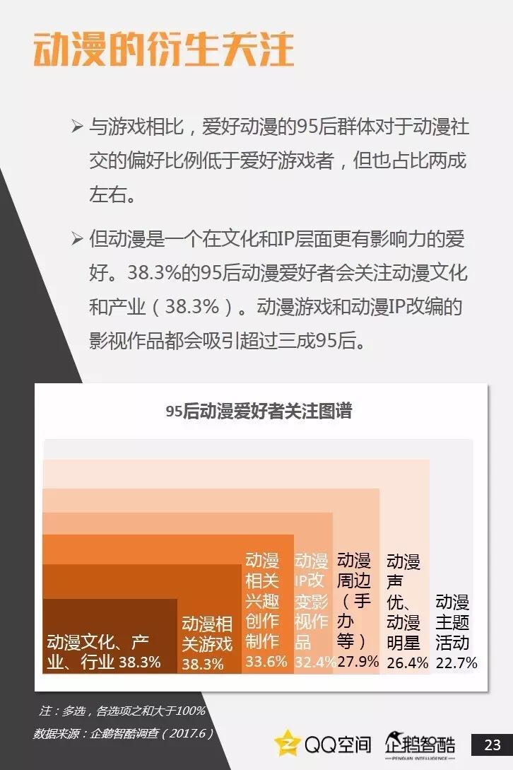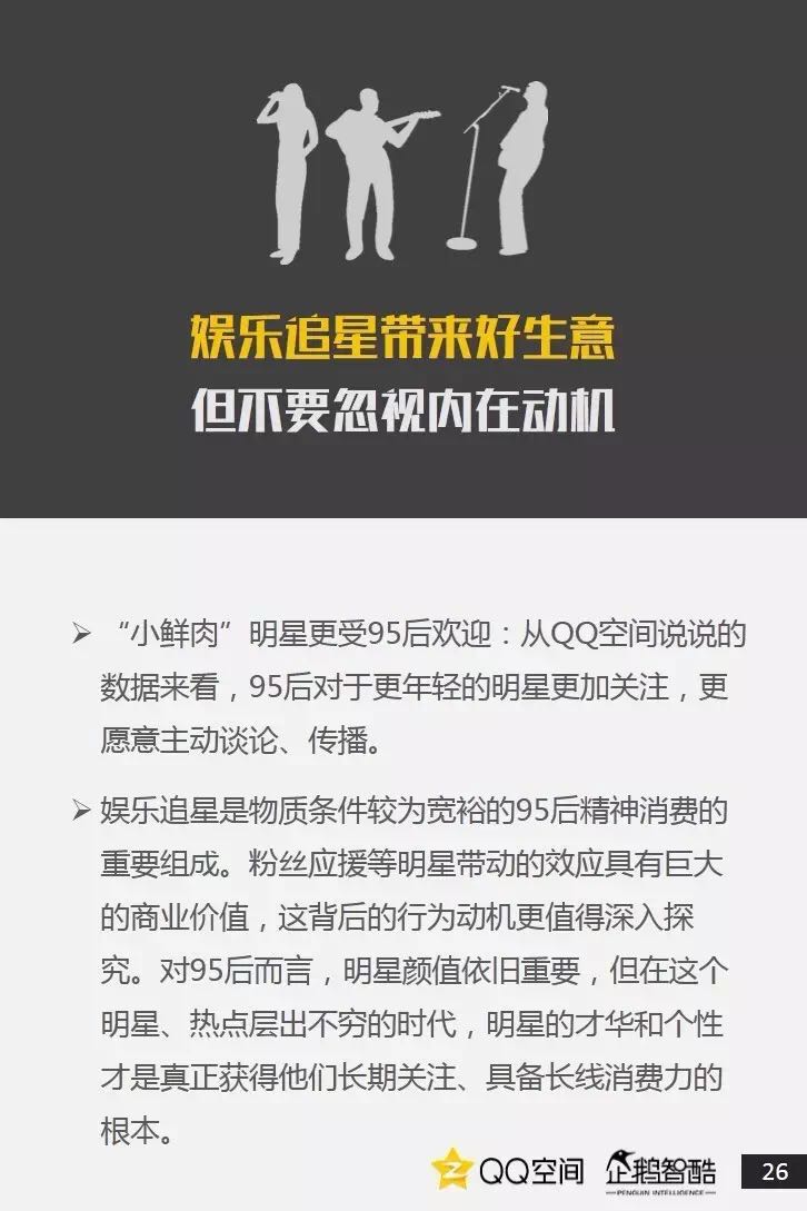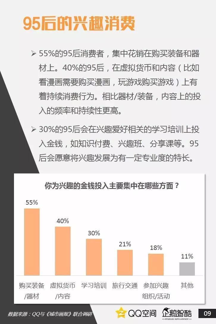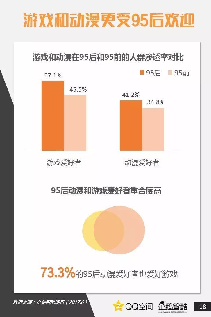 95后是活跃社交者,更善于把握兴趣+社交机会。95后也爱追星,但内在动机却有着新的演变。95后偏爱直播、短视频,内容消费更加碎片化和视觉化。95后当然爱玩游戏,但他们不只关注游戏本身。二次元已不再小众,95后撑起了动漫IP的价值空间。