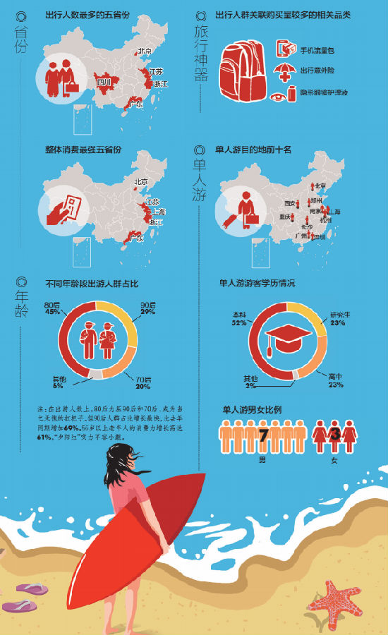 近年来,单身经济兴起,单人游也成为时尚。京东旅行数据显示,单人游方面,今年男生占比依旧是单人游的主力军,男女比例为7:3。