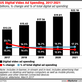 视频广告已经成为社交媒体重要的收入来源。eMarketer预测,今年,美国网络视频广告支出将达到132.3亿美元,同比增长23.7%。到2021年,支出将达到221.8亿美元。