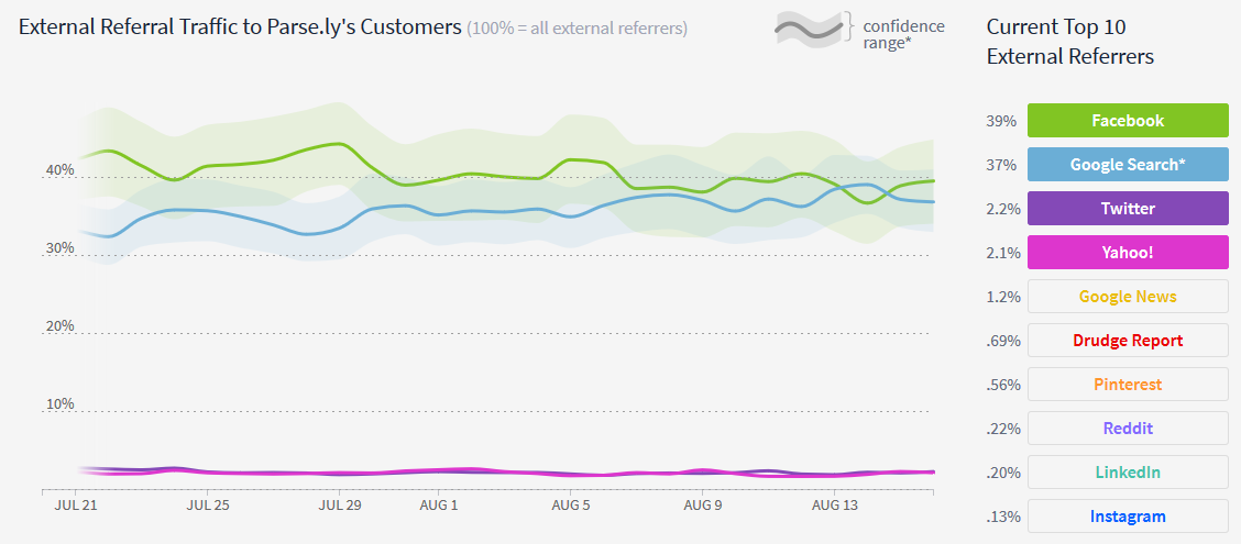 parse.ly 的数据显示,Facebook和谷歌搜索引荐流量之间的差距正在缩小。