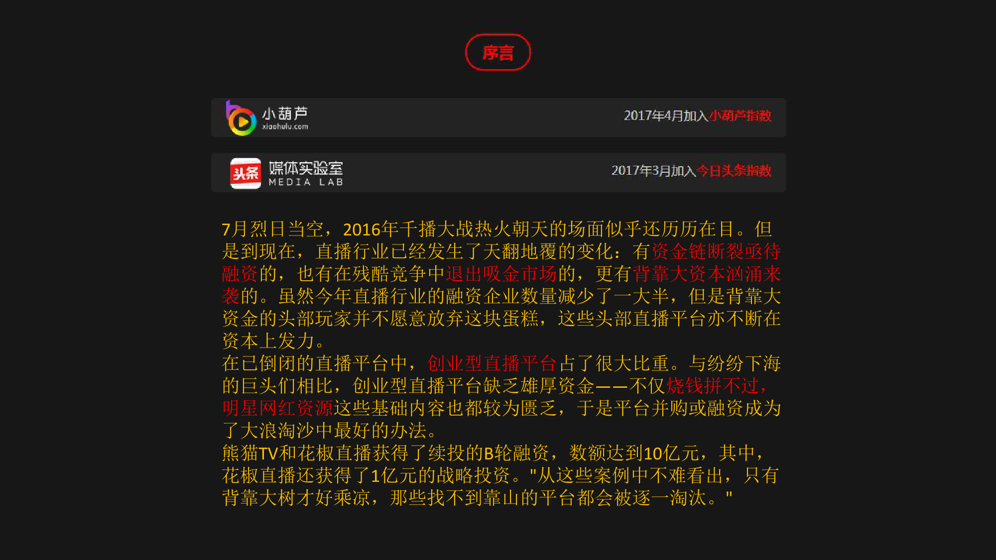 7月烈日当空,2016年千播大战热火朝天的场面似乎还历历在目。但 是到现在,直播行业已经发生了天翻地覆的变化:有资金链断裂亟待 融资的,也有在残酷竞争中退出吸金市场的,更有背靠大资本汹涌来 袭的。虽然今年直播行业的融资企业数量减少了一大半,但是背靠大 资金的头部玩家并不愿意放弃这块蛋糕,这些头部直播平台亦不断在 资本上发力。