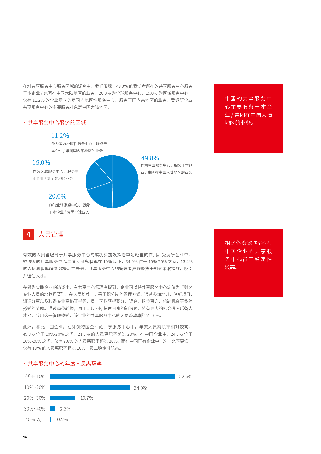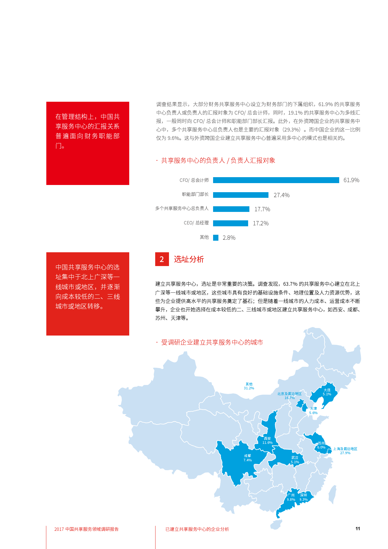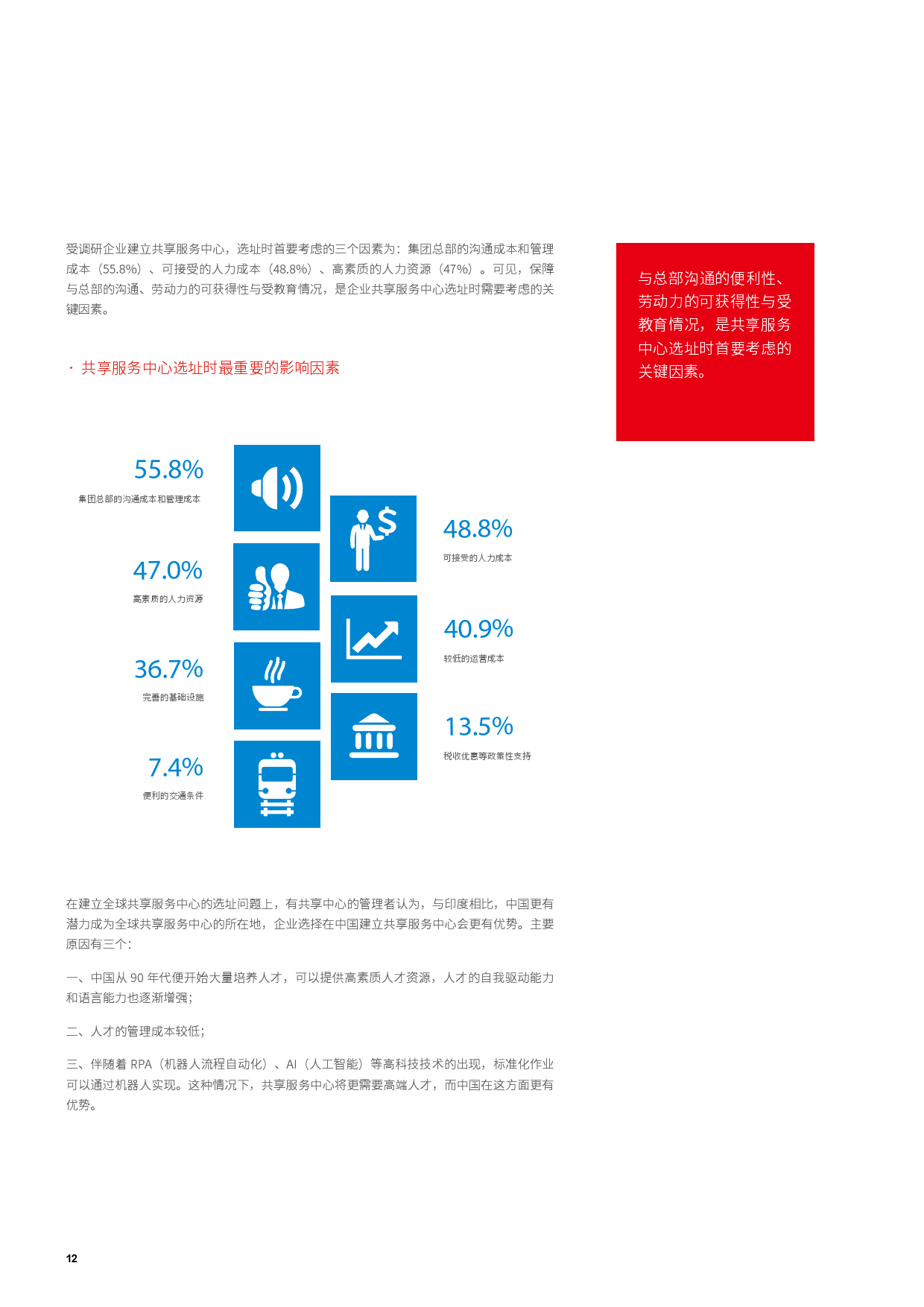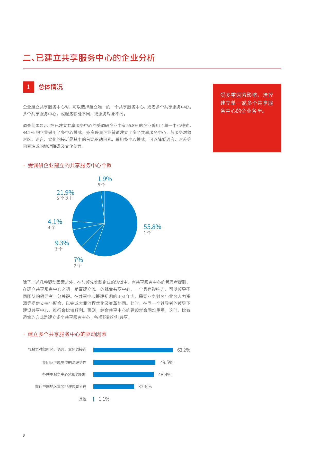 调查结果显示,在已建立共享服务中心的受调研企业中有55.8%的企业采用了单一中心模式,44.2%的企业采用了多中心模式,外资跨国企业普遍建立了多个共享服务中心,与服务对象时区、语言、文化的接近是其中的首要驱动因素。采用多中心模式,可以降低语言、时差等因素造成的地理障碍及文化差异。