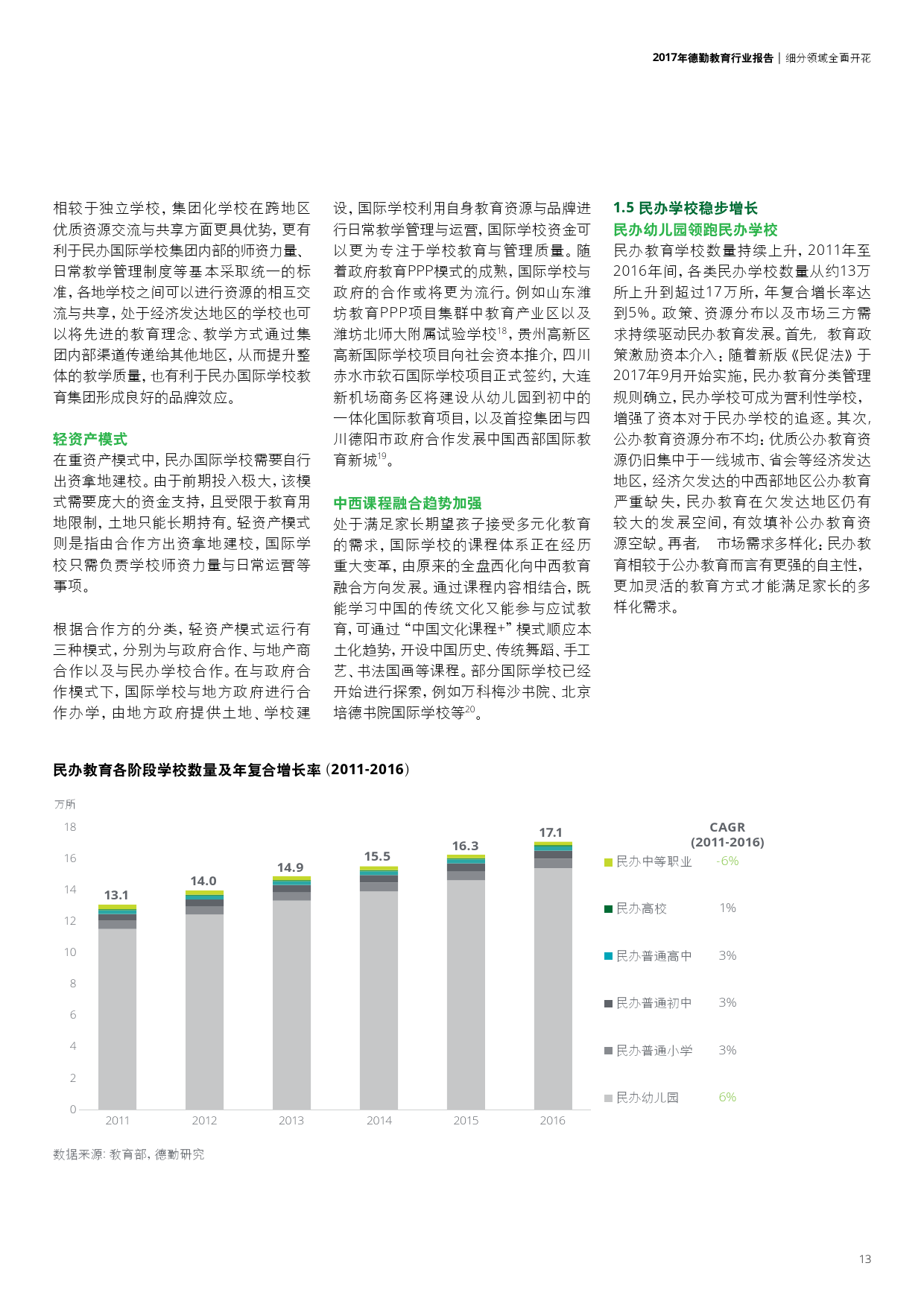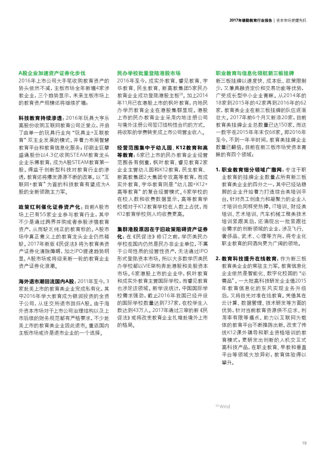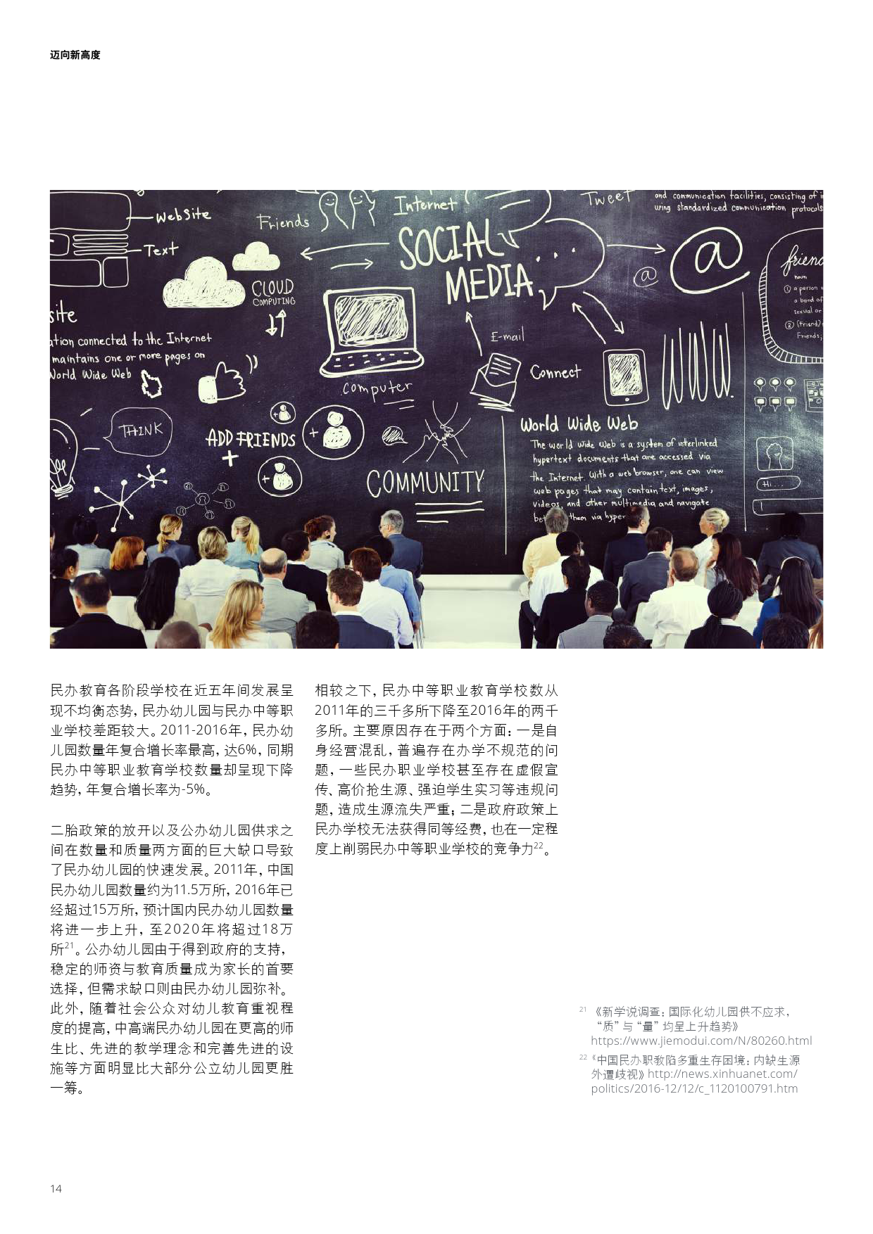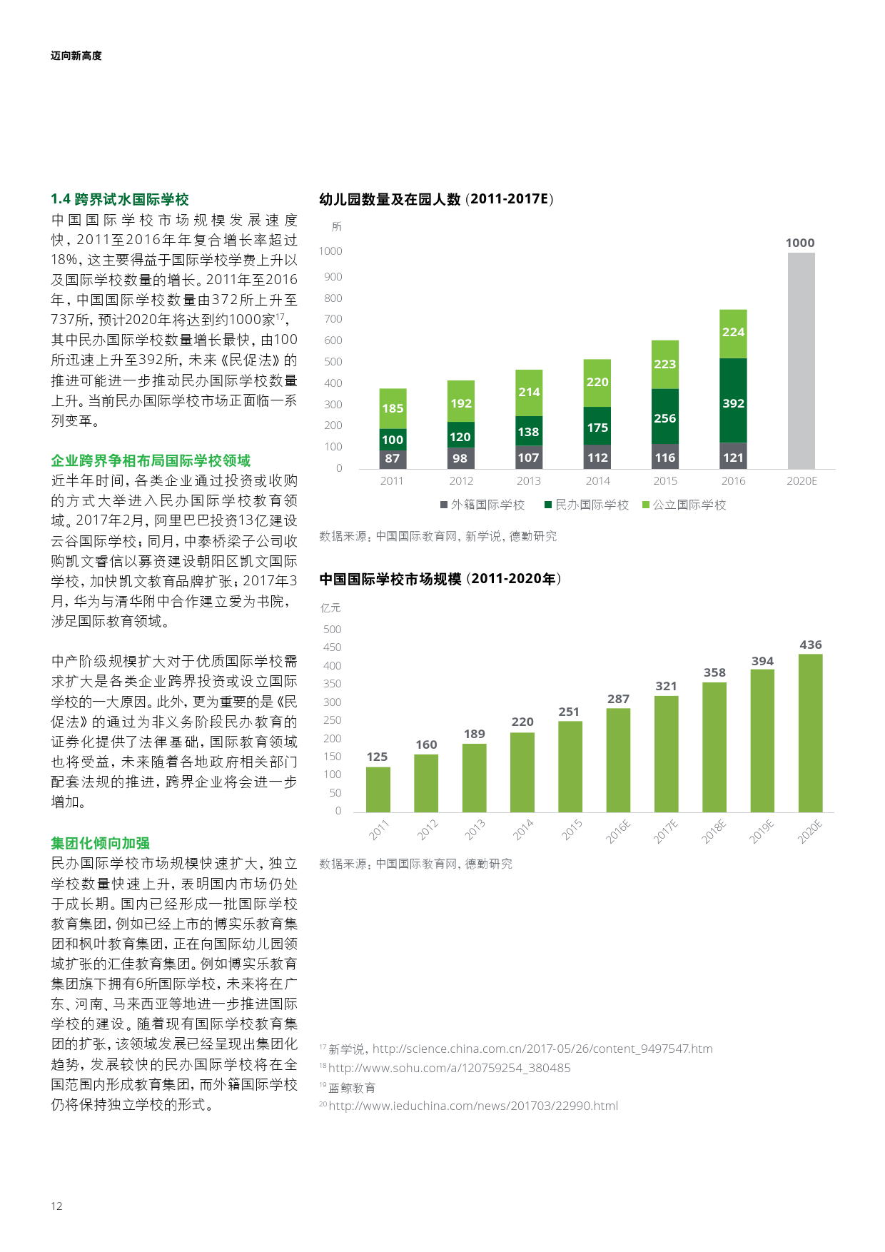 学前教育本土早教机构崛起、幼儿园品牌化;K12民营教育培训巨头推进多领域布局以及强化标准化;职业教育中的学历教育集团化与校企合作趋势不断深化,非学历教育中新技术的应用打破了传统教学方式;企业跨界布局国际学校更加频繁,国际学校轻资产模式或将进一步推广。此外,新《民促法》将加速教育资产证券化并推动民办教育机构转型,进入更高的发展层次。