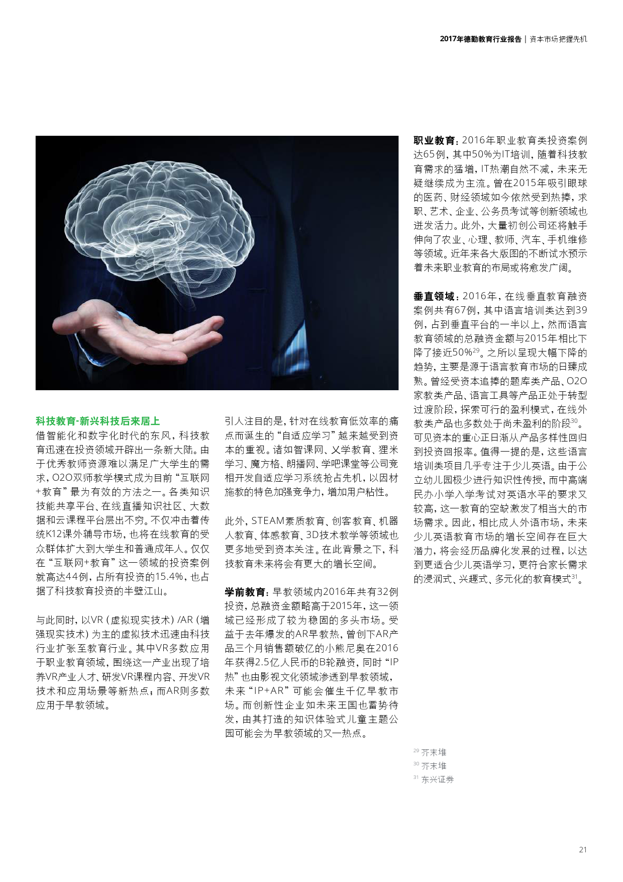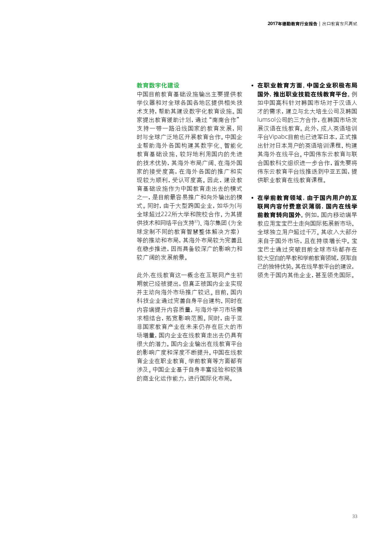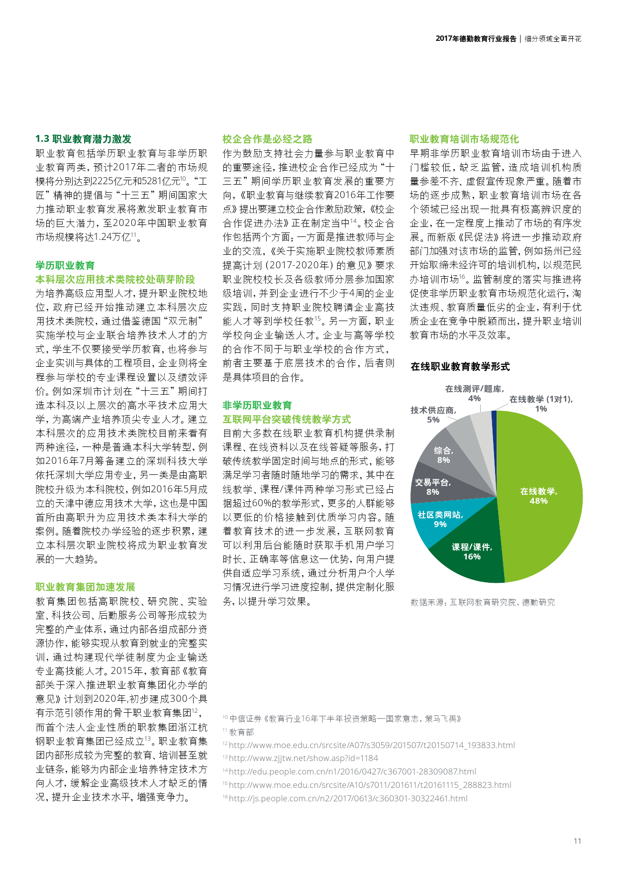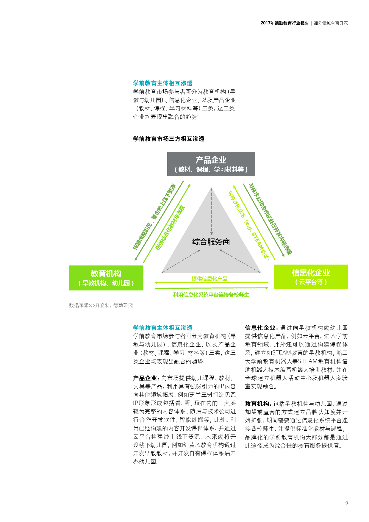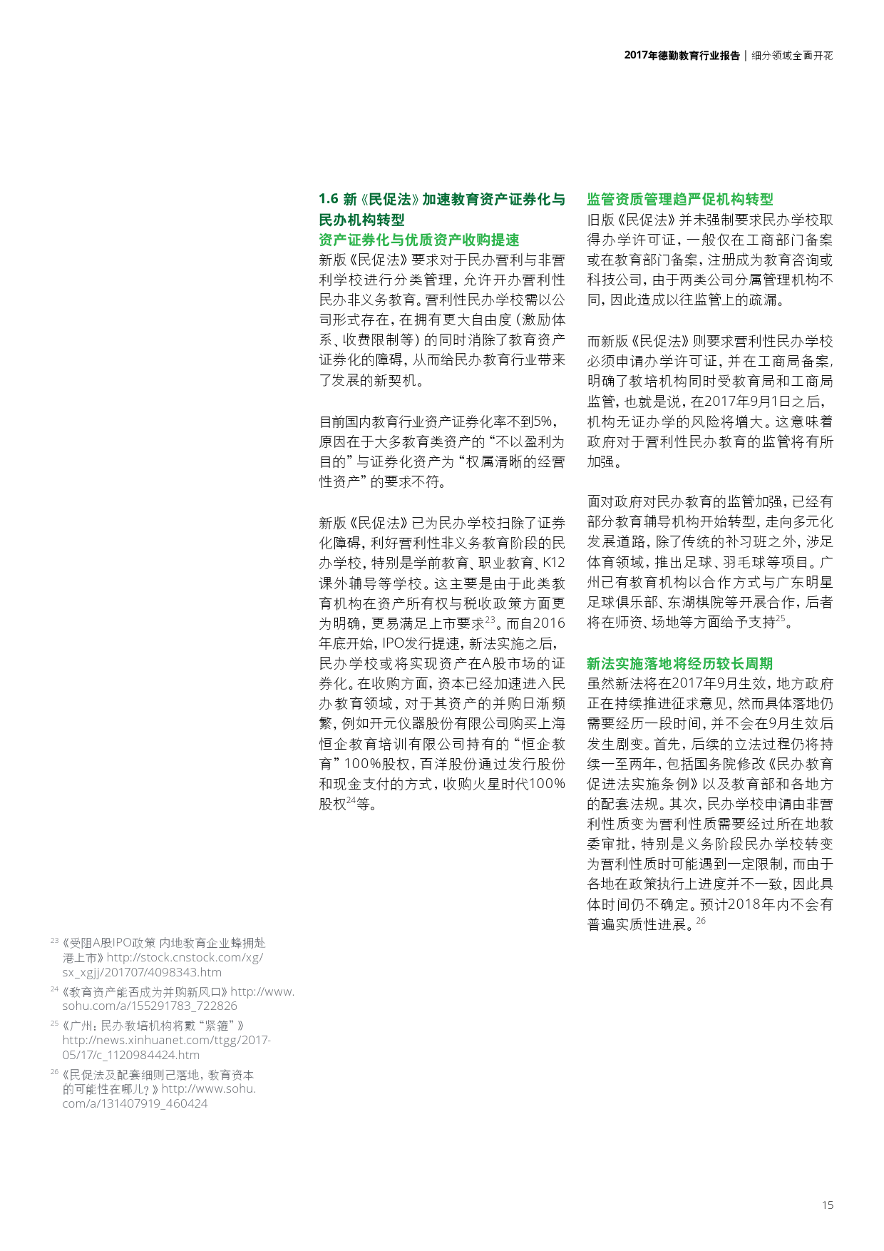 学前教育本土早教机构崛起、幼儿园品牌化;K12民营教育培训巨头推进多领域布局以及强化标准化;职业教育中的学历教育集团化与校企合作趋势不断深化,非学历教育中新技术的应用打破了传统教学方式;企业跨界布局国际学校更加频繁,国际学校轻资产模式或将进一步推广。此外,新《民促法》将加速教育资产证券化并推动民办教育机构转型,进入更高的发展层次。