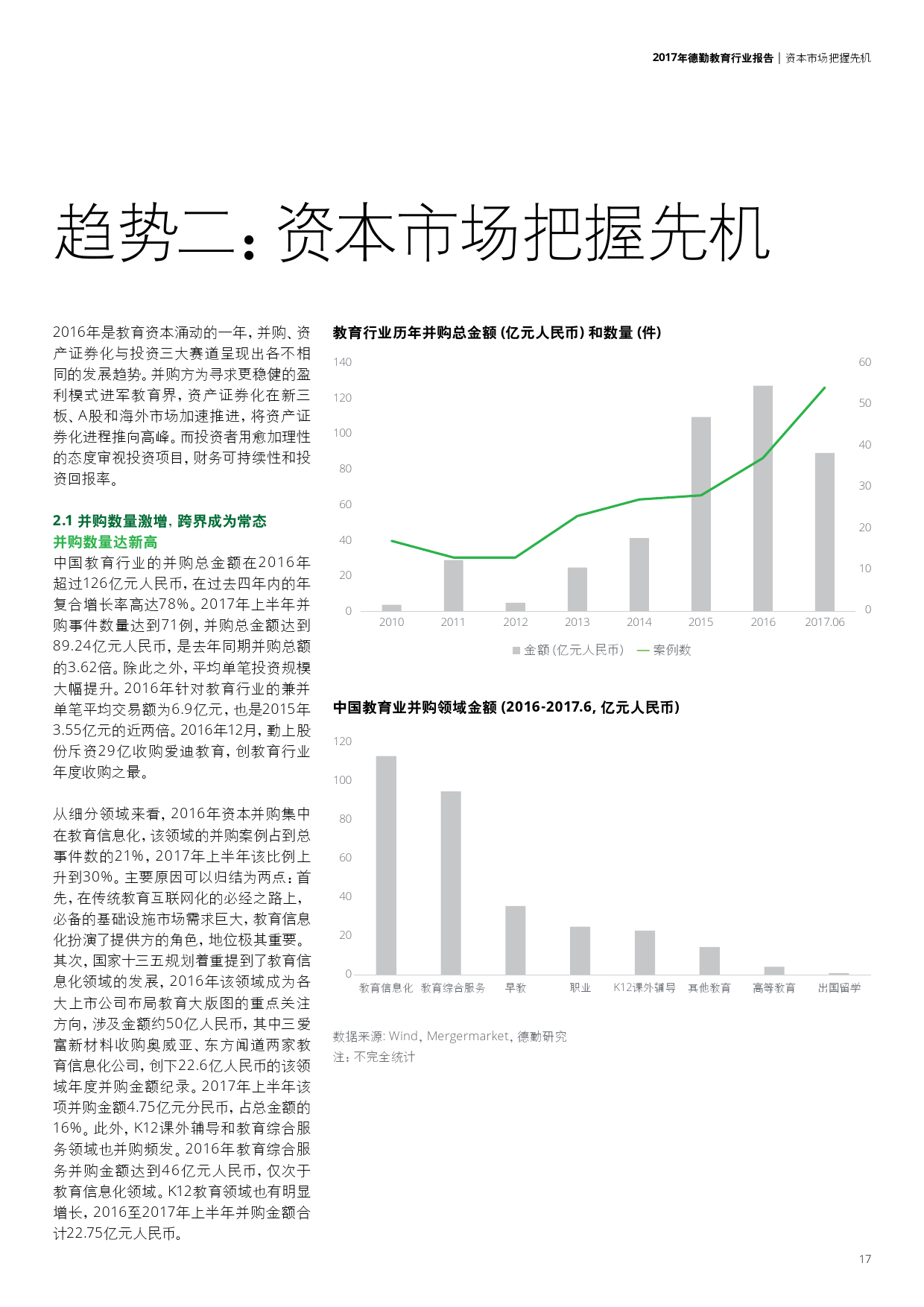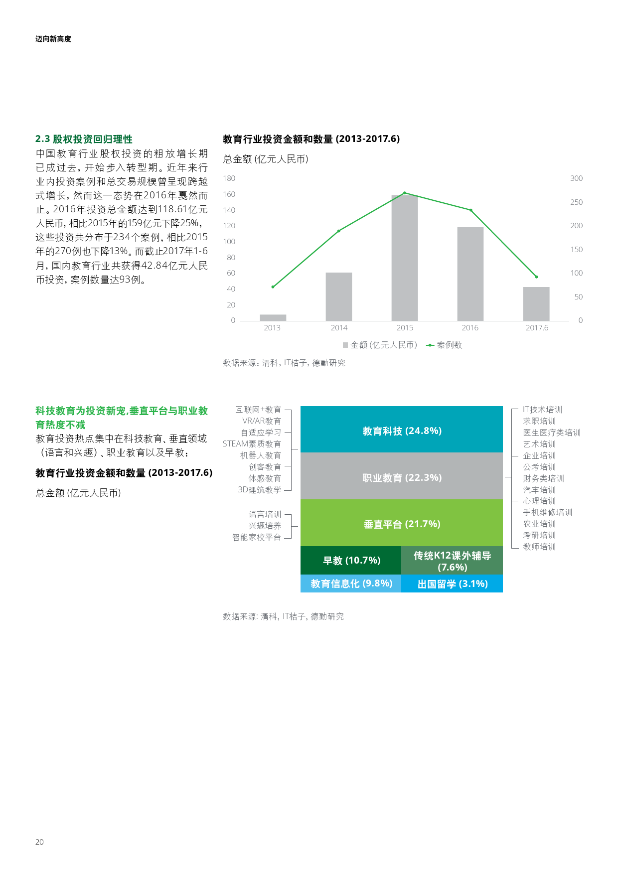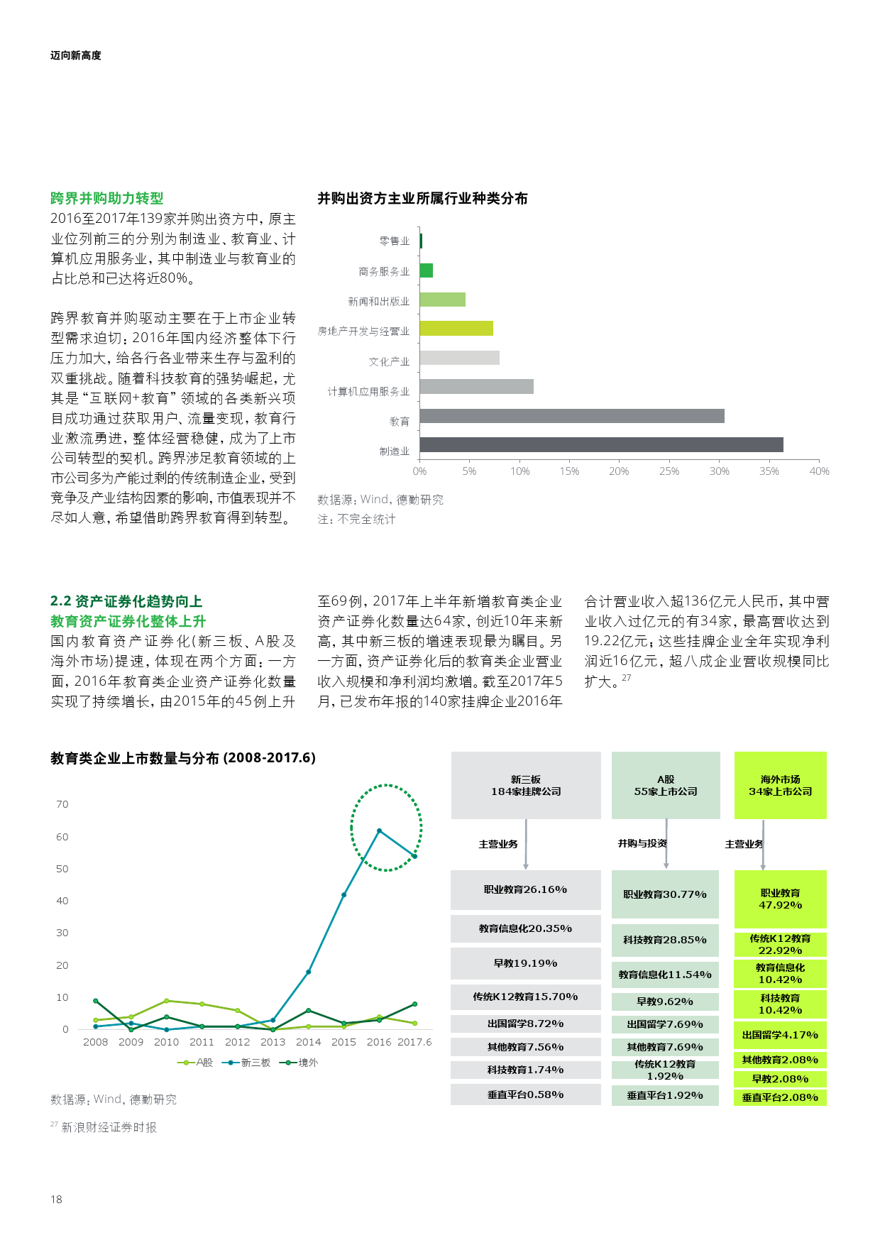 上市企业转型需求迫切,促使并购规模激增并于2016年达到峰值;新三板教育挂牌潮导致教育资产证券化数量打破历年记录;此外,教育科技领域投资已经成为投资热点。