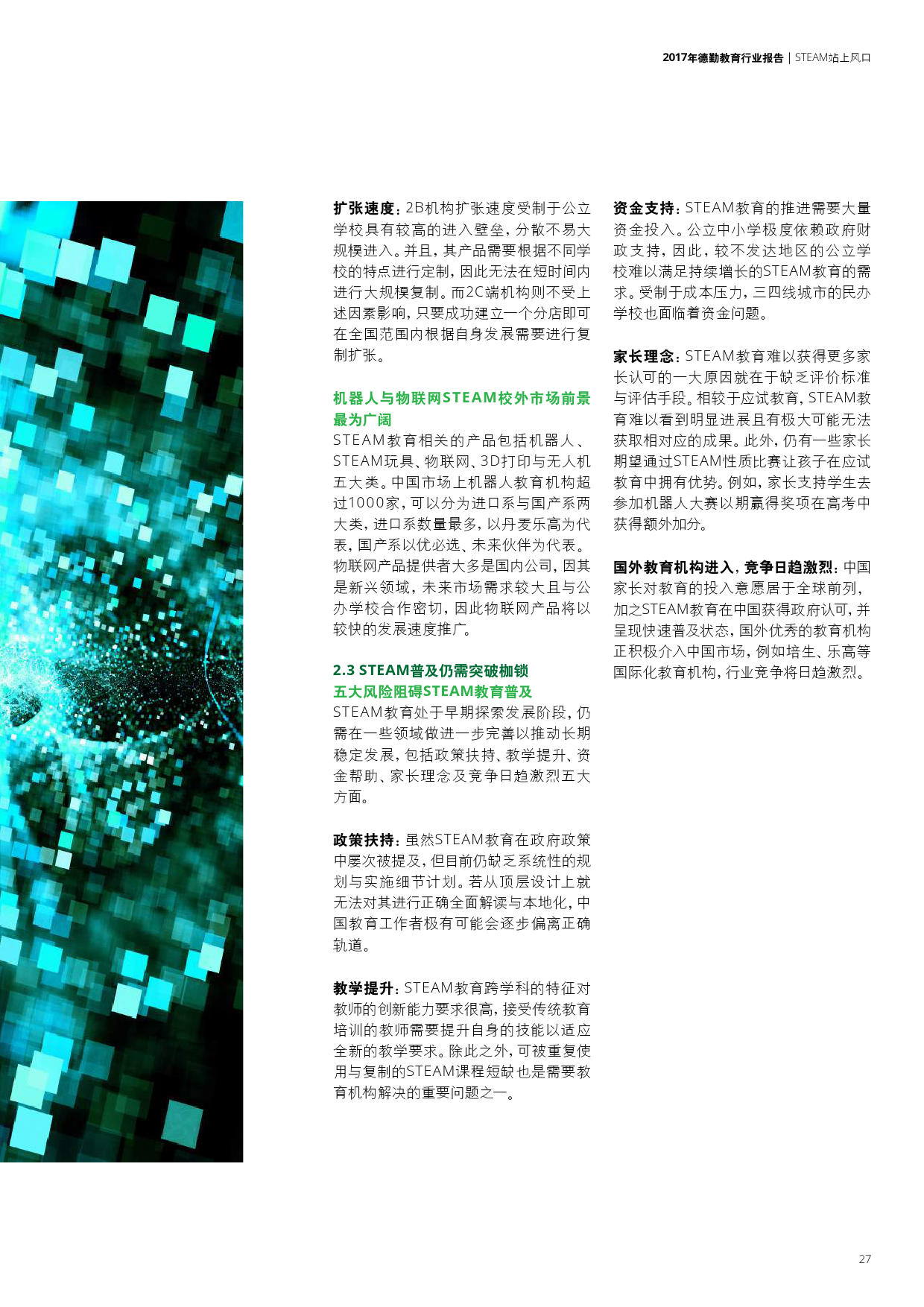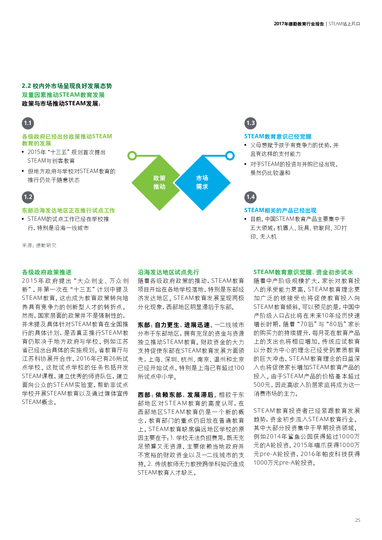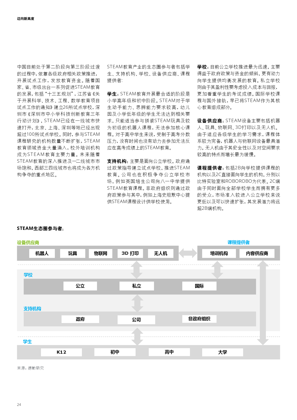 在政府政策与资金的支持下,一线城市正快速扩展,而社会资金的流入促使各类校外培训机构成为STEAM 教育的主要力量。