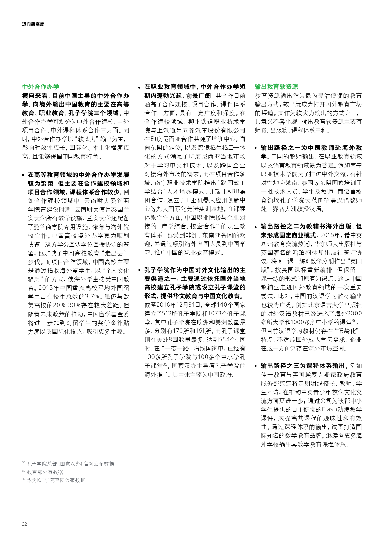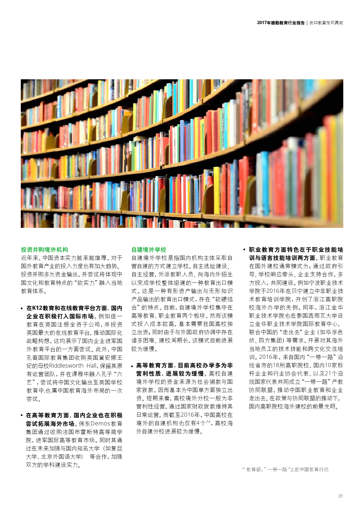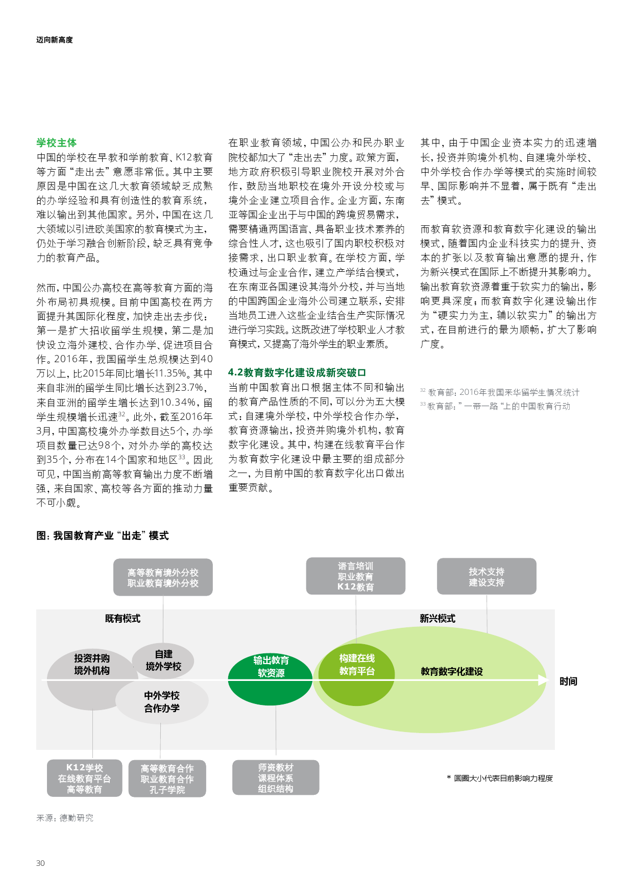 在“一带一路”政策推动下,中国教育产业呈现走出去的发展趋势,其中职业教育院校与高等院校出走力度最大。数字化教育基础设施成为影响力最高的推进模式。