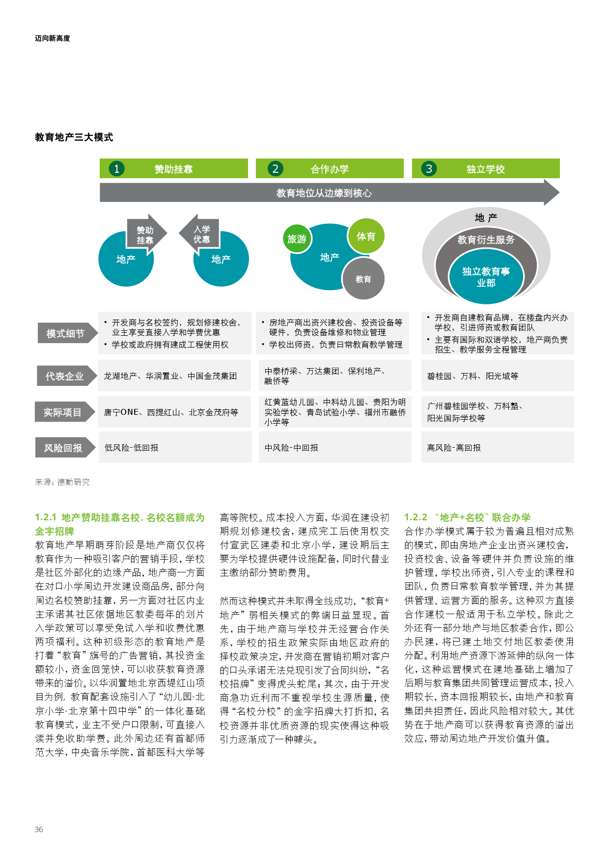 教育地产跨界多元发展,双方关联程度的不断加深,可将传统模式分为赞助挂靠、合作办学与独立办学三种模式。随着教育地产一体化程度不断深化,更衍生出教育综合体模式,教育在地产中的核心地位增强。