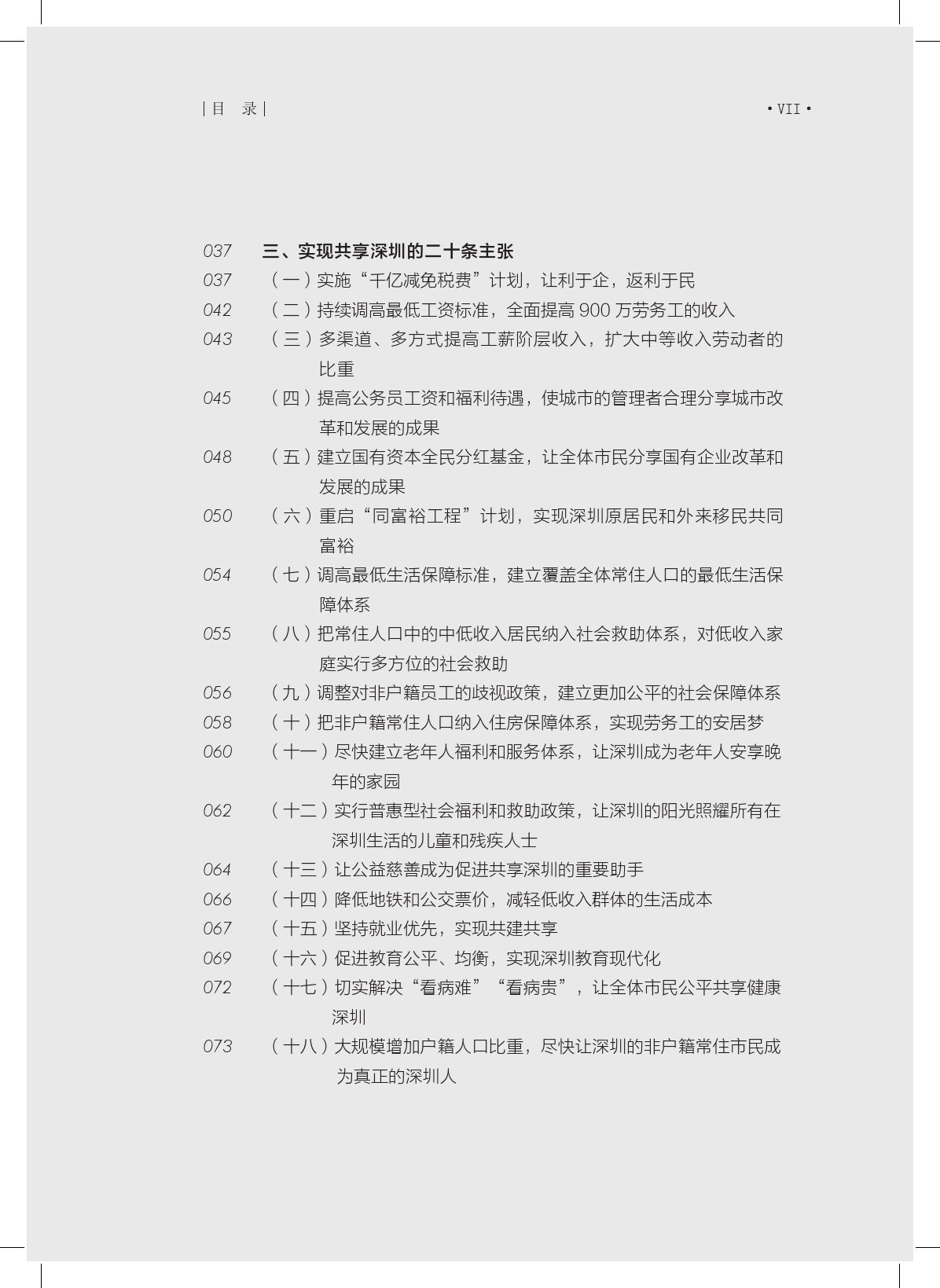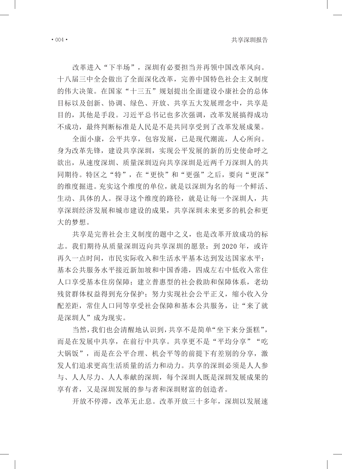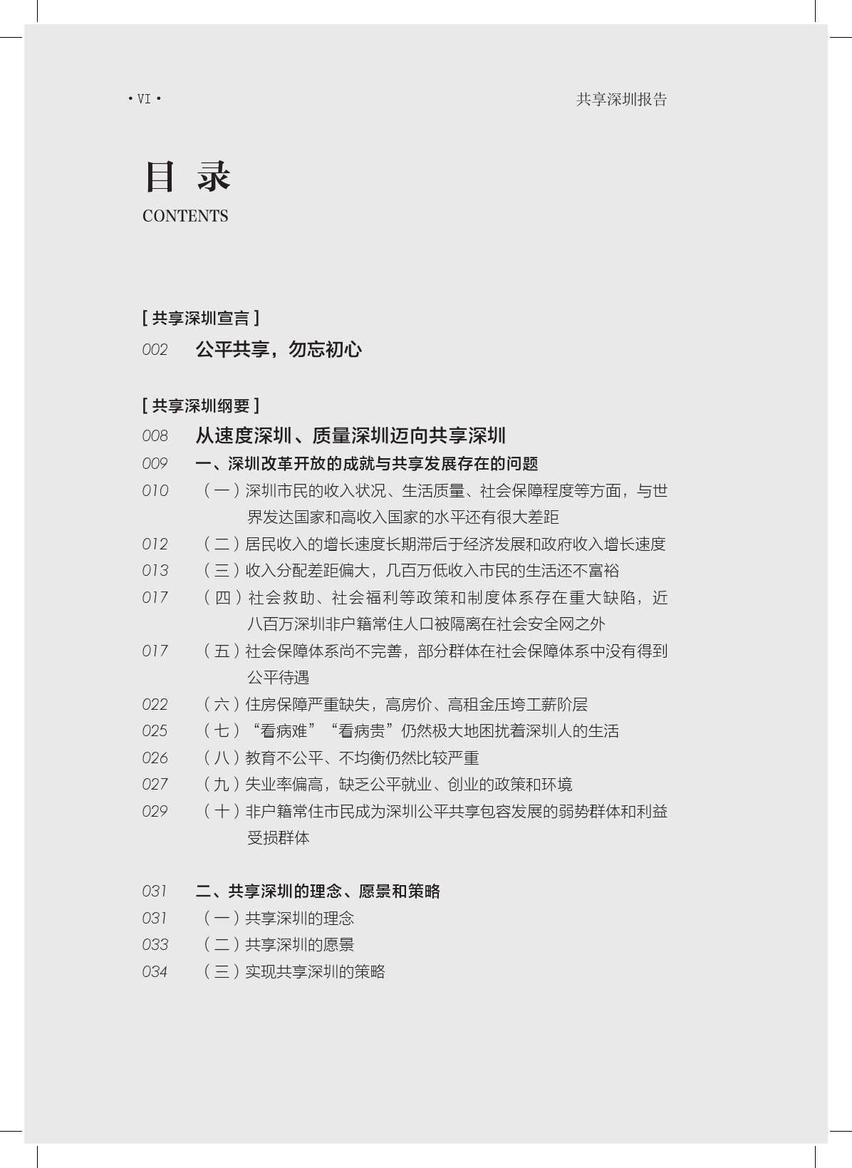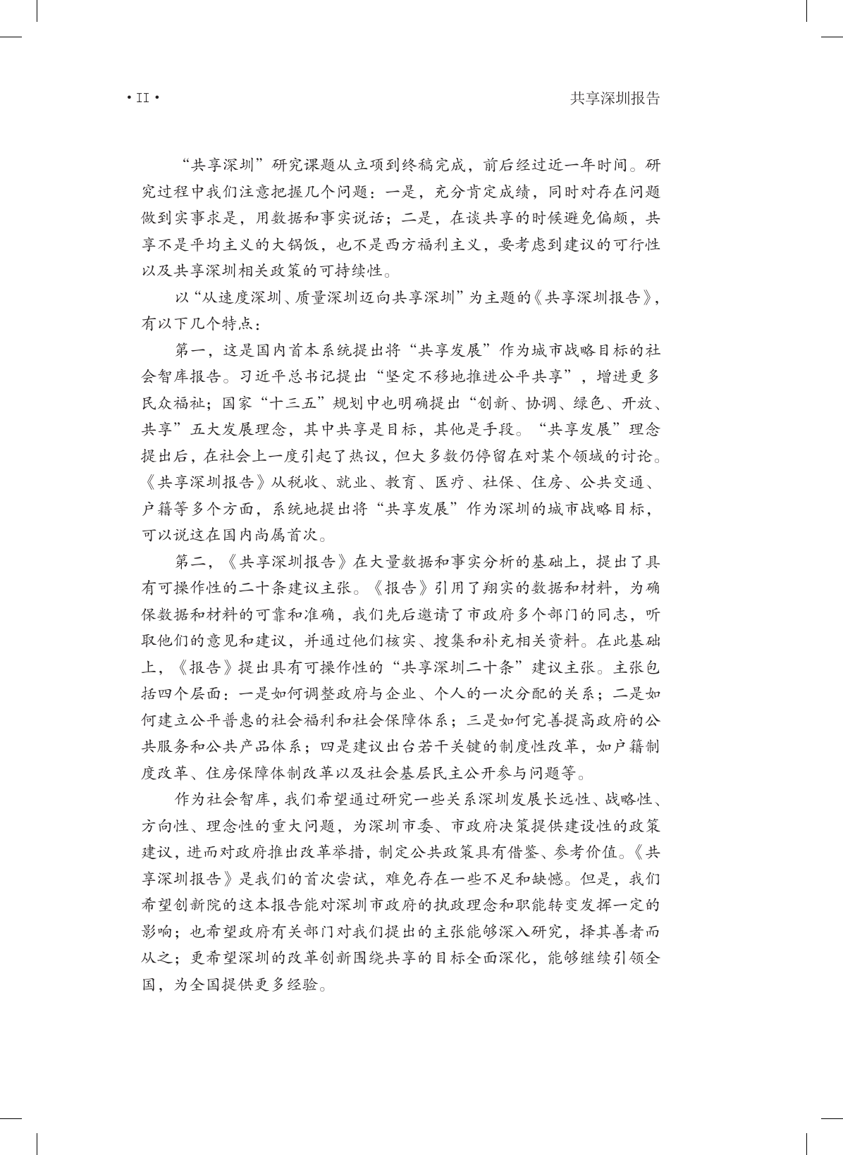 作为国内首本系统提出将“共享发展”作为城市战略目标的社会智库报告,《共享深圳报告》在大量数据和事实分析的基础上,提出具有可操作性的“共享深圳二十条”建议。主要包括四个层面:一是如何调整政府与企业、个人的一次分配的关系;二是如何建立公平普惠的社会福利和社会保障体系;三是如何完善提高政府的公共服务和公共产品体系;四是建议出台若干关键的制度性改革,如户籍制度改革、住房保障体制改革以及社会基层民主公开参与等。