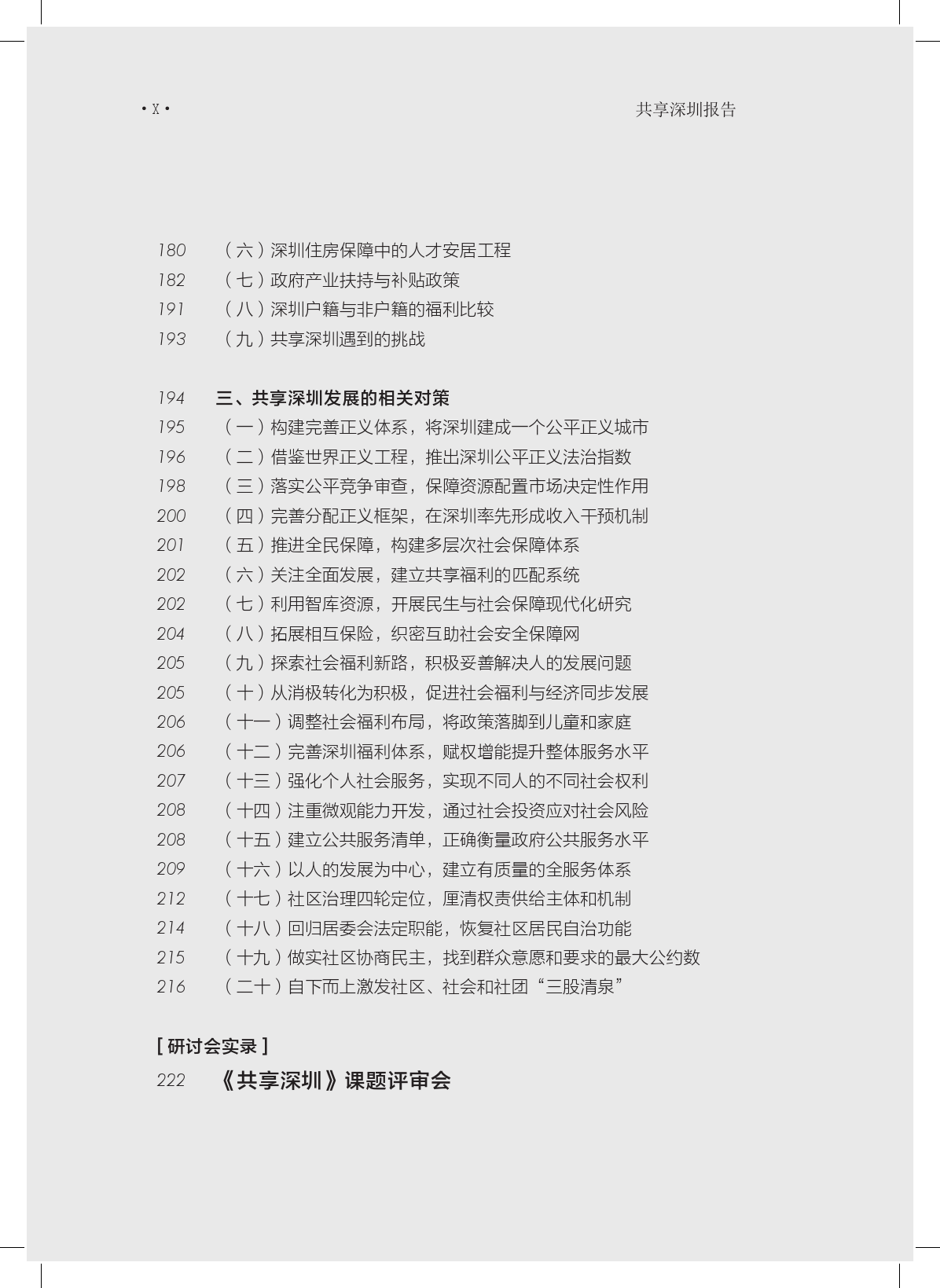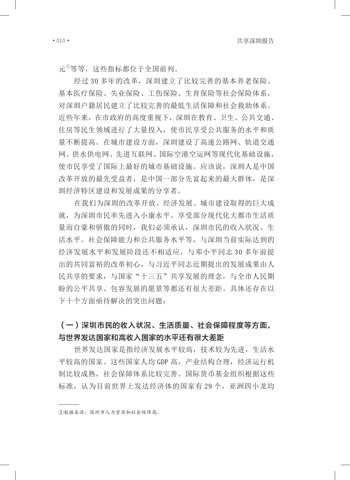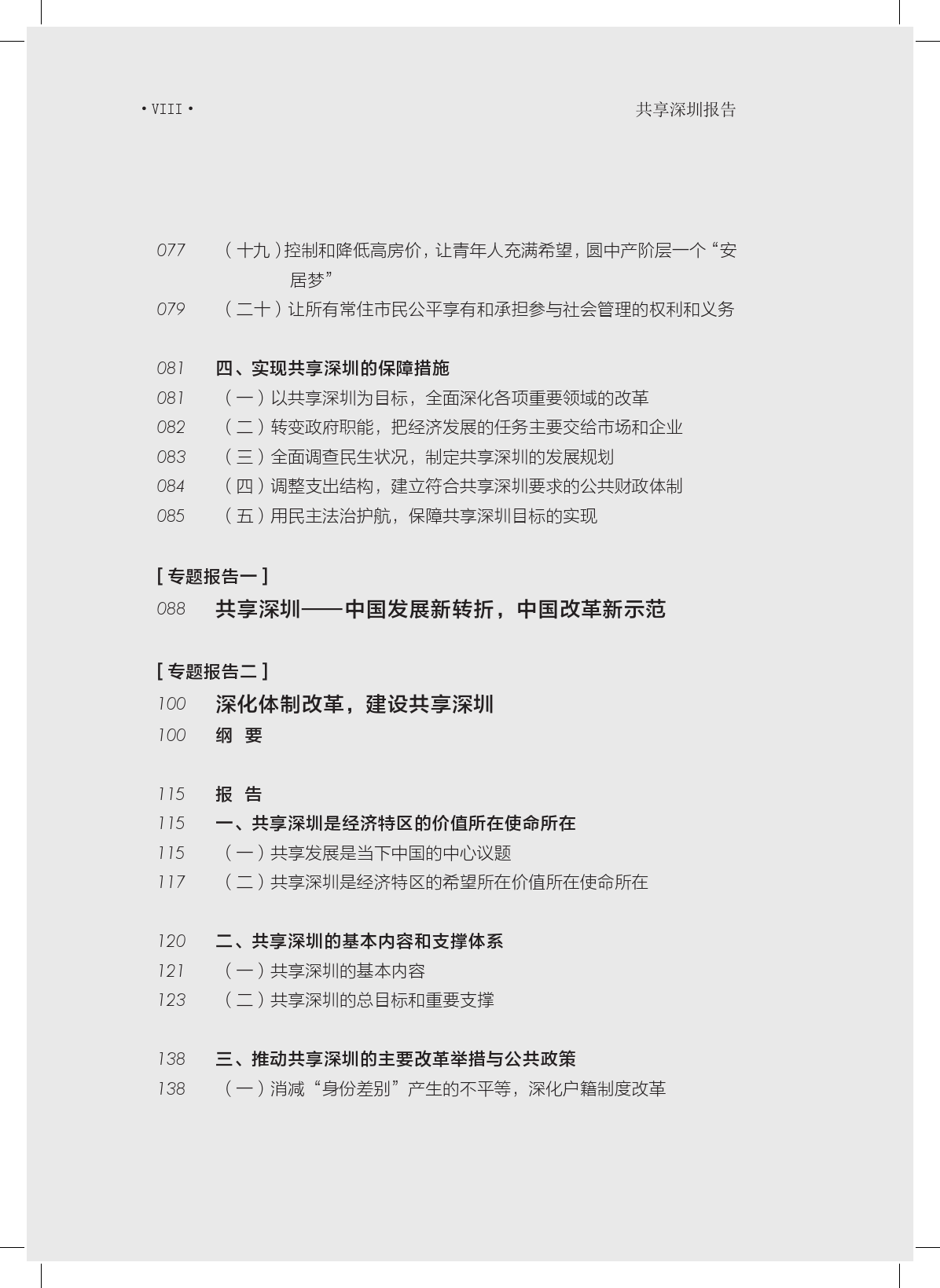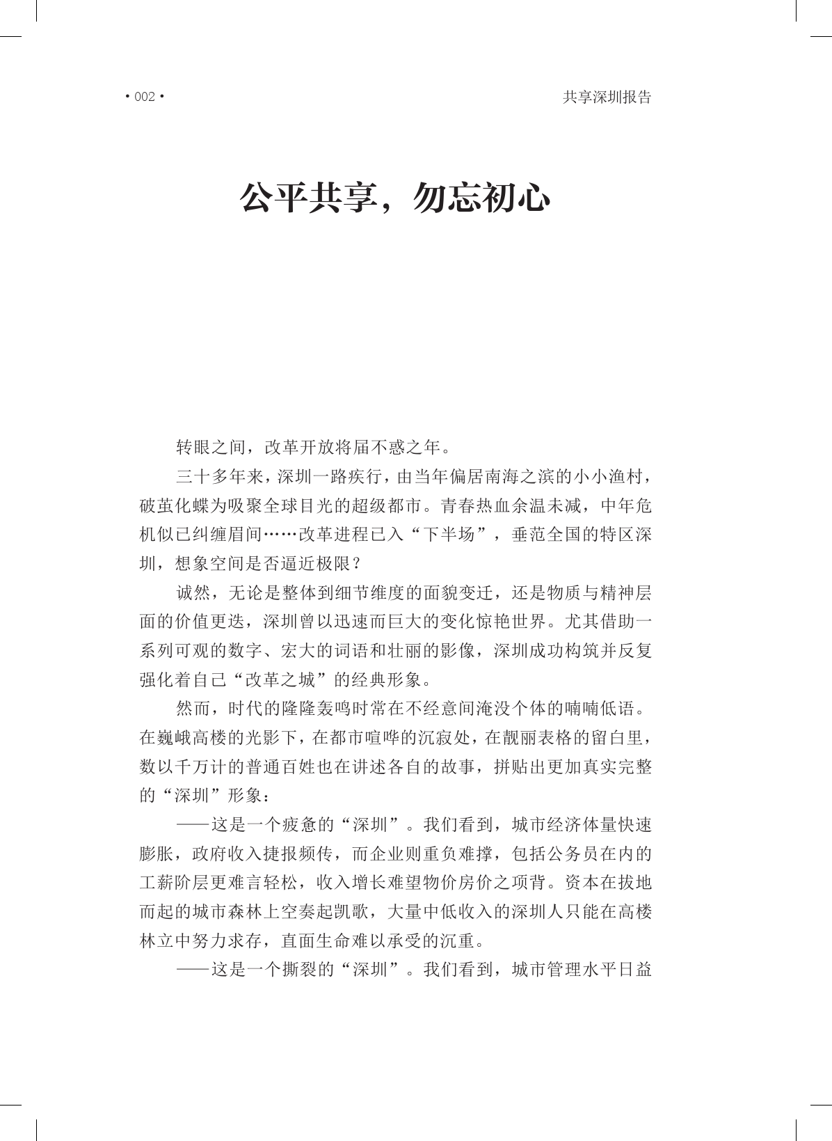 作为国内首本系统提出将“共享发展”作为城市战略目标的社会智库报告,《共享深圳报告》在大量数据和事实分析的基础上,提出具有可操作性的“共享深圳二十条”建议。主要包括四个层面:一是如何调整政府与企业、个人的一次分配的关系;二是如何建立公平普惠的社会福利和社会保障体系;三是如何完善提高政府的公共服务和公共产品体系;四是建议出台若干关键的制度性改革,如户籍制度改革、住房保障体制改革以及社会基层民主公开参与等。
