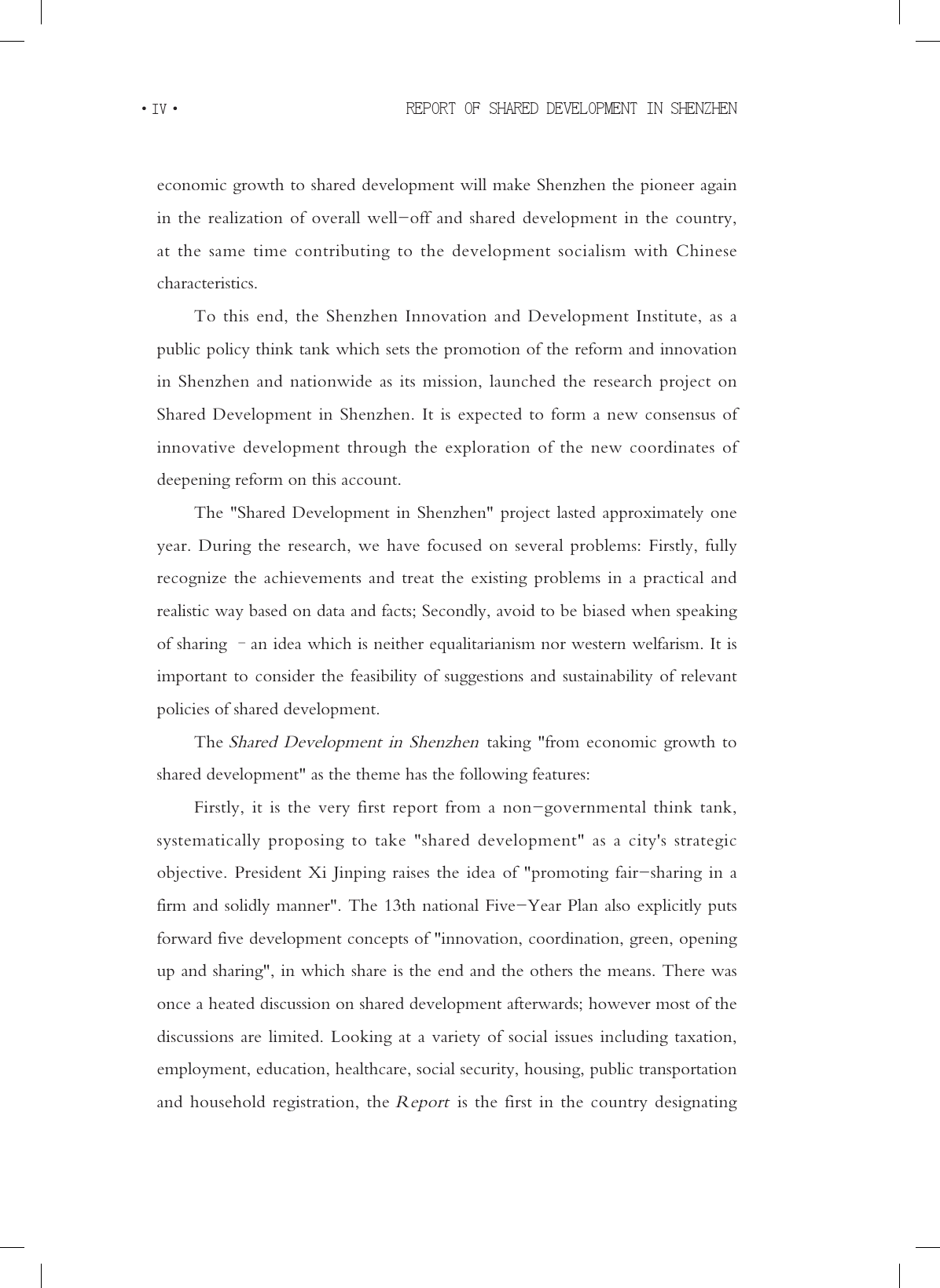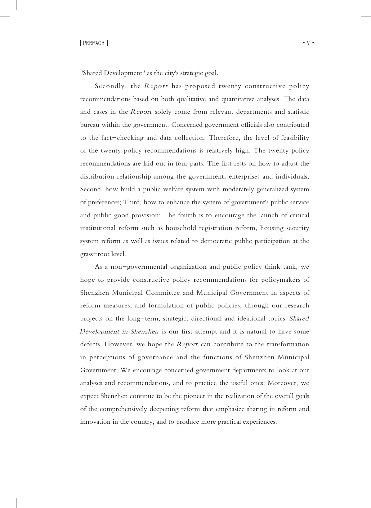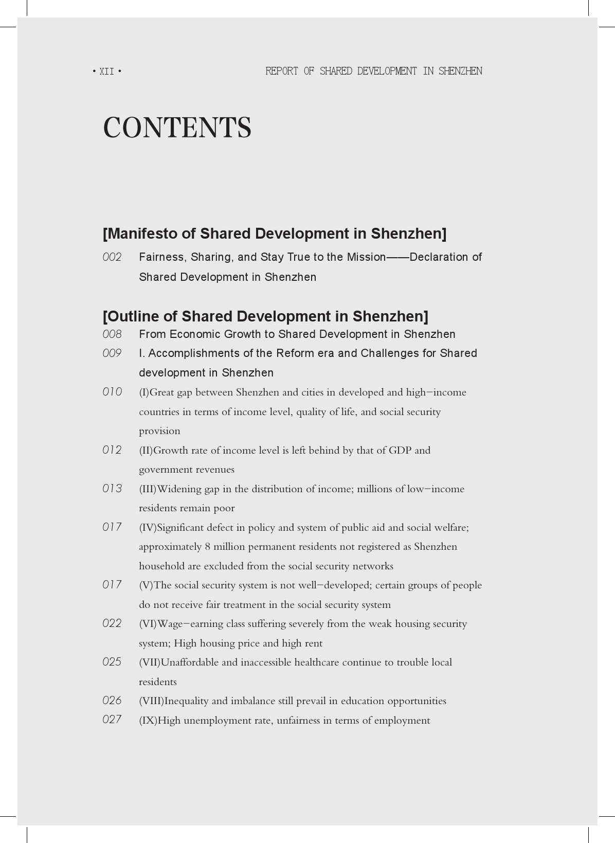 《共享深圳报告》由五部分组成:“共享深圳宣言”、“共享深圳纲要”、“专题报告”、“研讨会实录”和“采访报道”,力争从多角度、多层次阐述“共享发展”的理念、愿景、策略和主张。