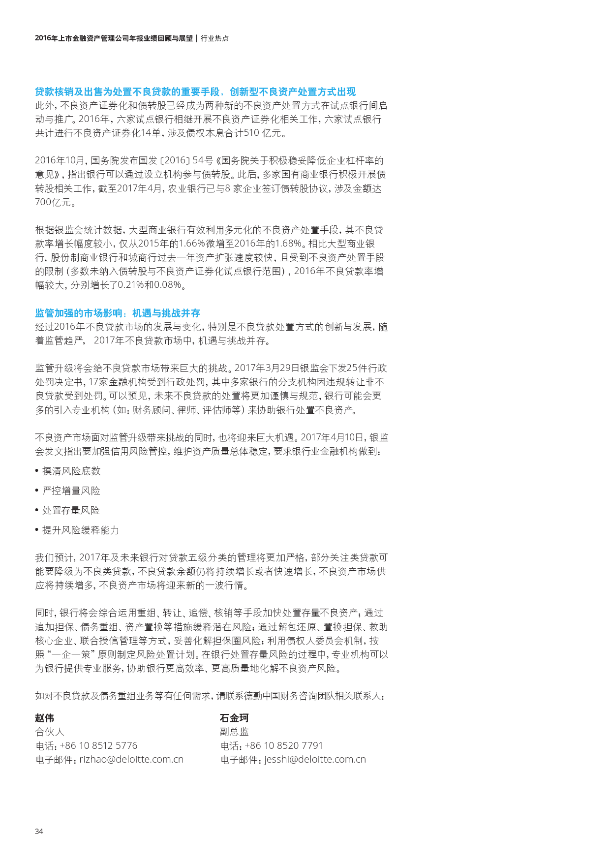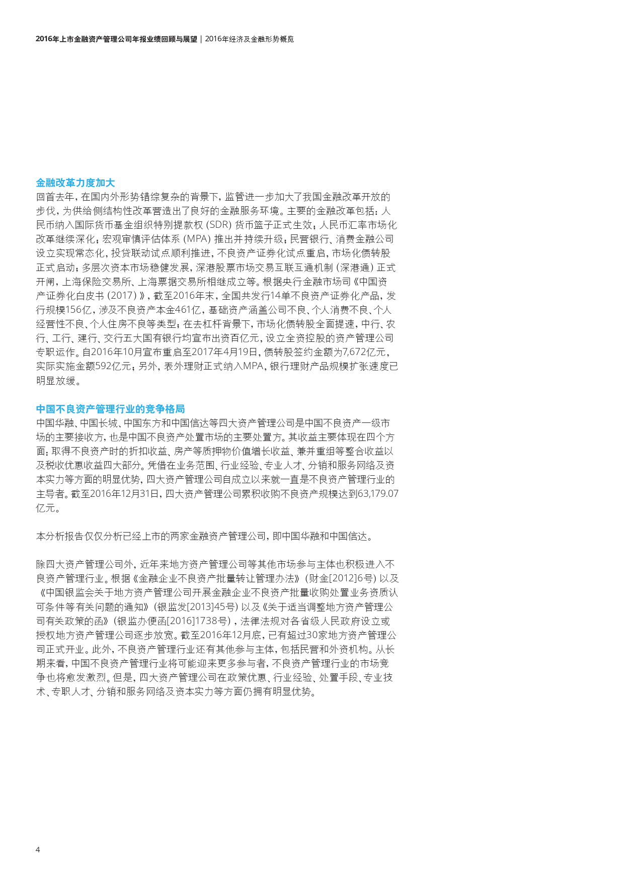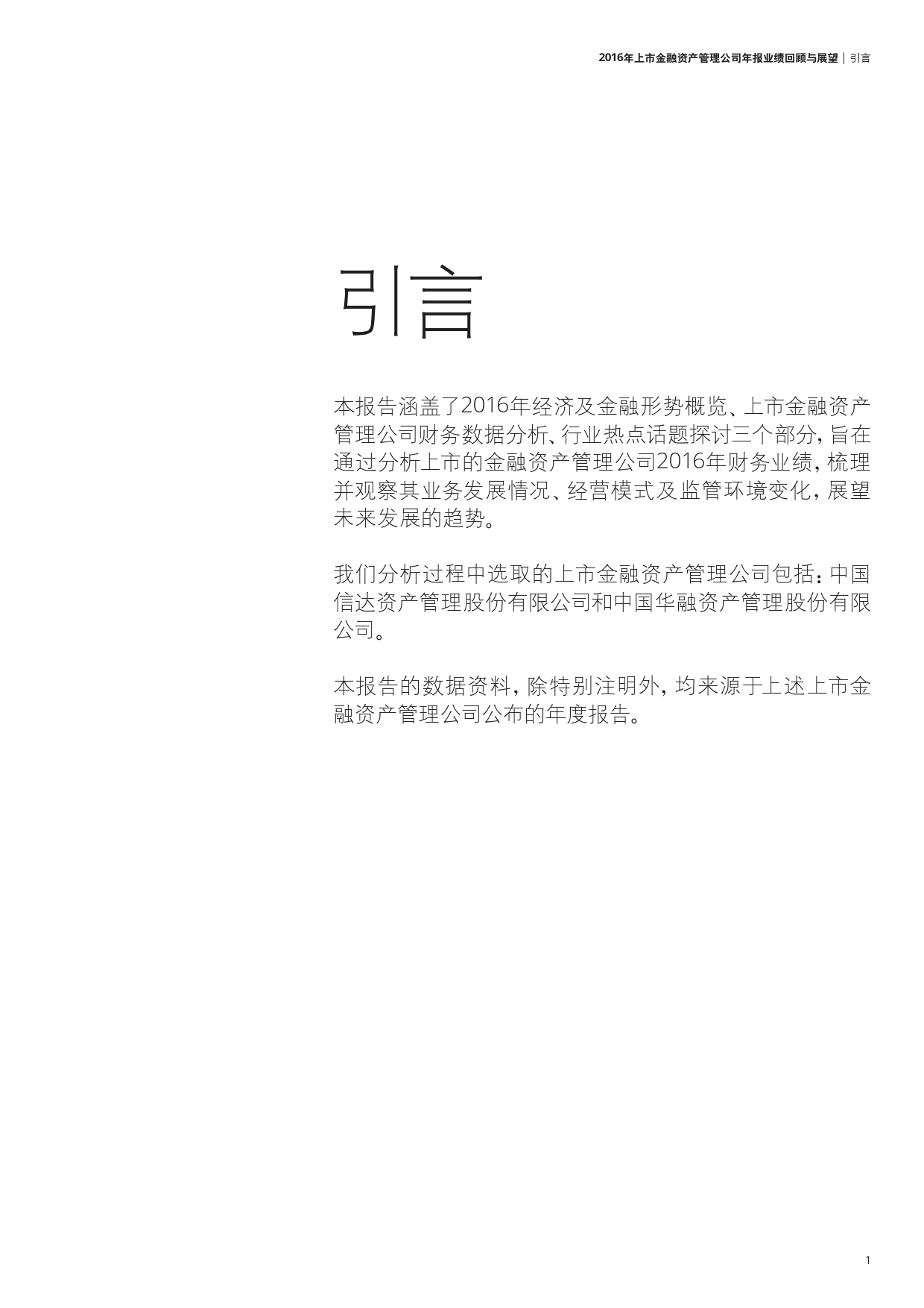 本报告涵盖了中国经济及金融形势概览和H股的金融资产管理公司2016年财务业绩分析,还探讨了行业热点话题,并展望中国资产管理行业来年的发展趋势。