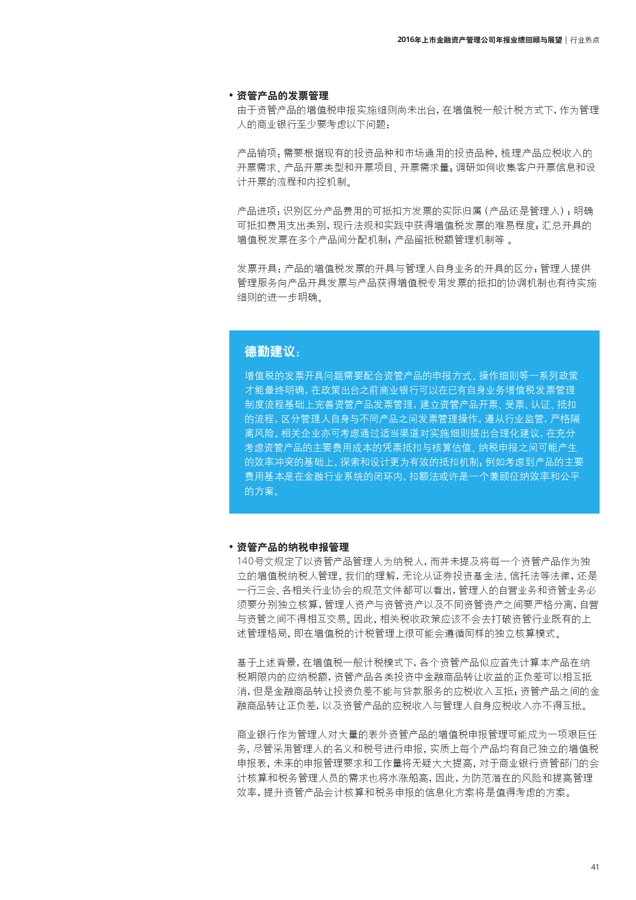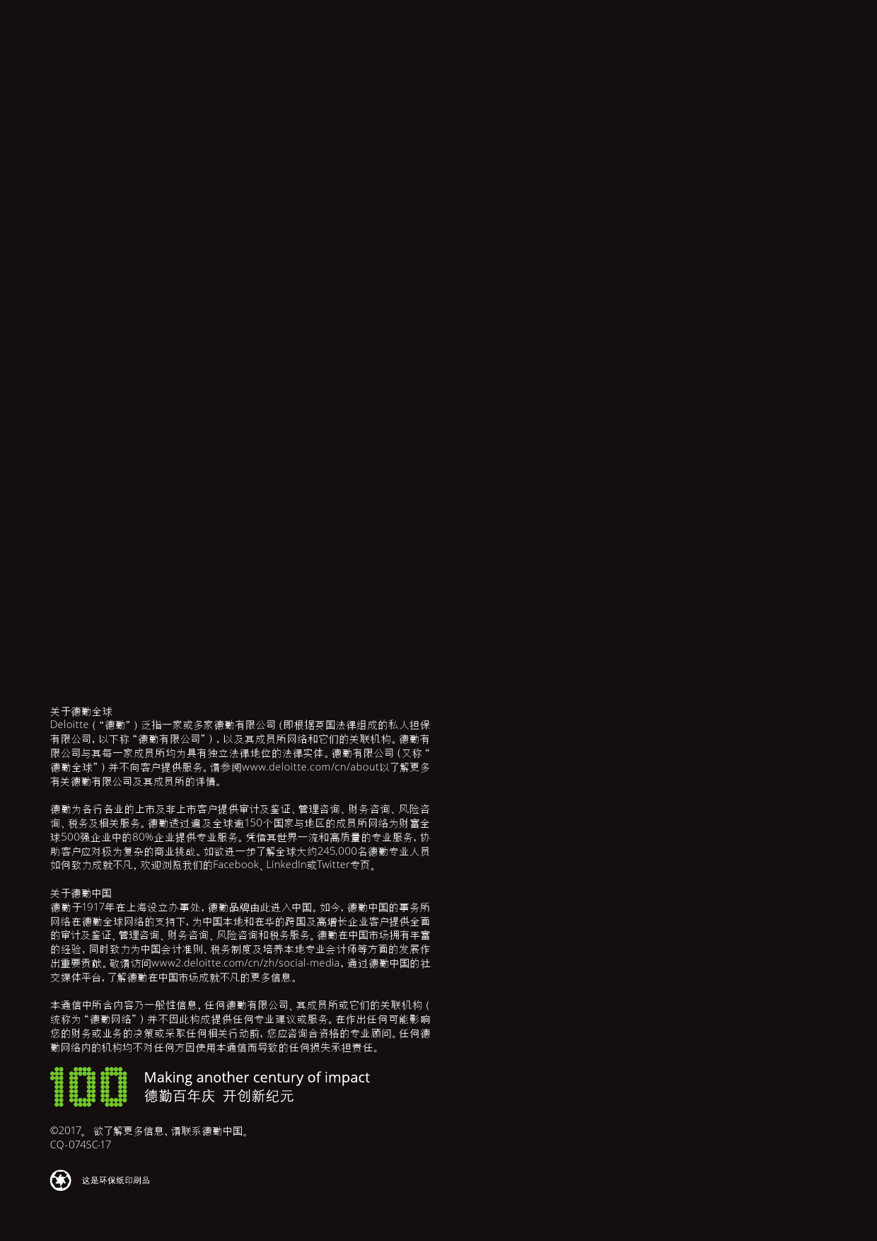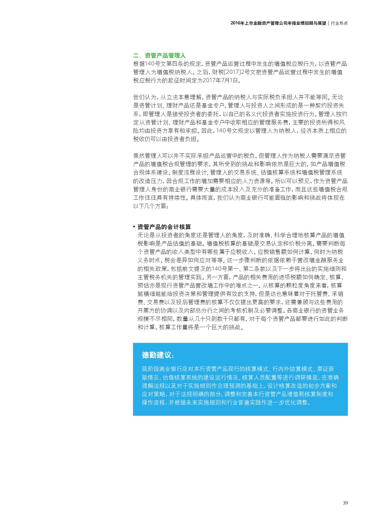 中国持续的经济和财经改革为主要金融资产管理公司创造了机遇与挑战。展望来年,德勤相信以下范畴会是中国金融资产管理行业的关注热点:第一,不良压力企稳,化解方式多元;第二,资产证券化驶入快车道;第三,金融行业增值税政策变化。