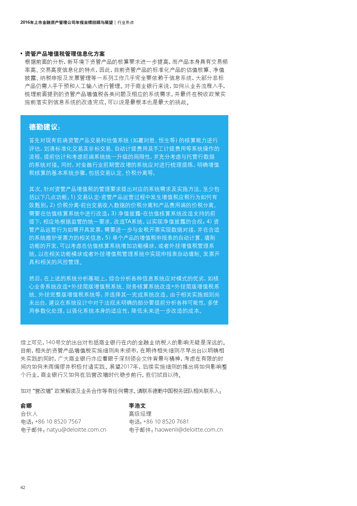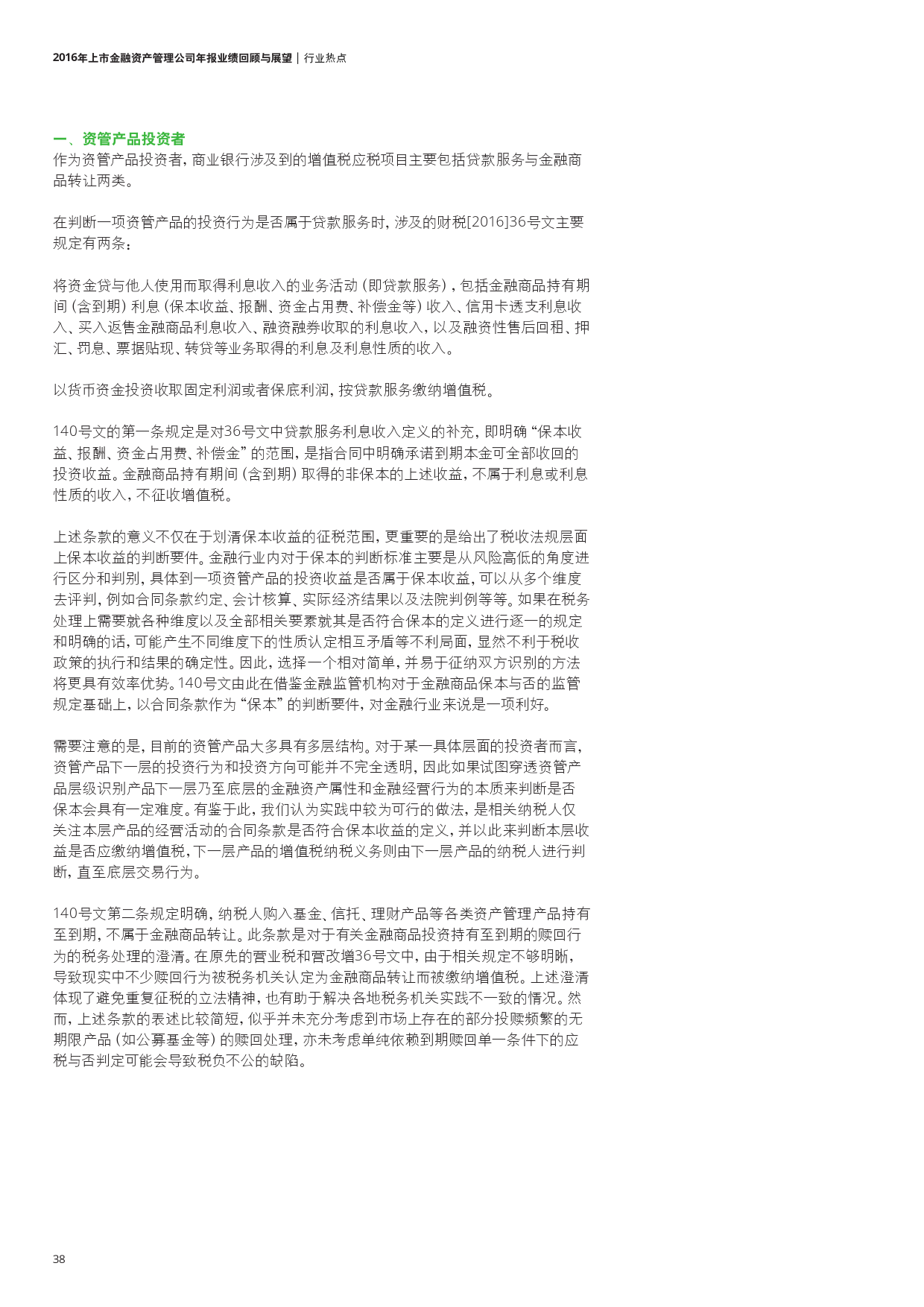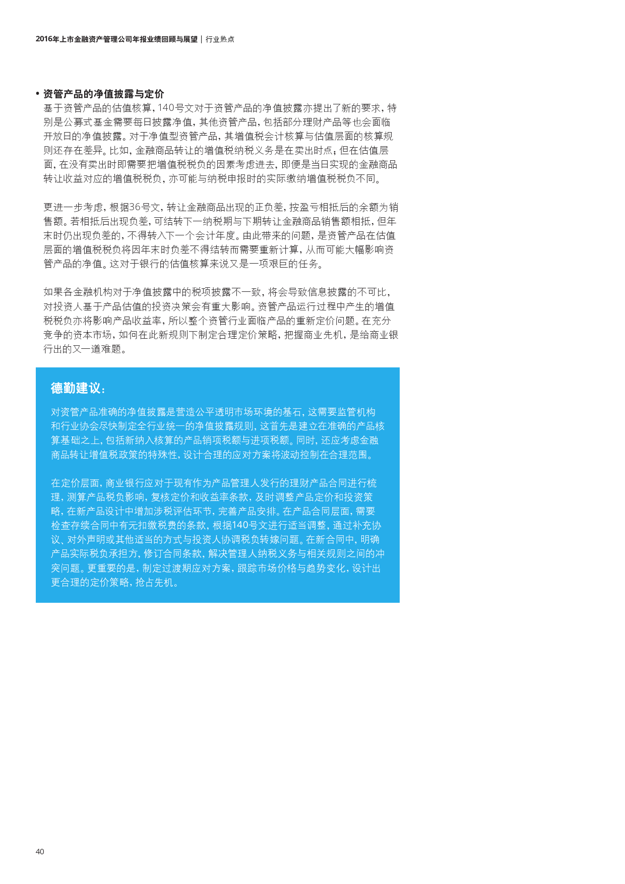 中国持续的经济和财经改革为主要金融资产管理公司创造了机遇与挑战。展望来年,德勤相信以下范畴会是中国金融资产管理行业的关注热点:第一,不良压力企稳,化解方式多元;第二,资产证券化驶入快车道;第三,金融行业增值税政策变化。