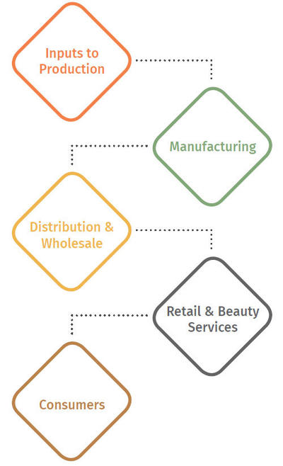 美妆和个护价值链共分为五个层次: