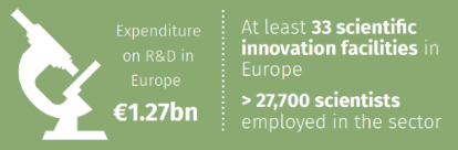 欧洲美妆行业每年的研发费用达到 12.7亿欧元,主要美妆企业每年将销售额的 1.5%~4.5%用于研发,有些甚至更多。在欧洲共有33个科学创新机构执行美妆、个护行业的研发任务。欧洲美容行业的各领域科学家人数达到了2.77万人。