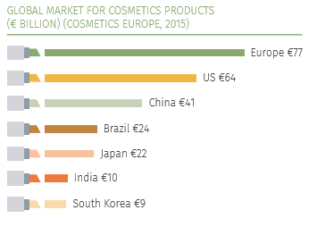 据欧洲美妆行业研究机构 Cosmetics Europe 公布的数据显示, 2016年,全球美妆市场总产值 2600亿欧元,欧洲市场总产值 770亿欧元。