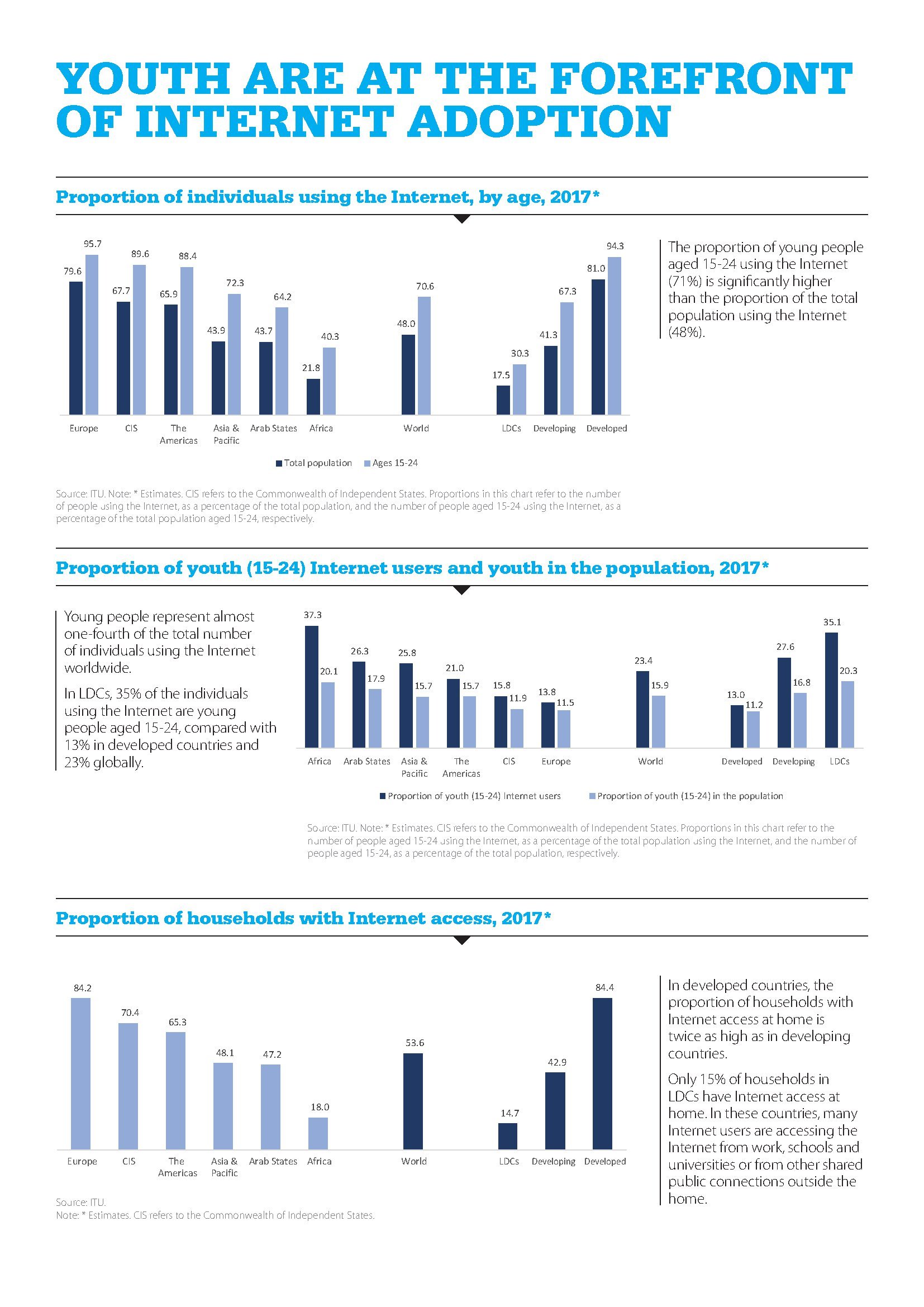 毫不奇怪,年轻人是互联网使用的前沿。今年,全球15-24岁人口中有70.6%使用互联网。