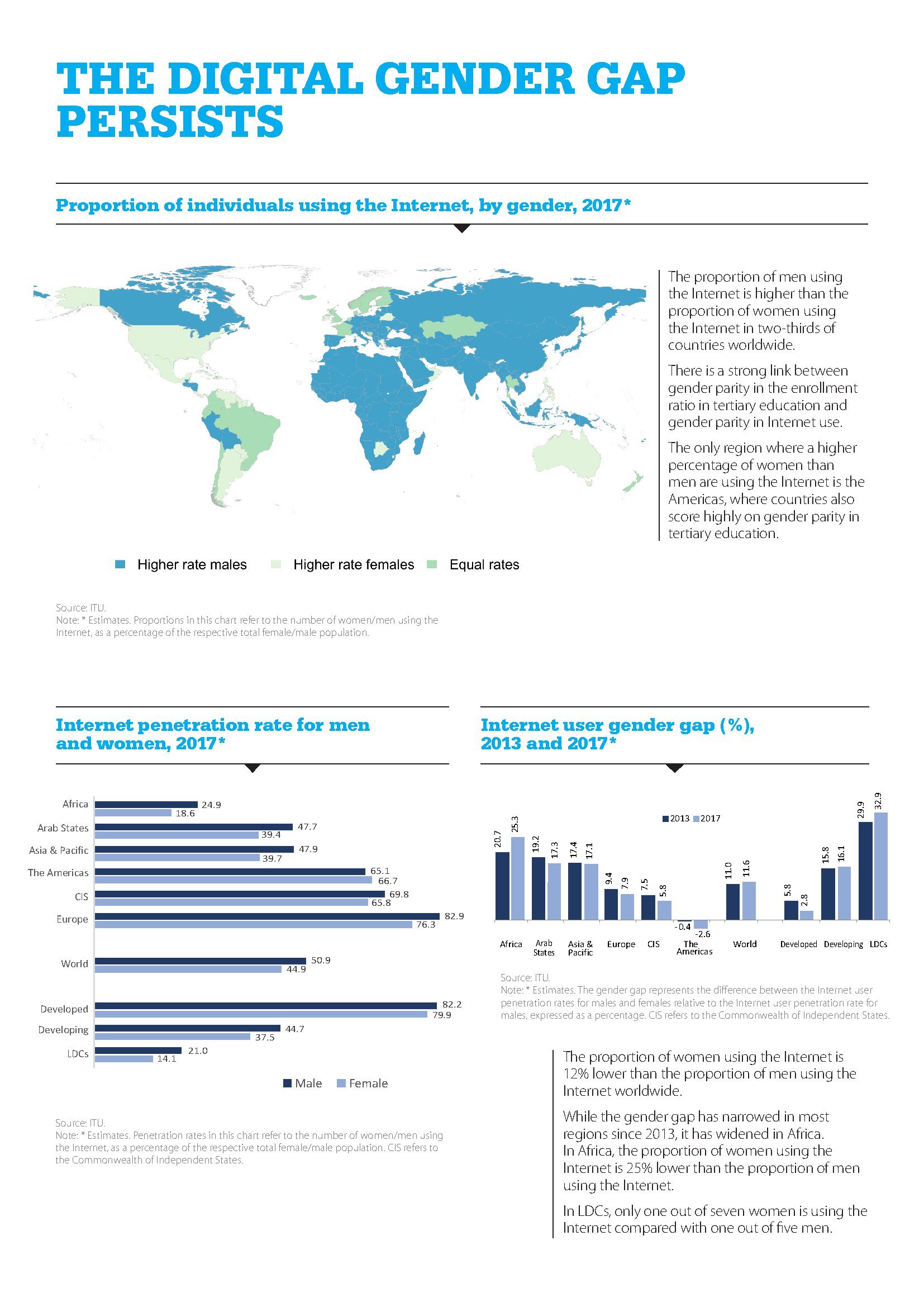 根据国际电信联盟的数据,在全球互联网用户中,女性的比例比男性低12%。除了美洲,其他地区互联网普及都存在性