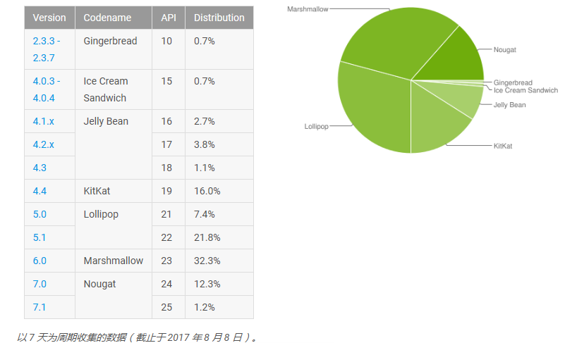 目前,Android系统各版本仍然比较分散。根据Android Developer Dashboard的最新数据,Android 6所占份额最高,但是仅有32.3%的Android手机运行的是Android 6。其他版本所占份额在0.7%到21.8%之间不等。