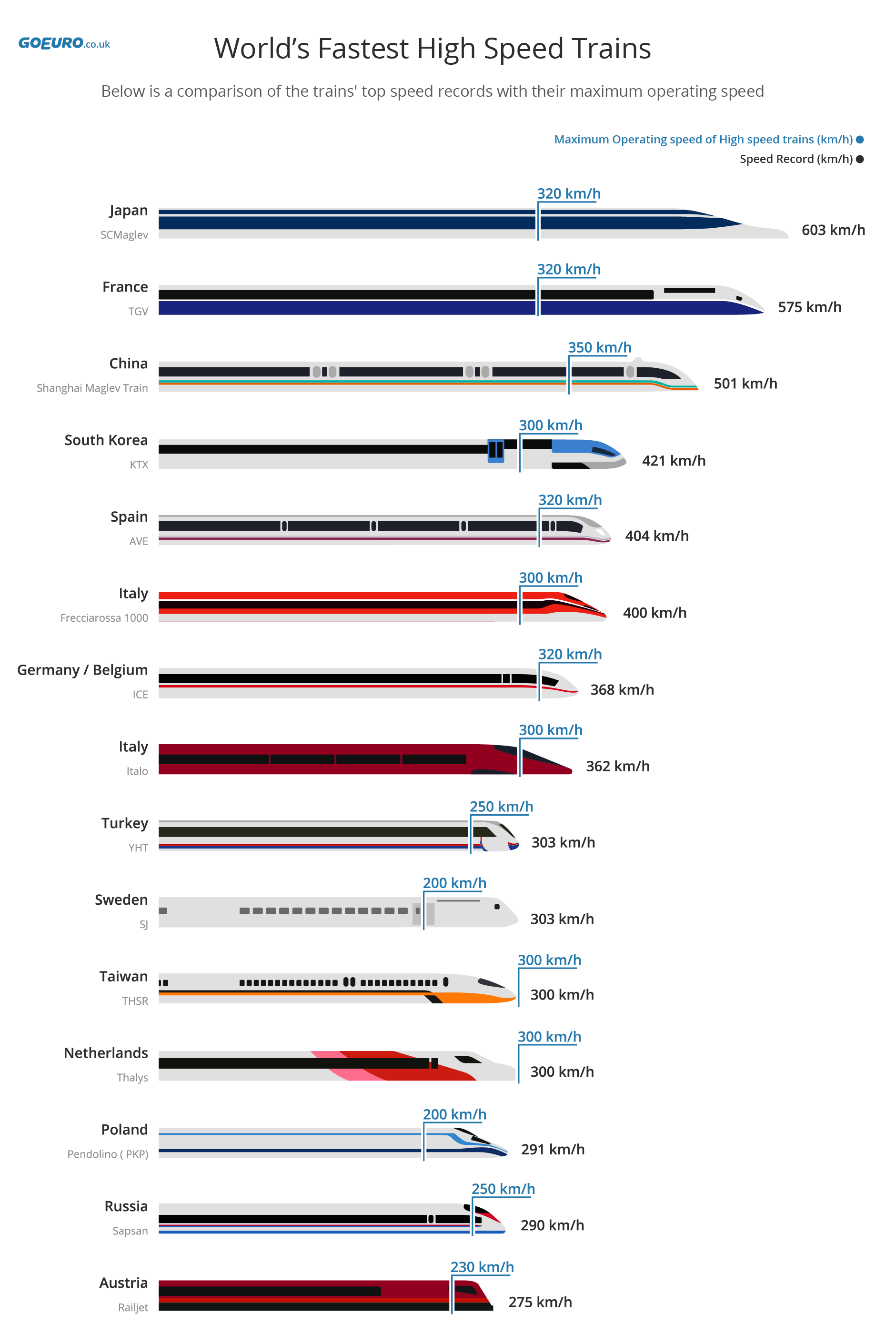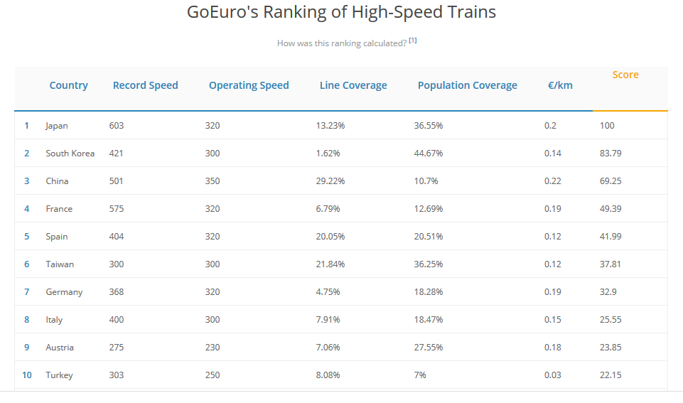 最近,GoEuro调查了全球高速铁路的发展情况。亚洲国家仍然是高速铁路的领先者。