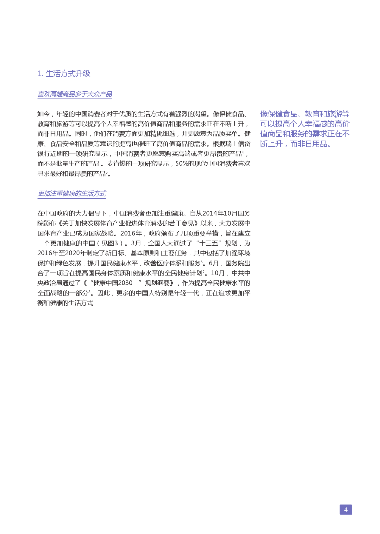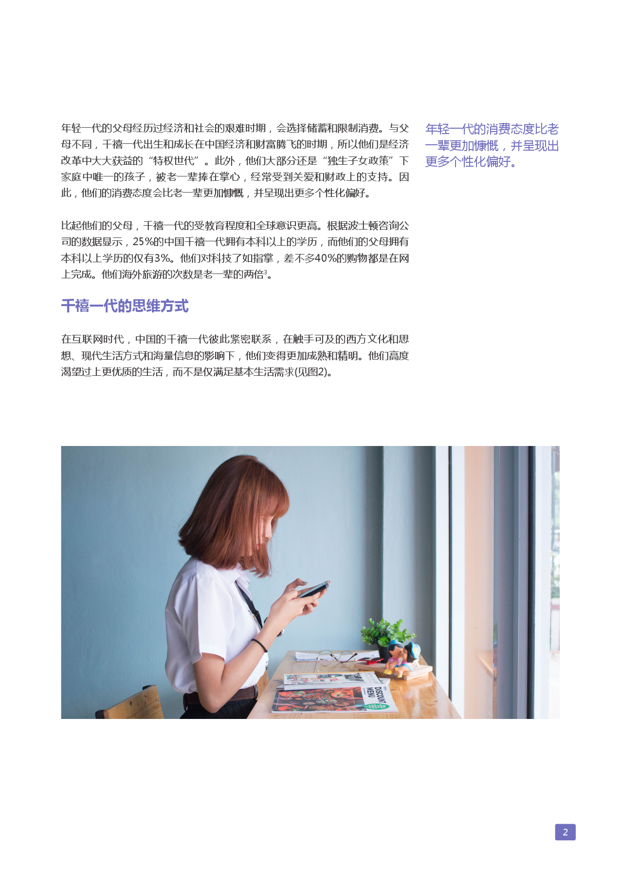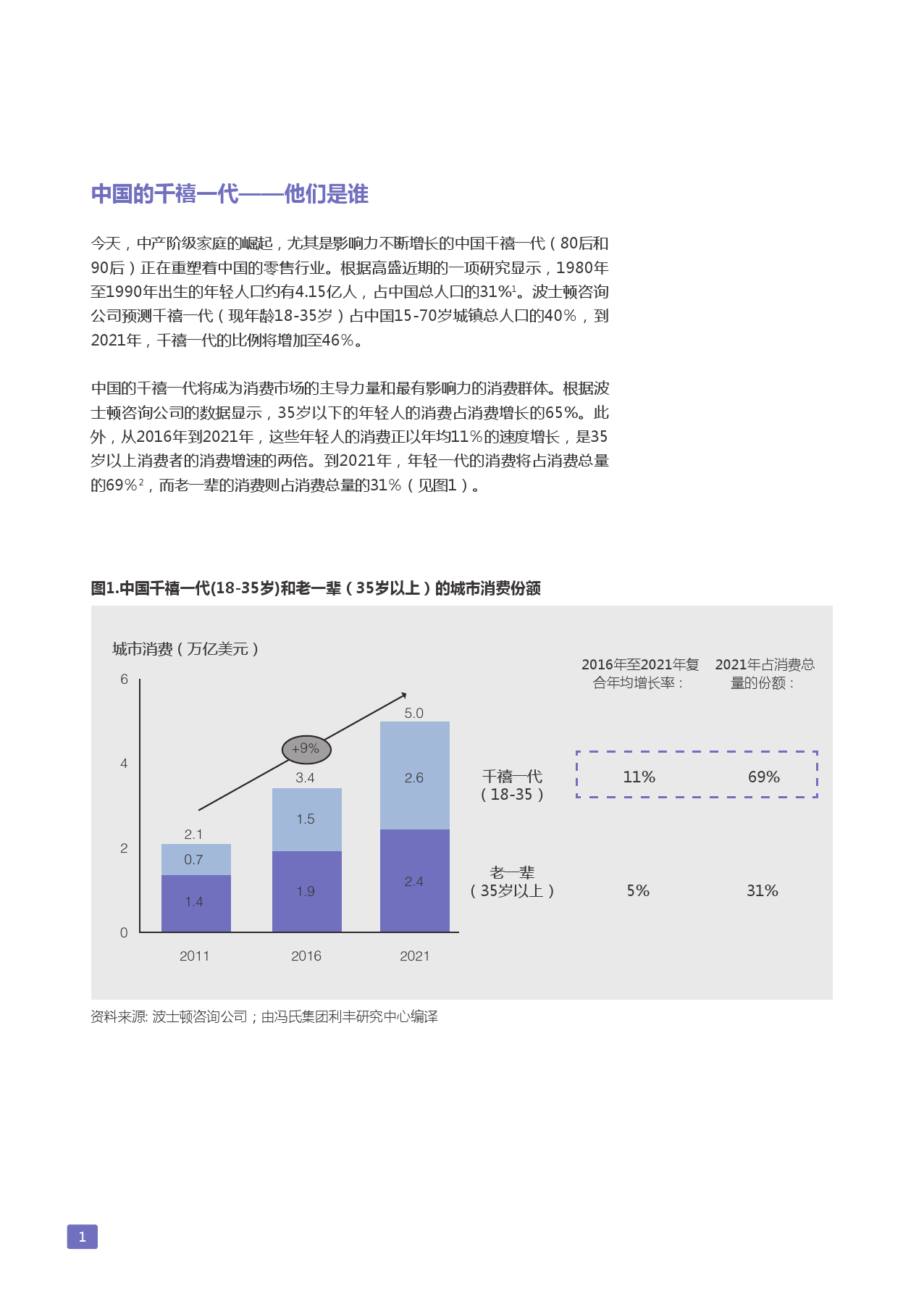 中国的千禧一代将成为消费市场的主导力量和最有影响力的消费群体。根据波 士顿咨询公司的数据显示,35岁以下的年轻人的消费占消费增长的65%。此 外,从2016年到2021年,这些年轻人的消费正以年均11%的速度增长,是35 岁以上消费者的消费增速的两倍。到2021年,年轻一代的消费将占消费总量 的69%2,而老一辈的消费则占消费总量的31%。