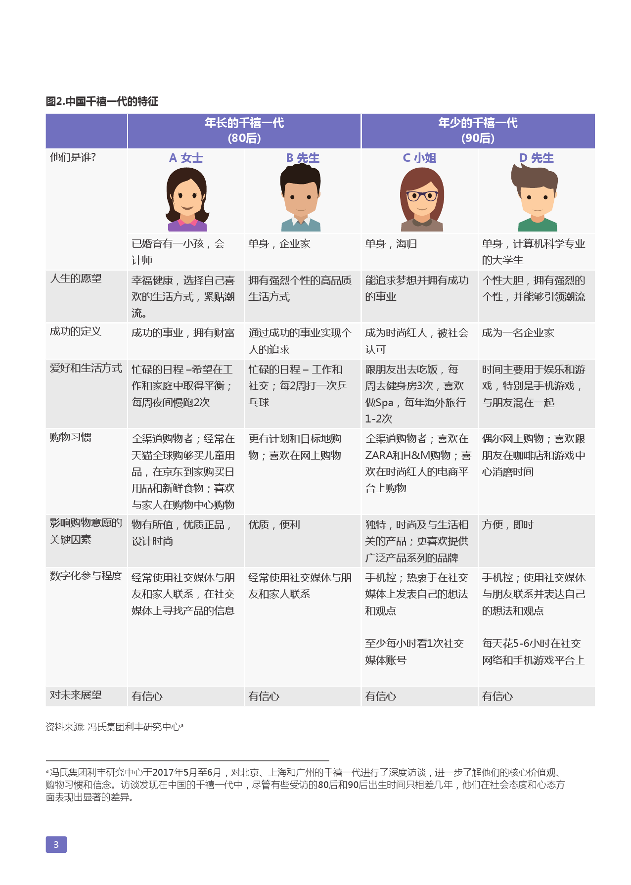 今天,中产阶级家庭的崛起,尤其是影响力不断增长的中国千禧一代(80后和 90后)正在重塑着中国的零售行业。根据高盛近期的一项研究显示,1980年 至1990年出生的年轻人口约有4.15亿人,占中国总人口的31%1。波士顿咨询 公司预测千禧一代(现年龄18-35岁)占中国15-70岁城镇总人口的40%,到 2021年,千禧一代的比例将增加至46%。