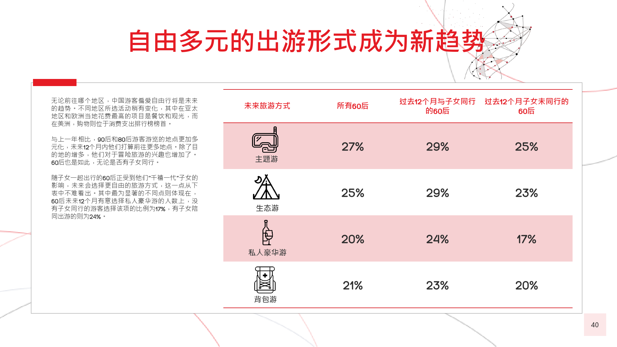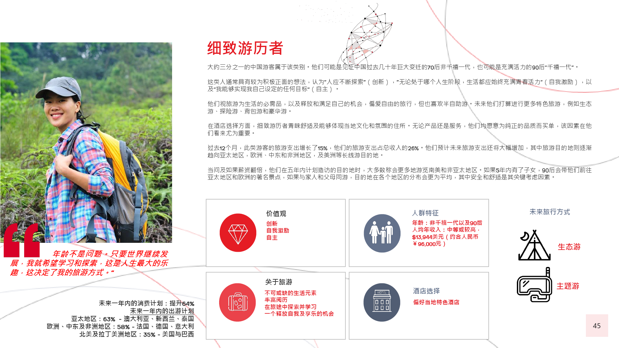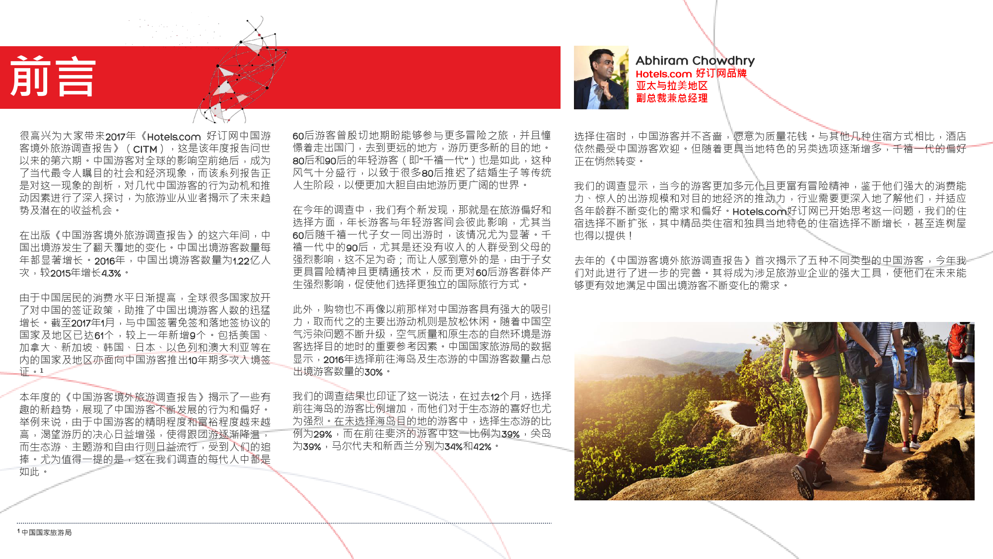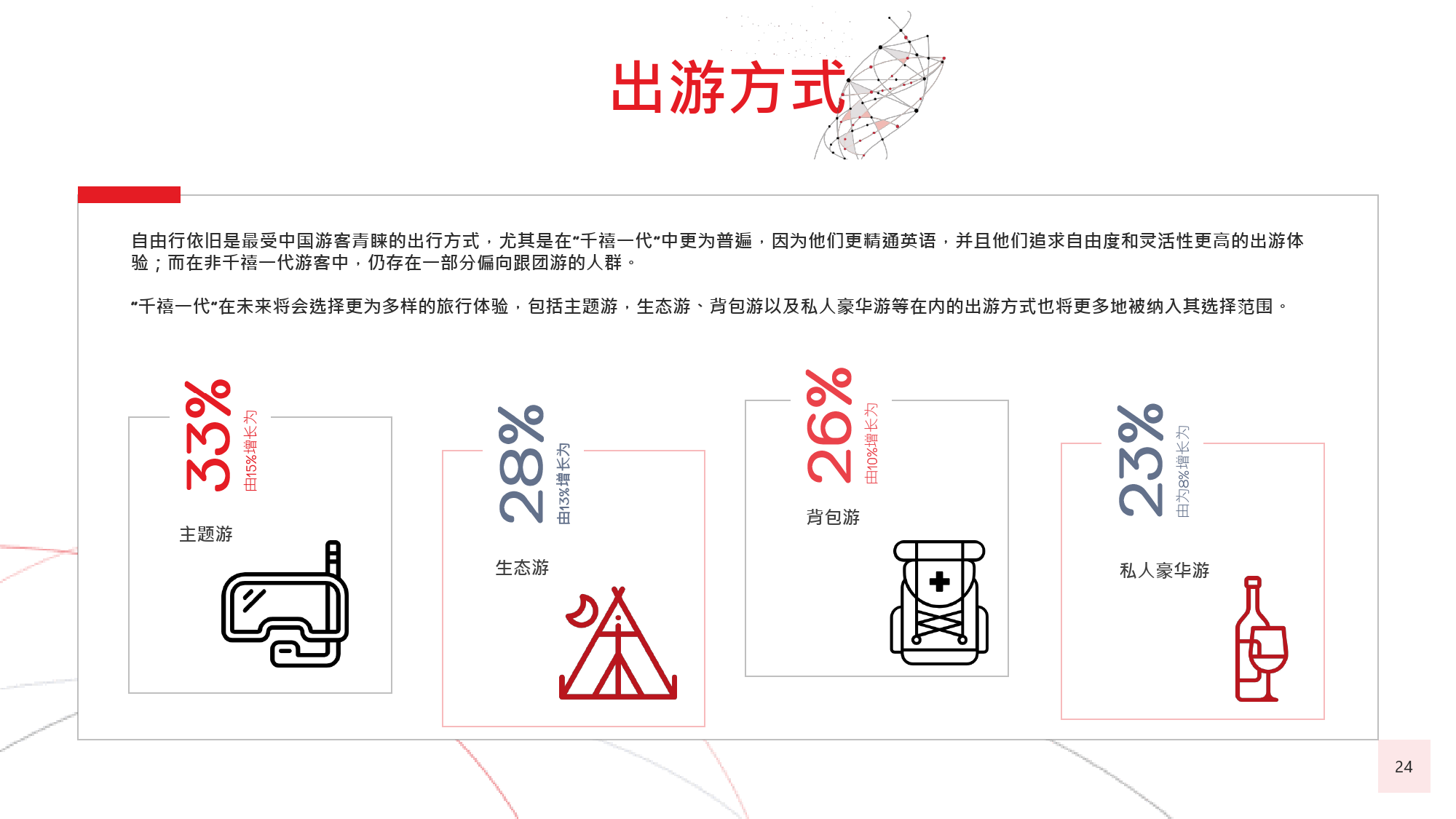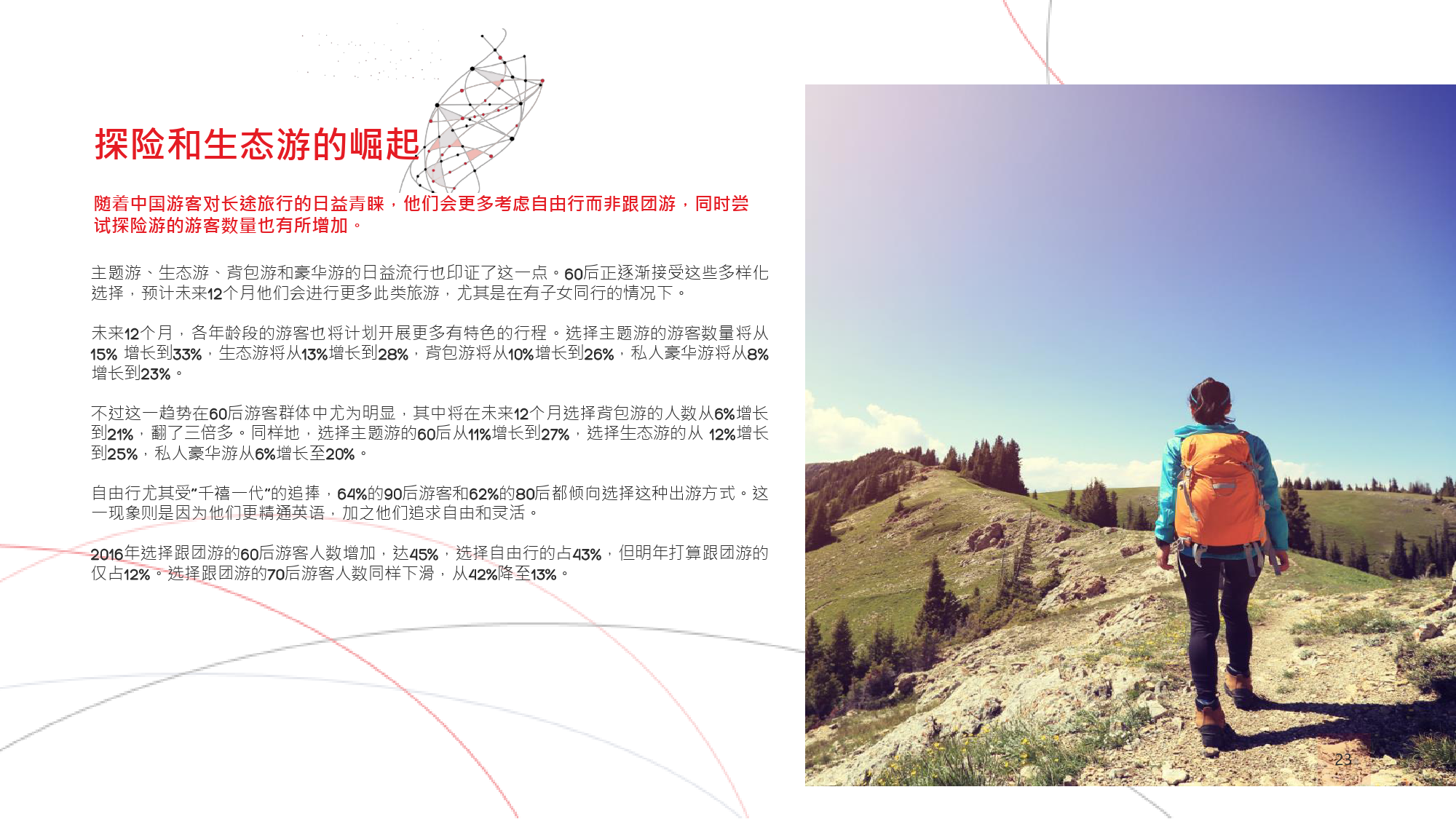 本年度的《中国游客境外旅游调查报告》揭示了一些有 趣的新趋势,展现了中国游客不断发展的行为和偏好。 举例来说,由于中国游客的精明程度和富裕程度越来越 高,渴望游历的决心日益增强,使得跟团游逐渐降温, 而生态游、主题游和自由行则日益流行,受到人们的追 捧。尤为值得一提的是,这在我们调查的每代人中都是 如此。