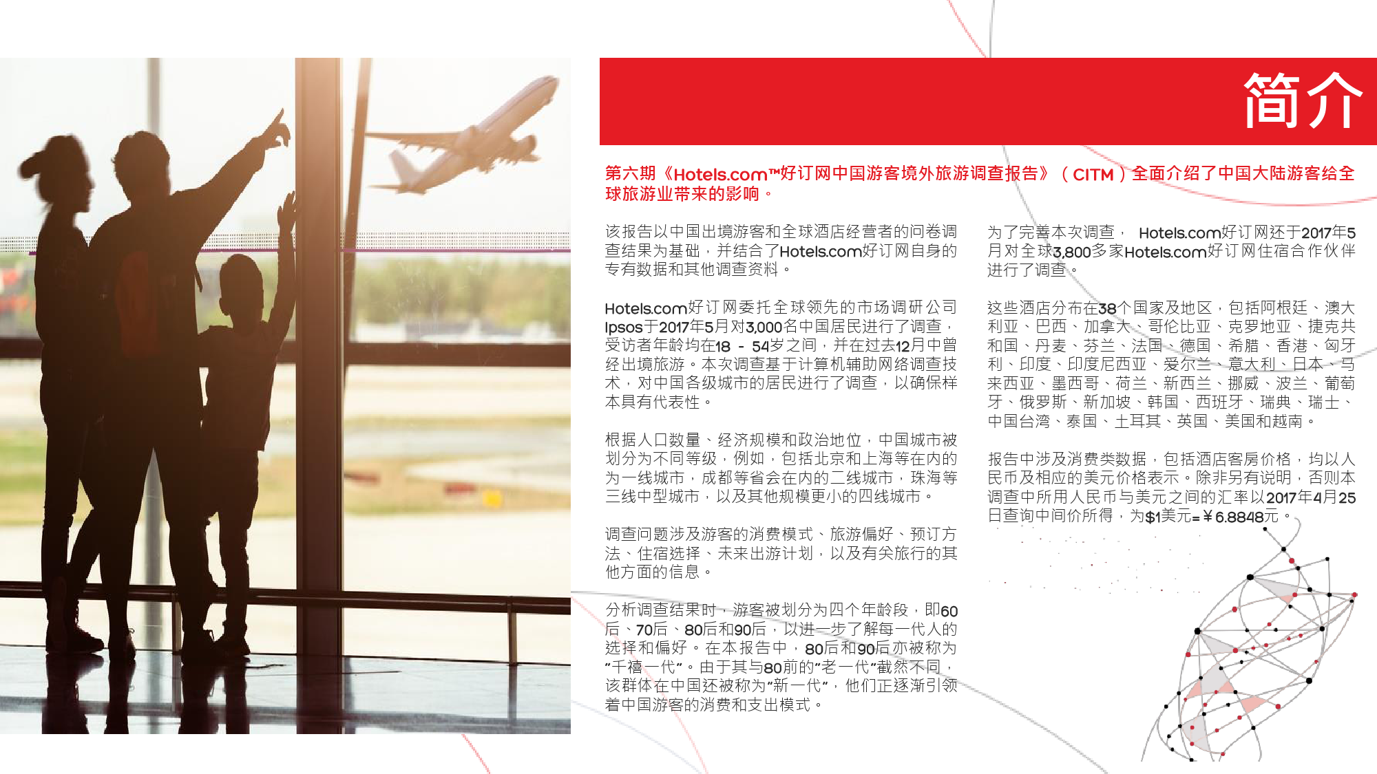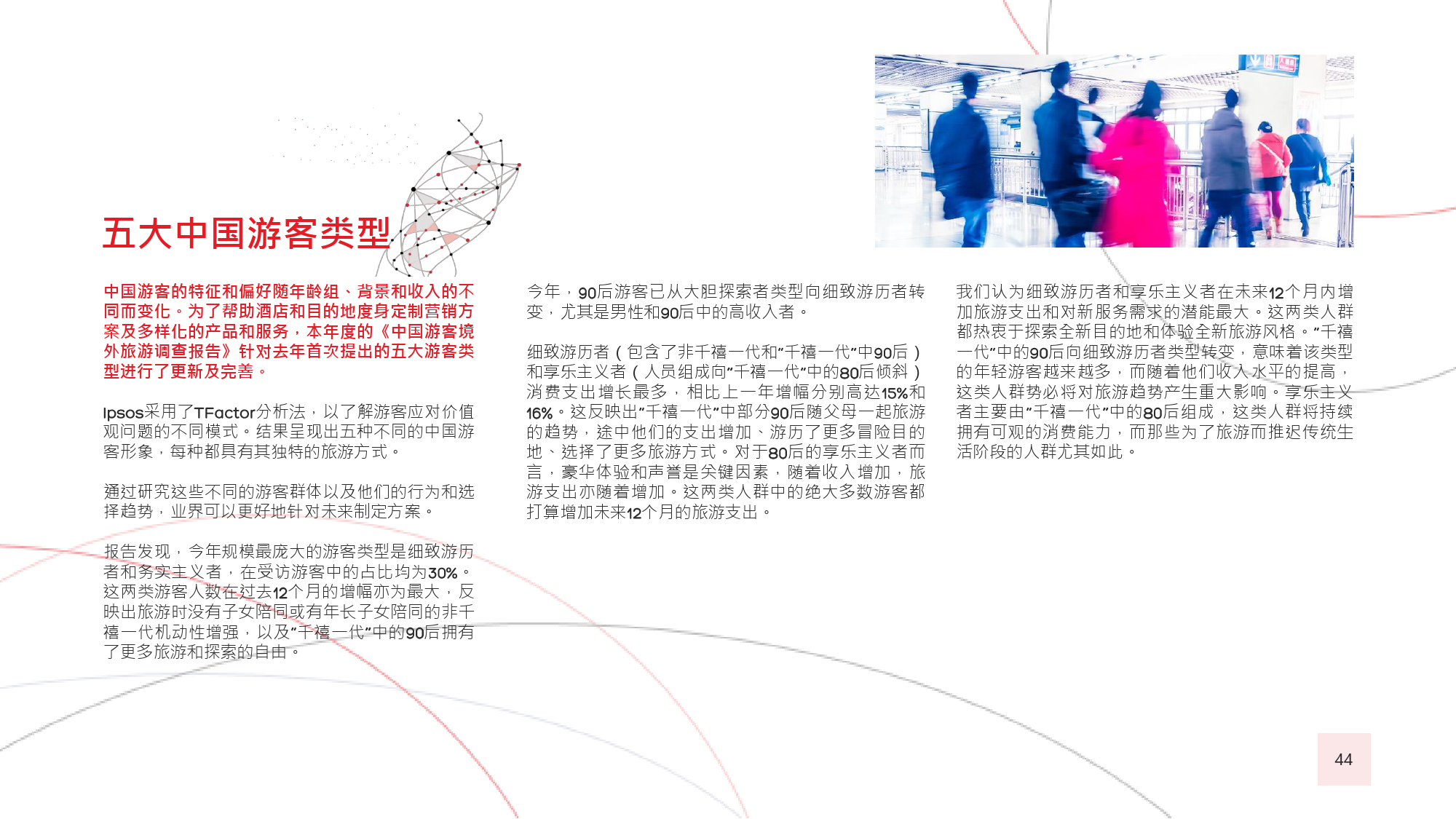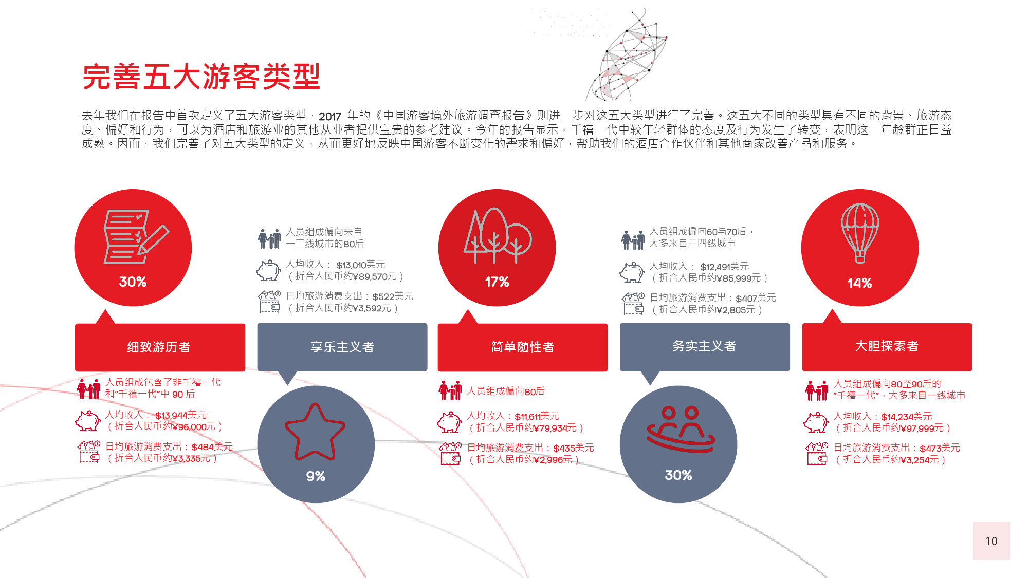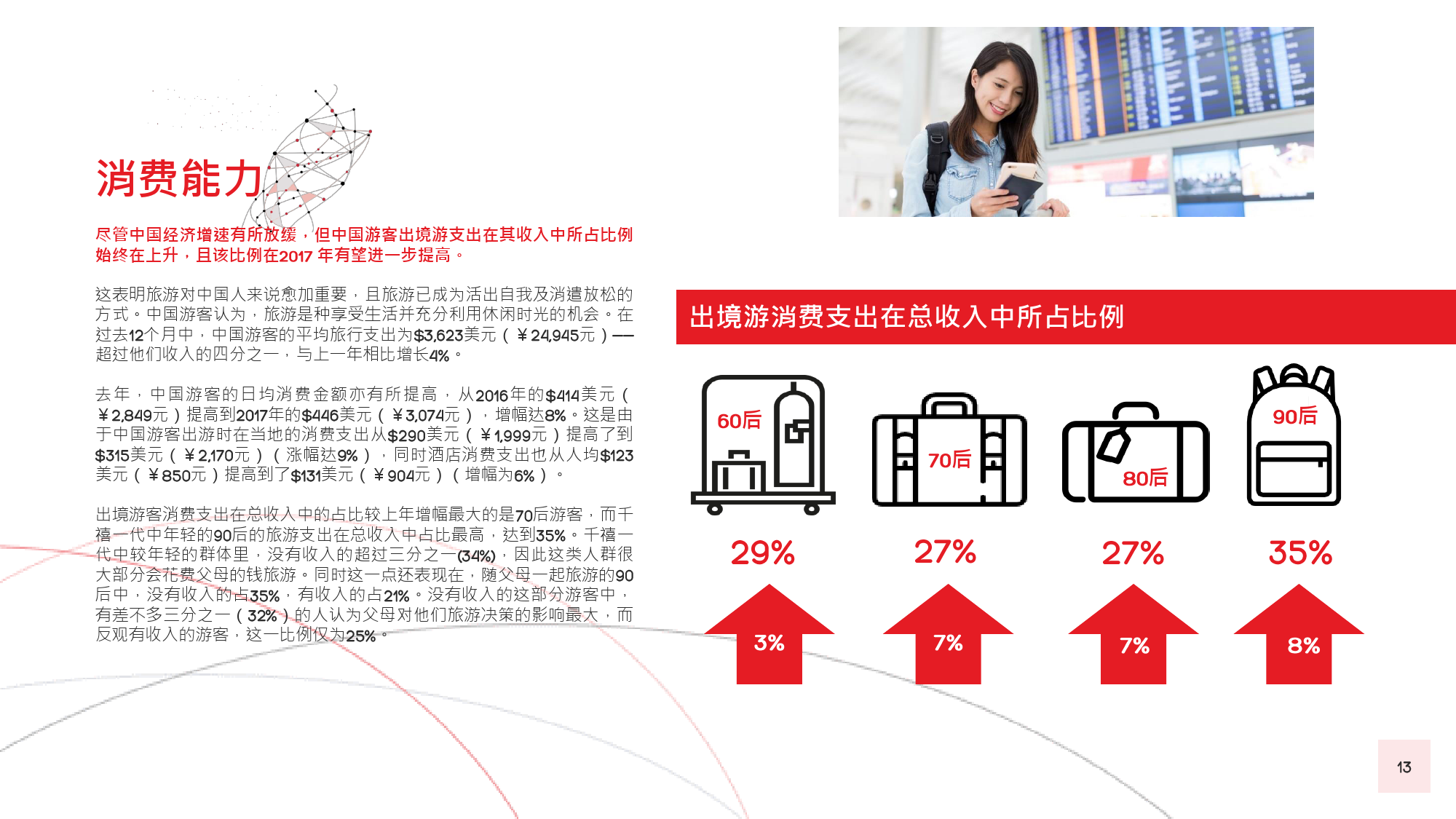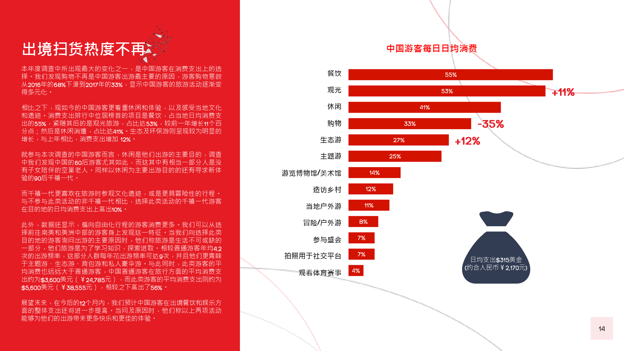 本年度的《中国游客境外旅游调查报告》揭示了一些有 趣的新趋势,展现了中国游客不断发展的行为和偏好。 举例来说,由于中国游客的精明程度和富裕程度越来越 高,渴望游历的决心日益增强,使得跟团游逐渐降温, 而生态游、主题游和自由行则日益流行,受到人们的追 捧。尤为值得一提的是,这在我们调查的每代人中都是 如此。