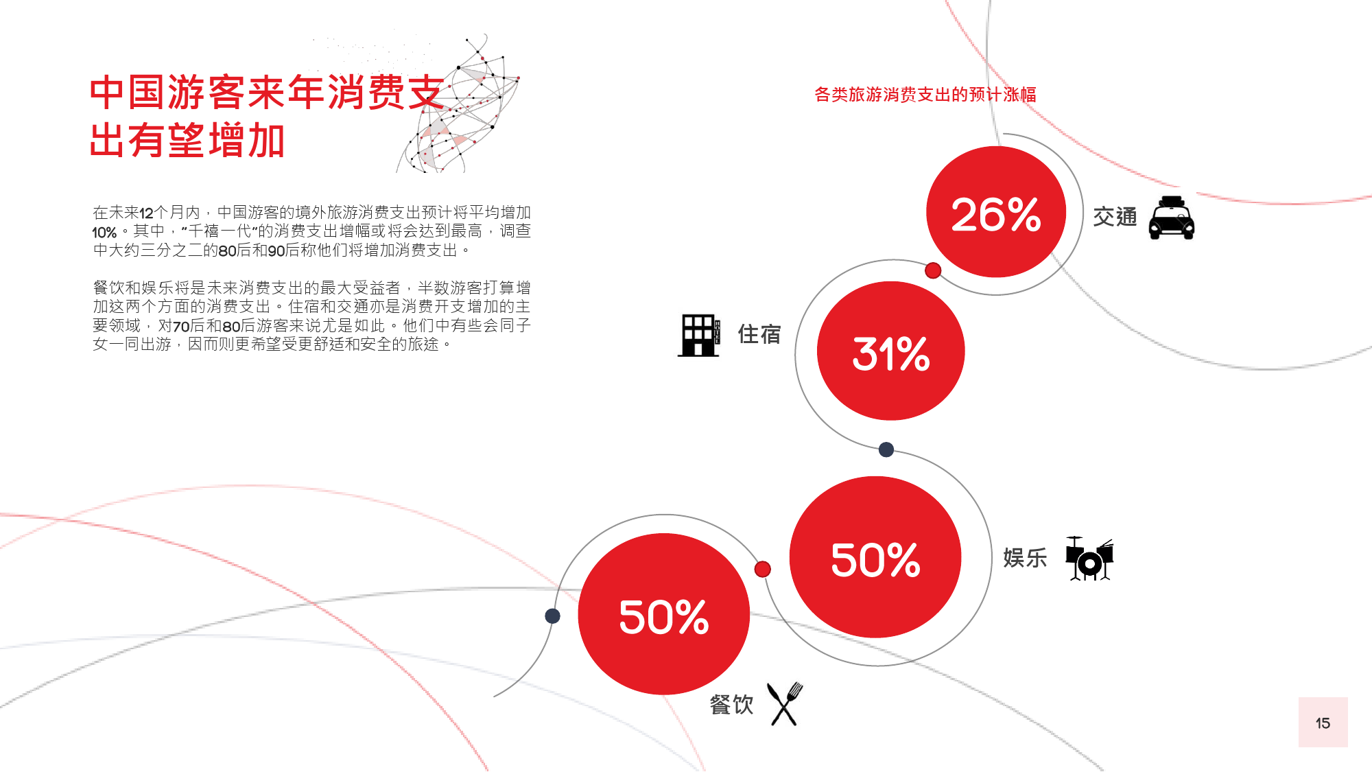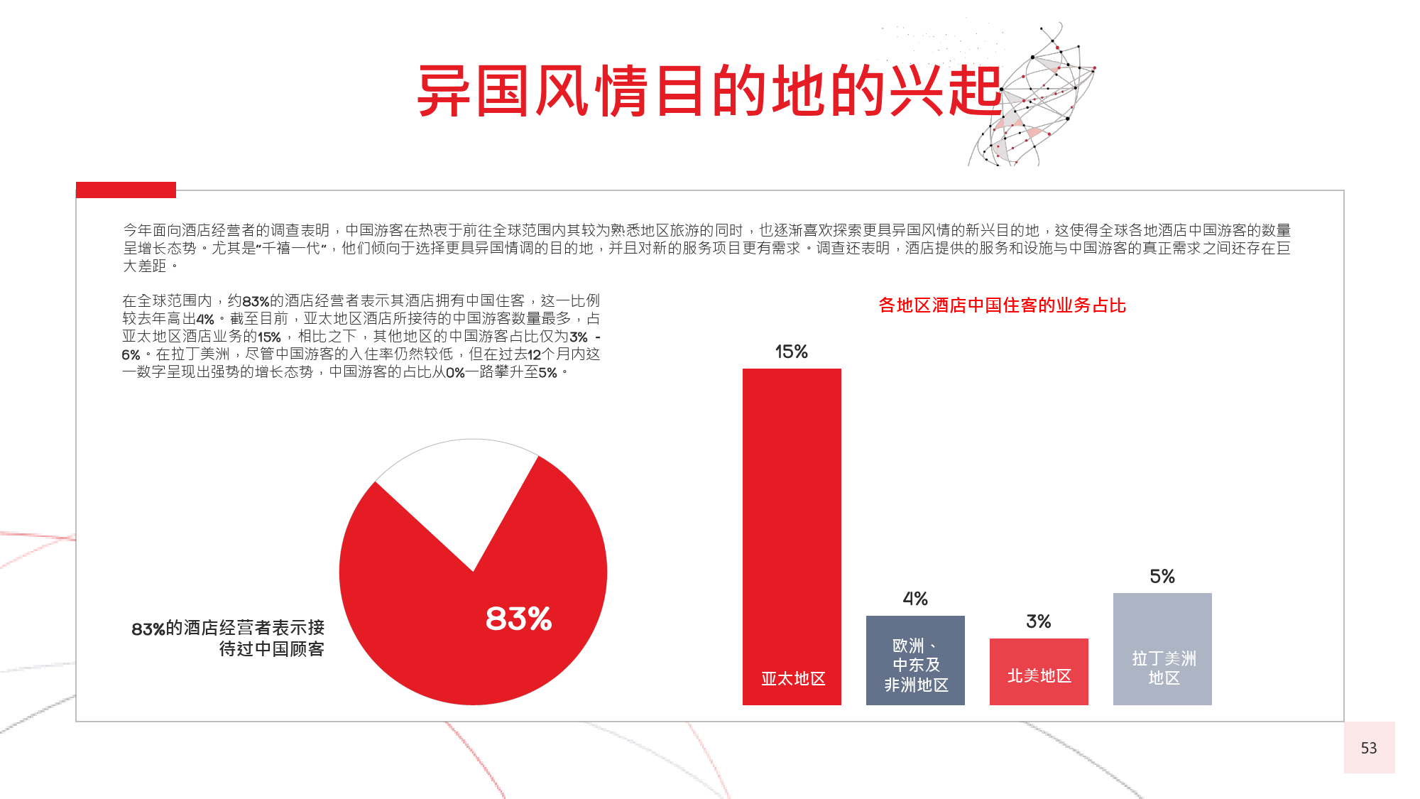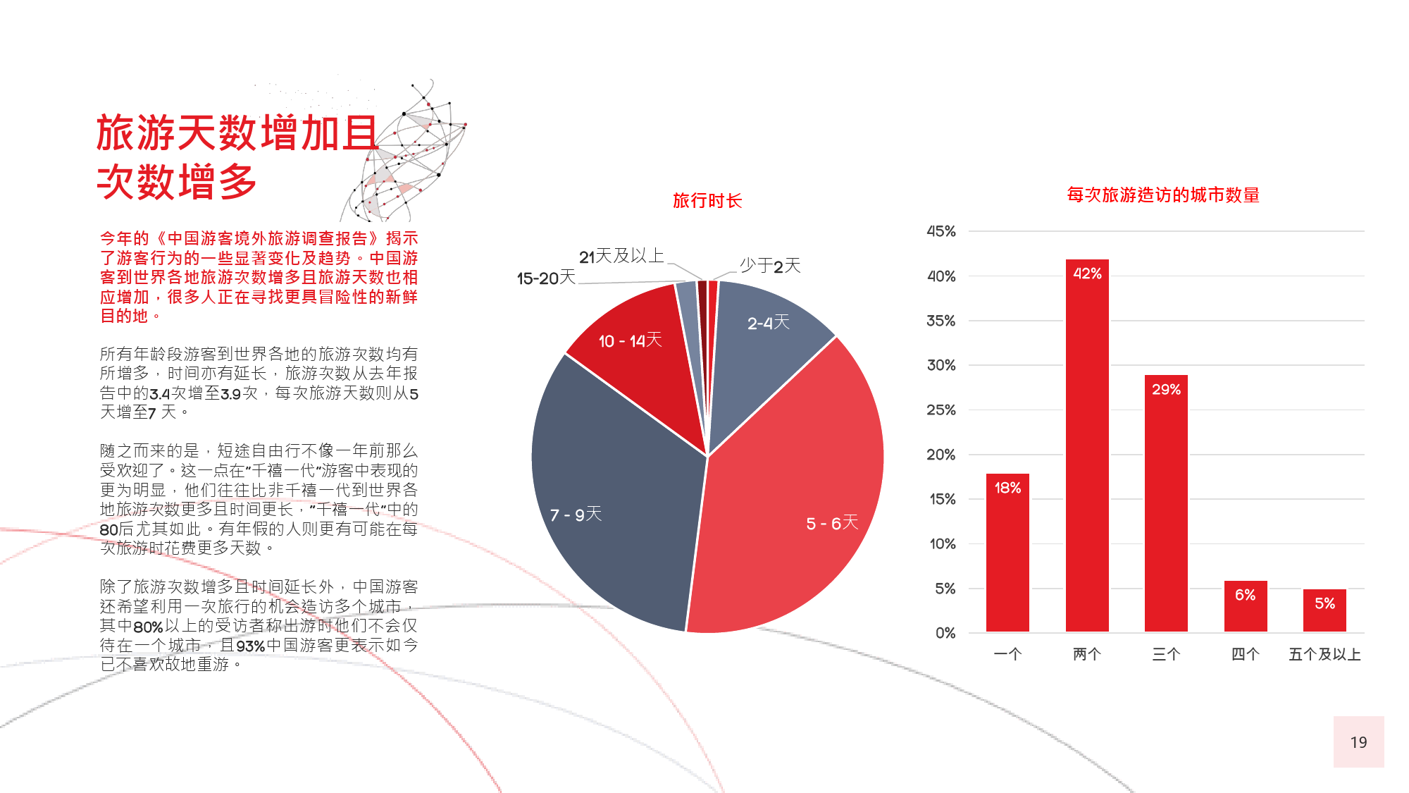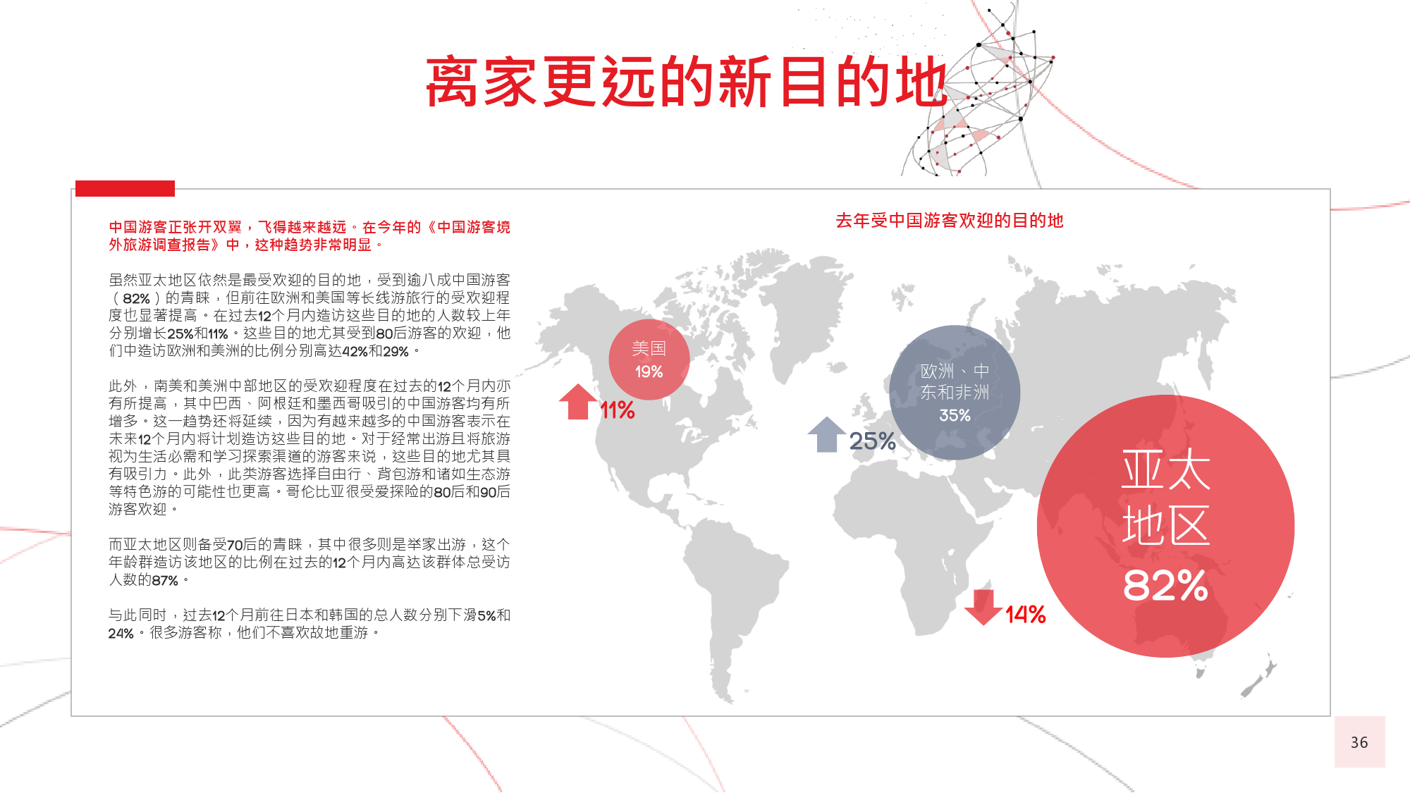 本年度的《中国游客境外旅游调查报告》揭示了一些有 趣的新趋势,展现了中国游客不断发展的行为和偏好。 举例来说,由于中国游客的精明程度和富裕程度越来越 高,渴望游历的决心日益增强,使得跟团游逐渐降温, 而生态游、主题游和自由行则日益流行,受到人们的追 捧。尤为值得一提的是,这在我们调查的每代人中都是 如此。