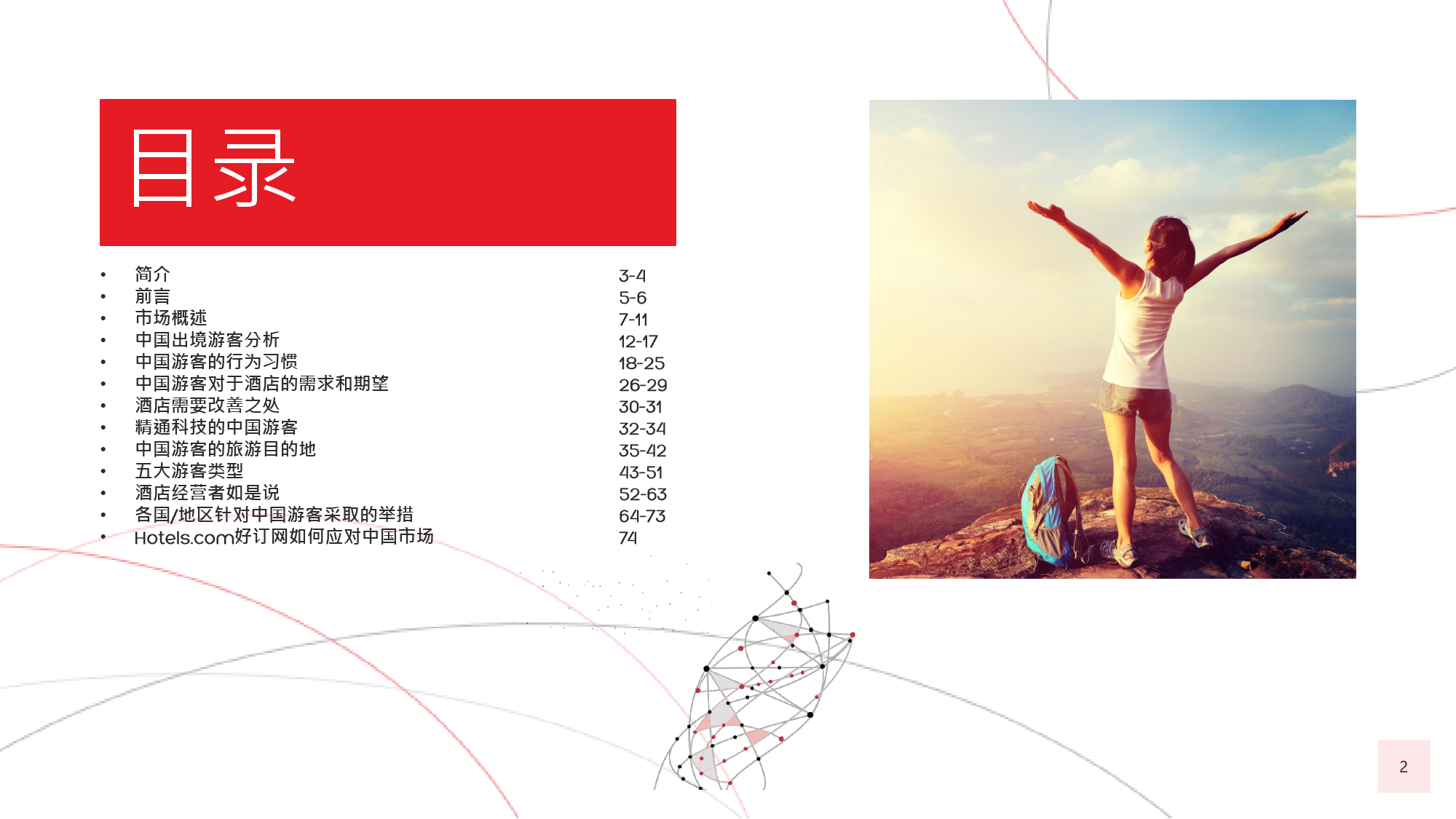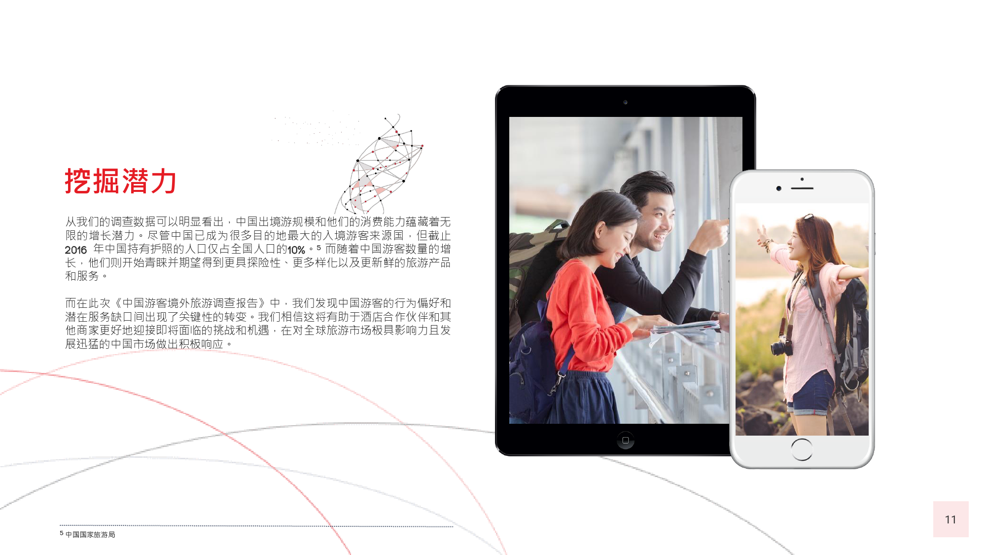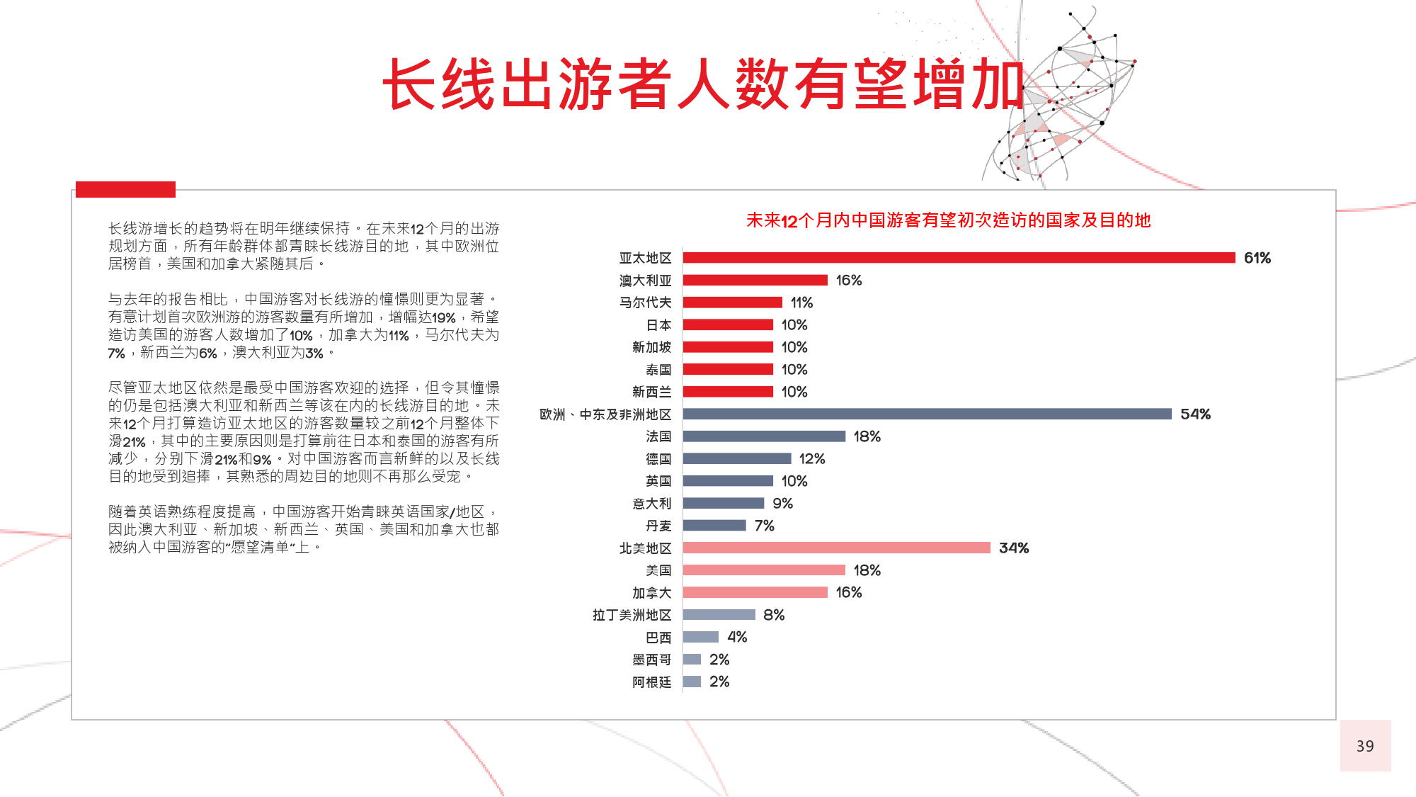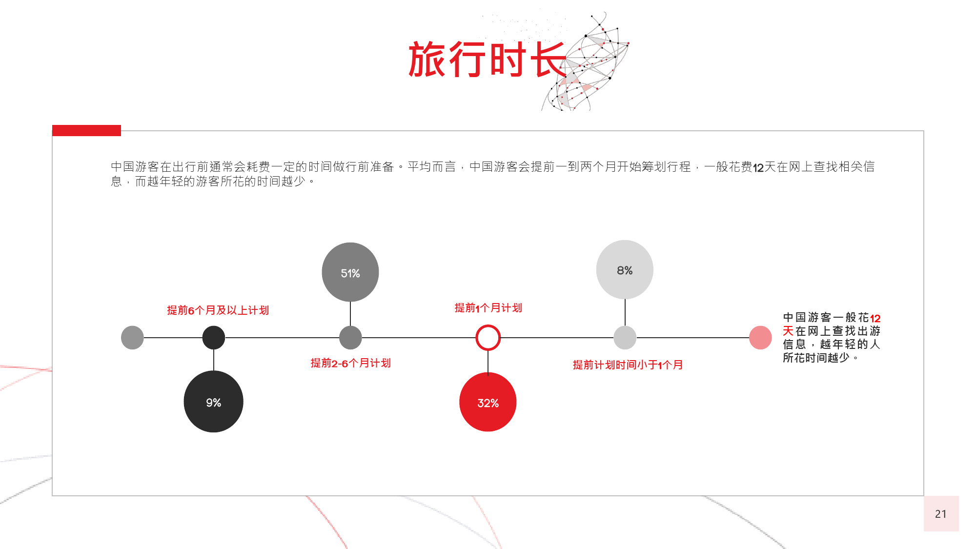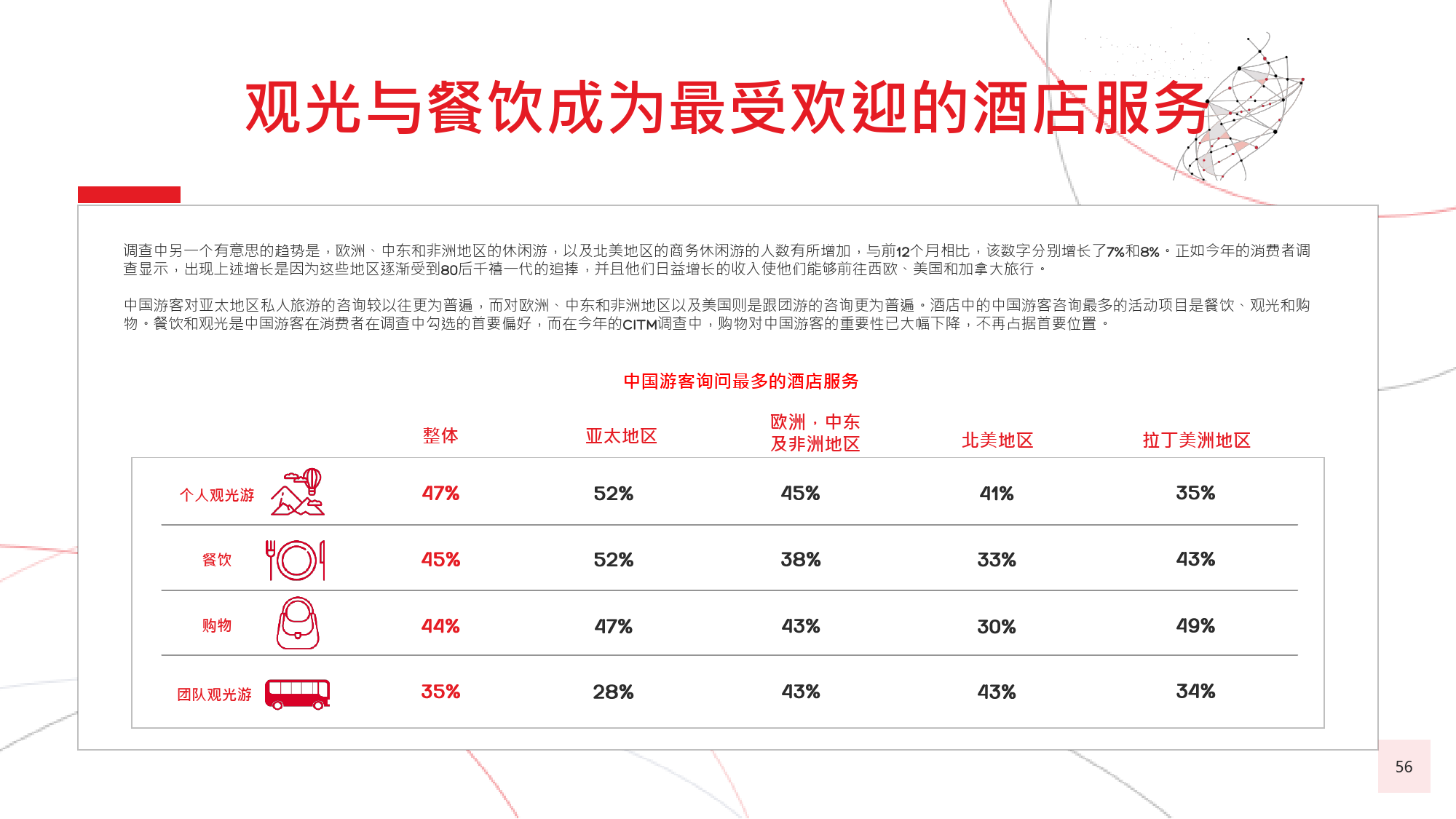 本年度的《中国游客境外旅游调查报告》揭示了一些有 趣的新趋势,展现了中国游客不断发展的行为和偏好。 举例来说,由于中国游客的精明程度和富裕程度越来越 高,渴望游历的决心日益增强,使得跟团游逐渐降温, 而生态游、主题游和自由行则日益流行,受到人们的追 捧。尤为值得一提的是,这在我们调查的每代人中都是 如此。