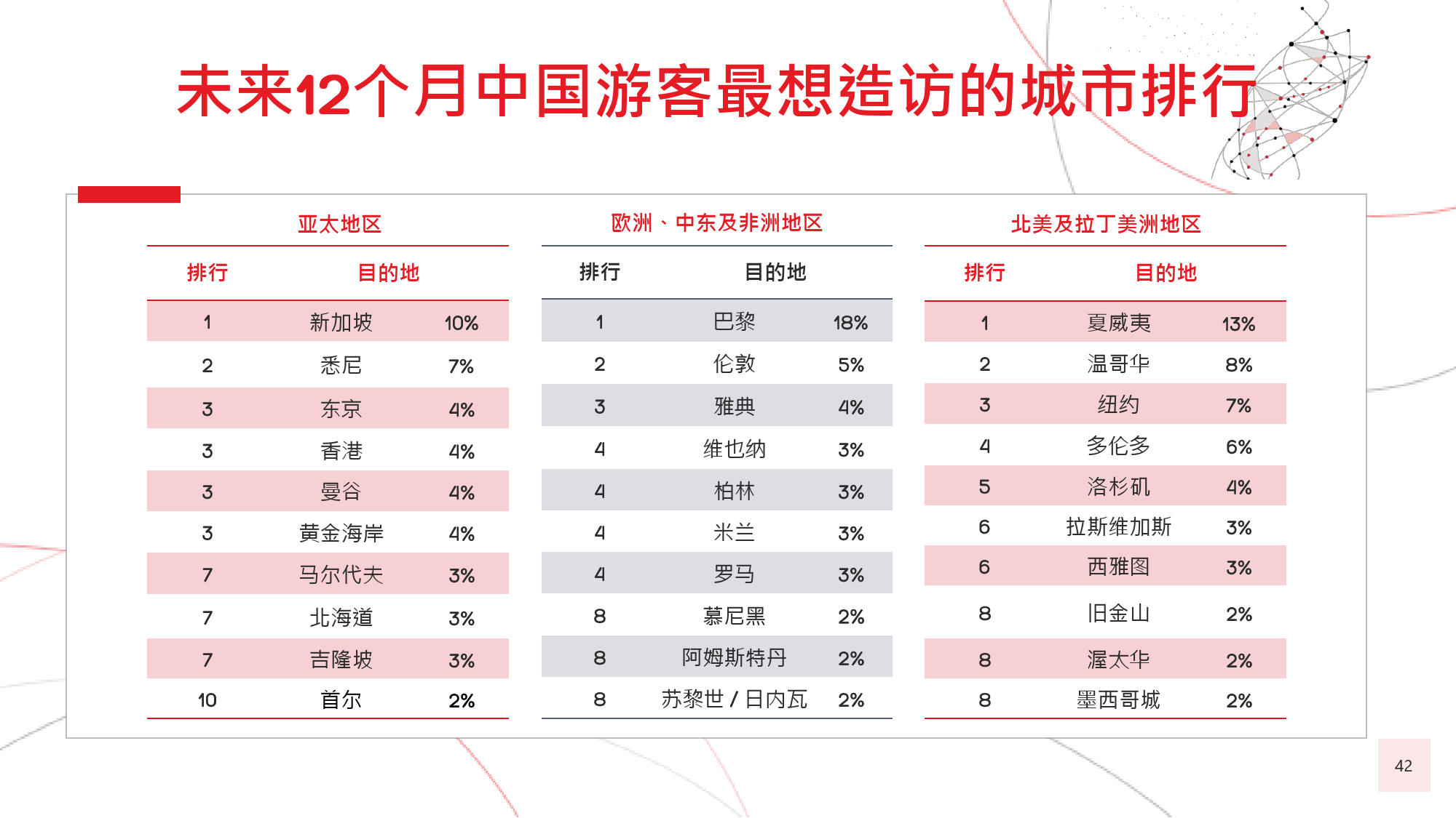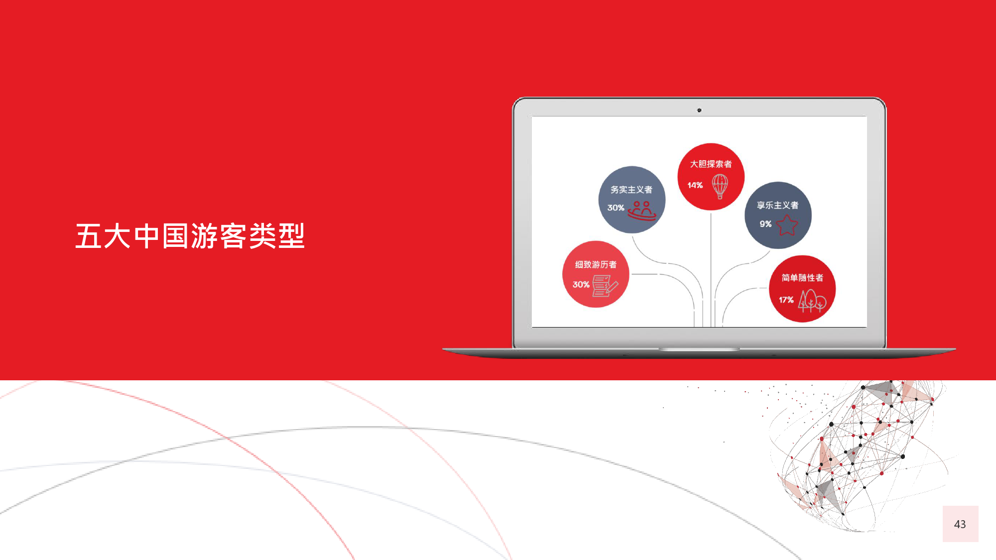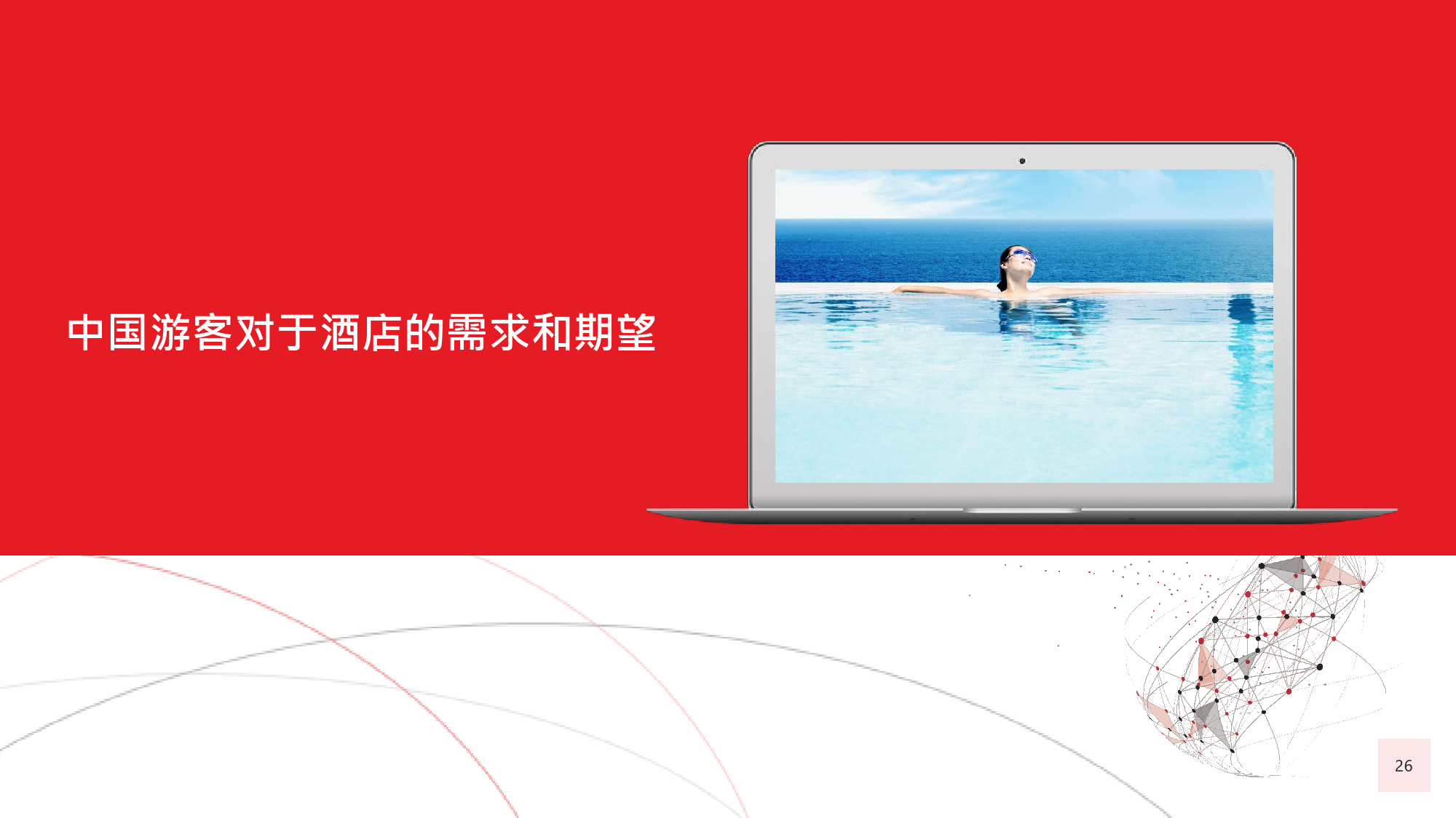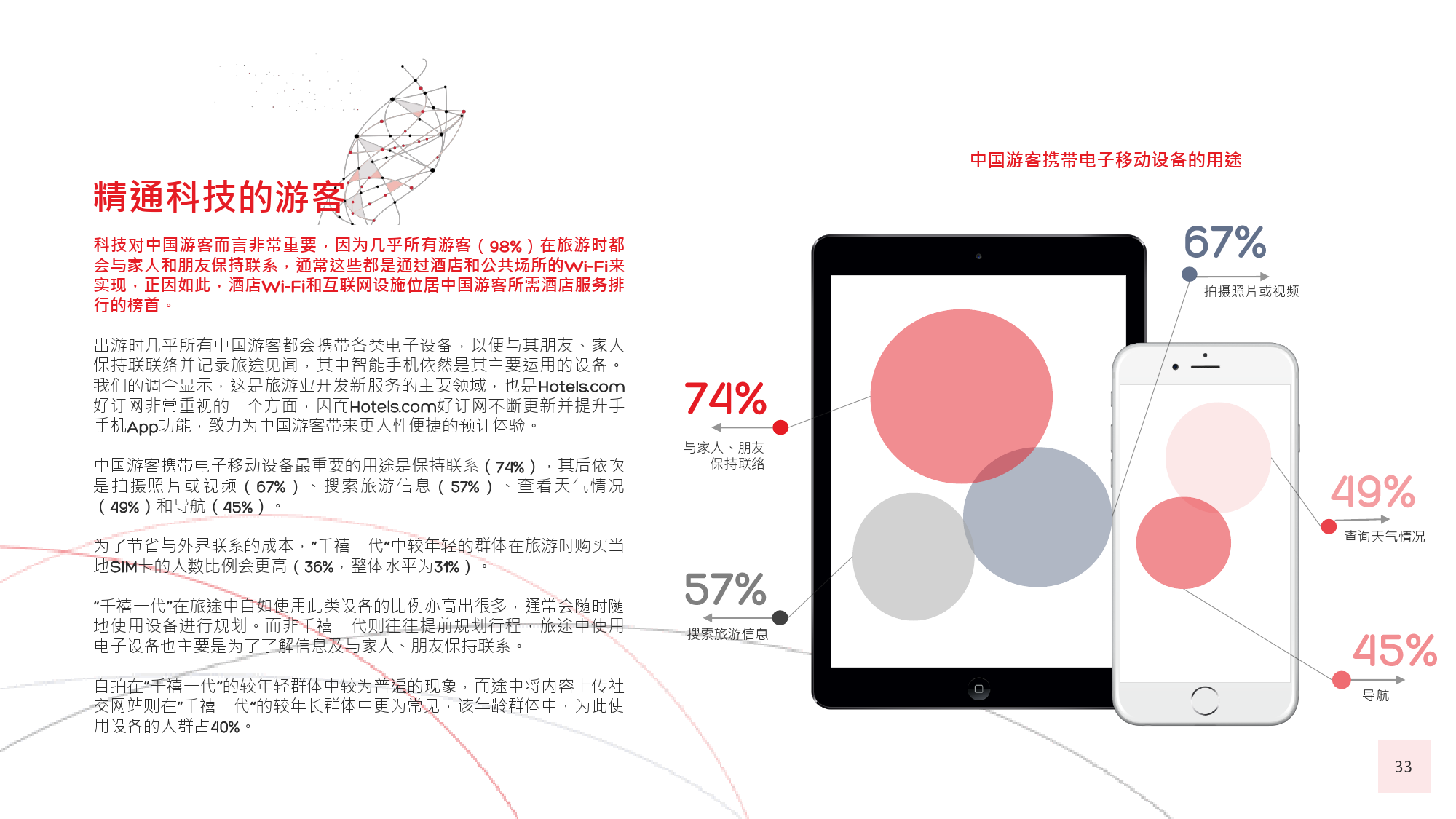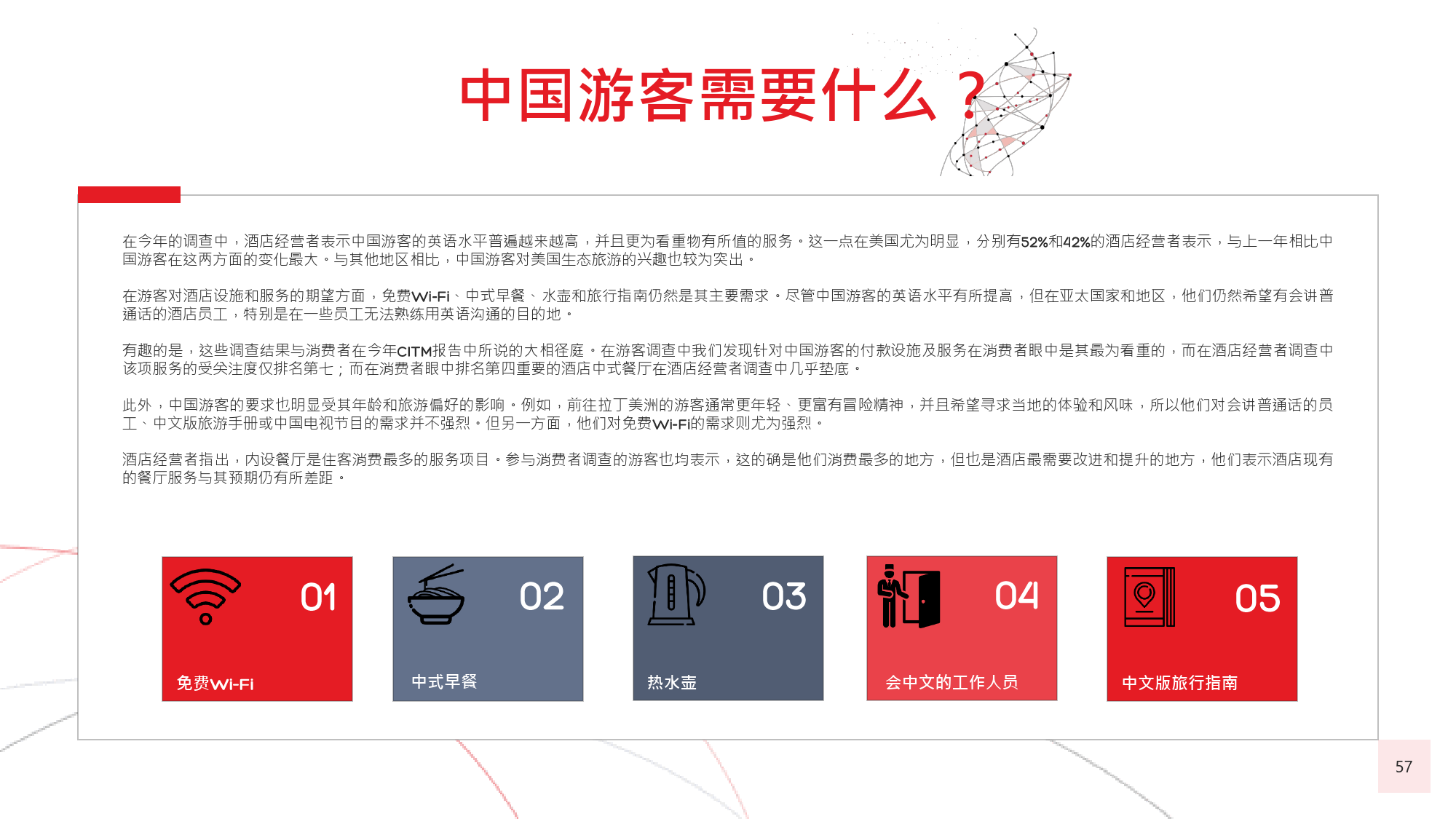 本年度的《中国游客境外旅游调查报告》揭示了一些有 趣的新趋势,展现了中国游客不断发展的行为和偏好。 举例来说,由于中国游客的精明程度和富裕程度越来越 高,渴望游历的决心日益增强,使得跟团游逐渐降温, 而生态游、主题游和自由行则日益流行,受到人们的追 捧。尤为值得一提的是,这在我们调查的每代人中都是 如此。