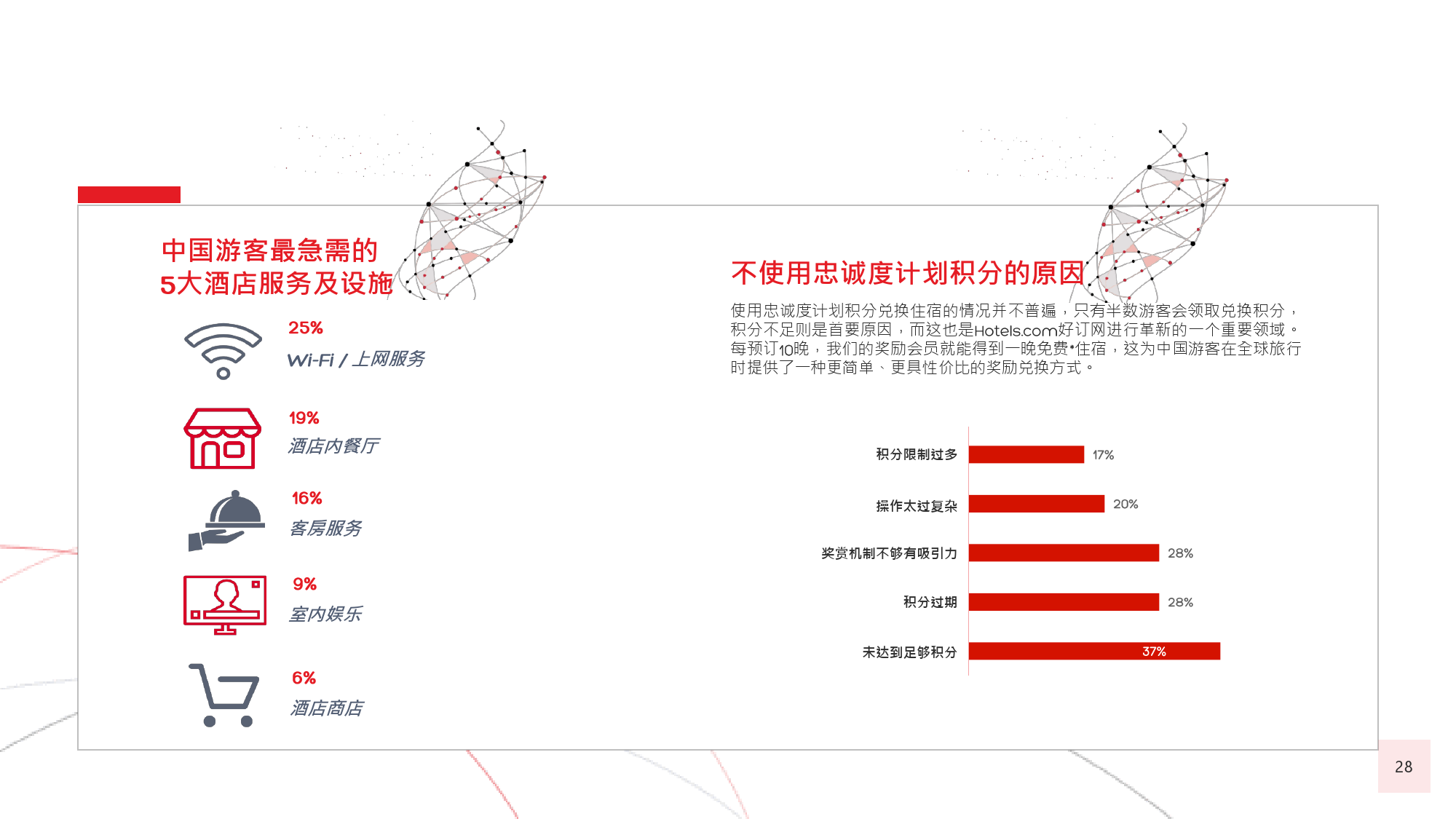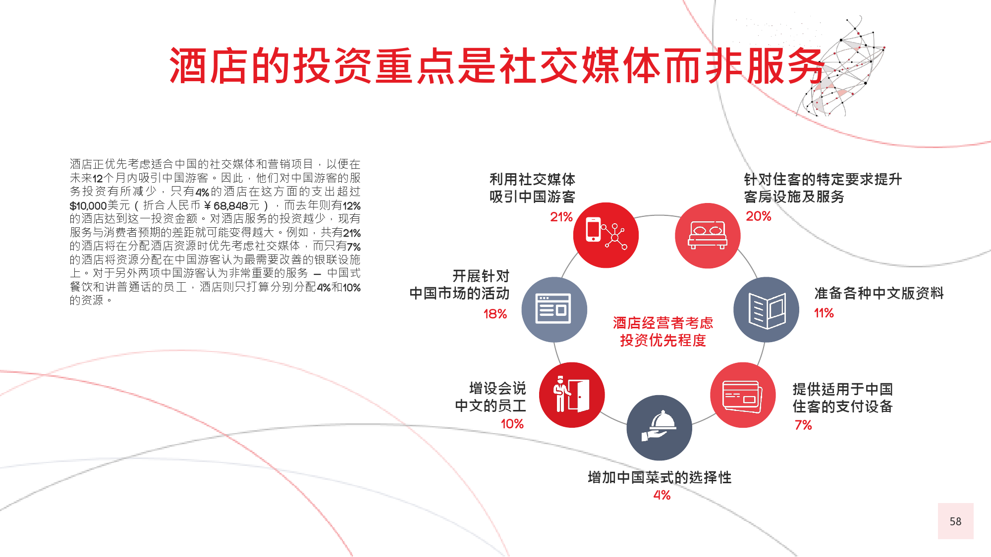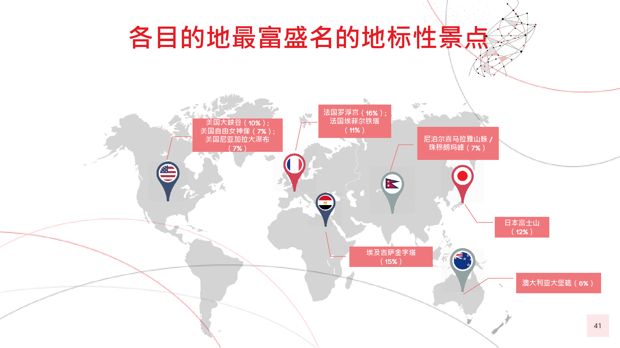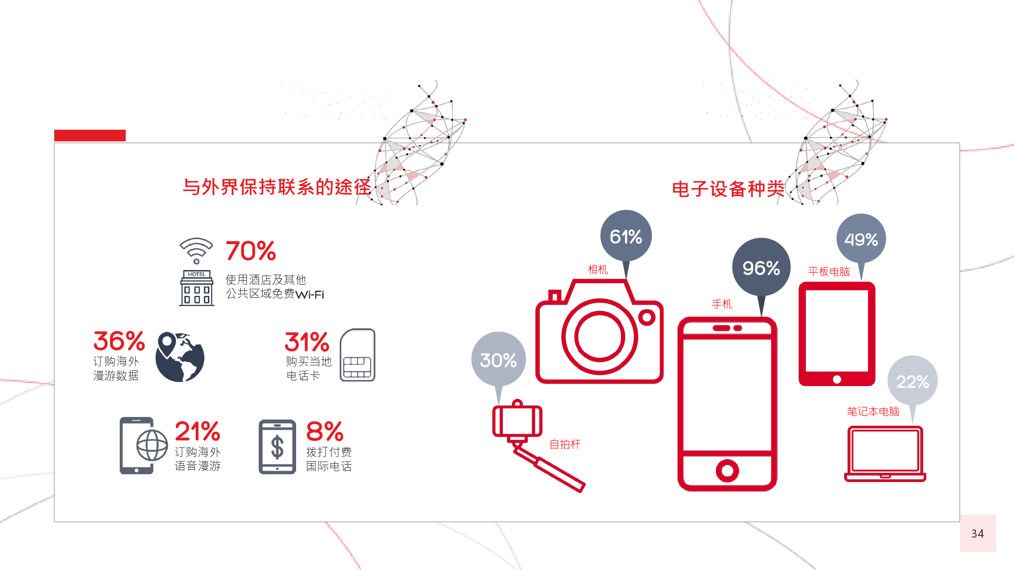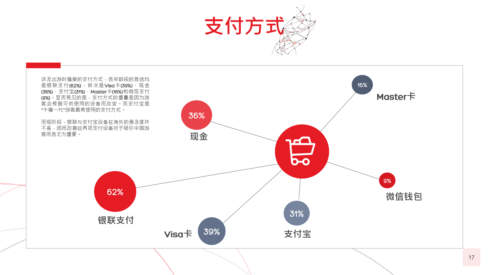 本年度的《中国游客境外旅游调查报告》揭示了一些有 趣的新趋势,展现了中国游客不断发展的行为和偏好。 举例来说,由于中国游客的精明程度和富裕程度越来越 高,渴望游历的决心日益增强,使得跟团游逐渐降温, 而生态游、主题游和自由行则日益流行,受到人们的追 捧。尤为值得一提的是,这在我们调查的每代人中都是 如此。