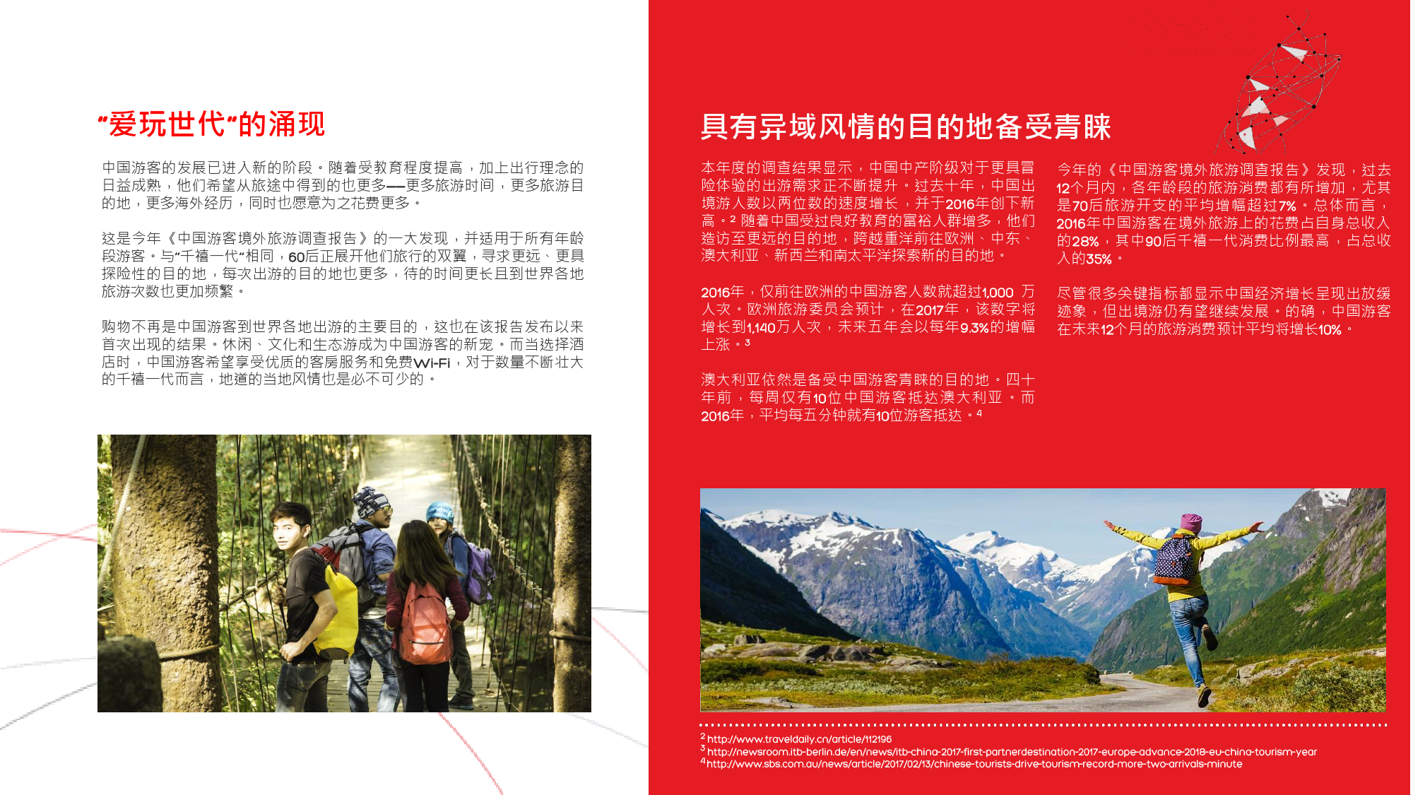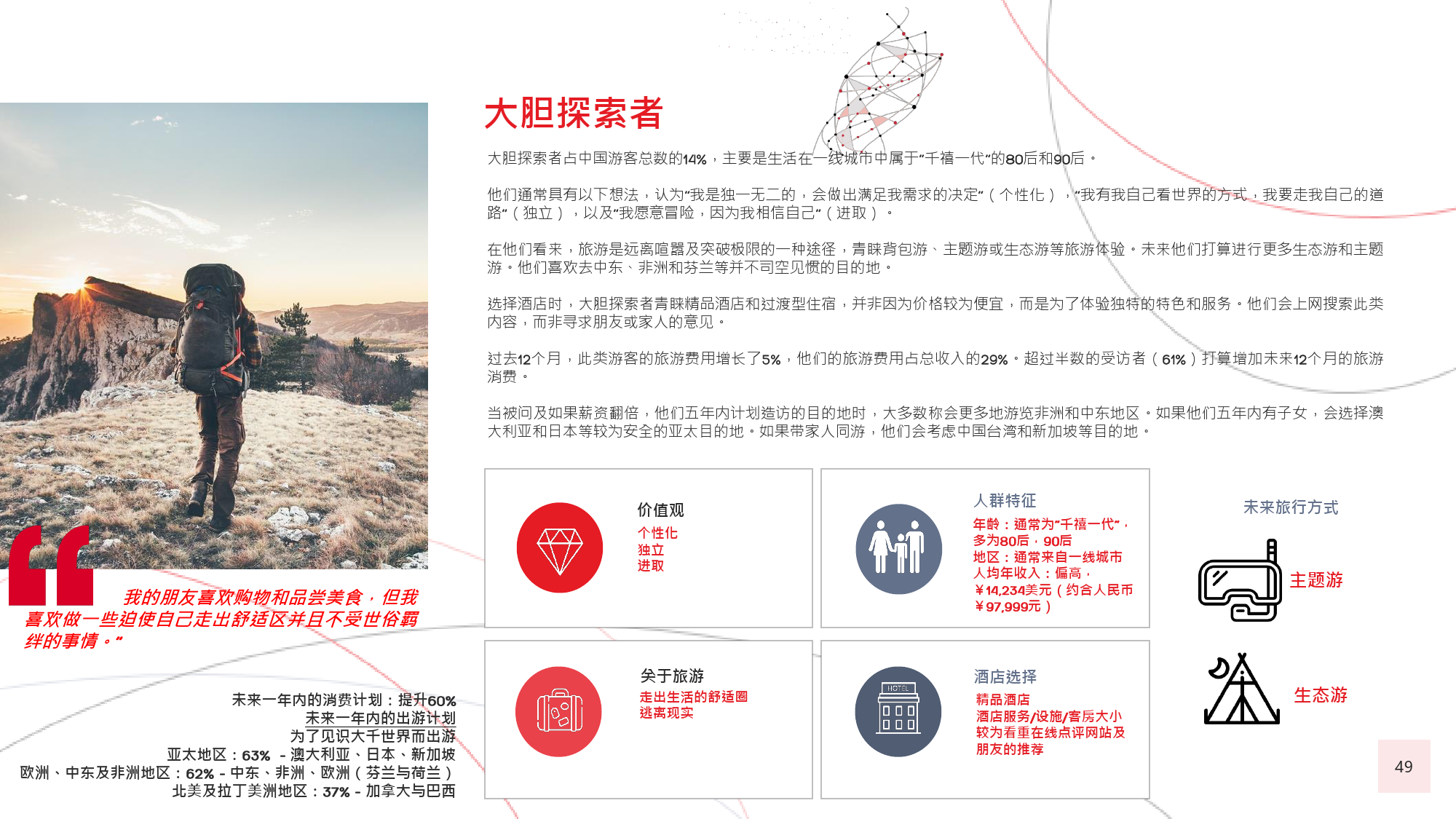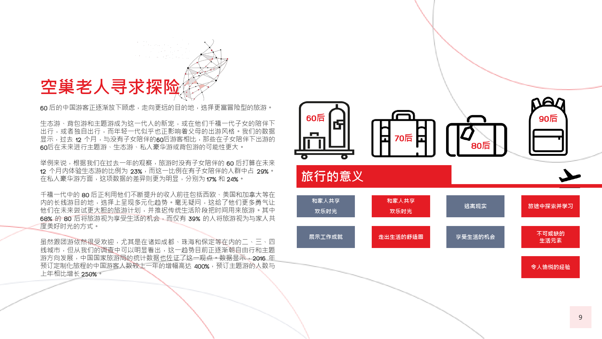 60后游客曾殷切地期盼能够参与更多冒险之旅,并且憧憬着走出国门,去到更远的地方,游历更多新的目的地。80后和90后的年轻游客也是如此,这种风气十分盛行,以致于很多80后推迟了结婚生子等传统的人生阶段,以便更加大胆自由地游历更广阔的世界。