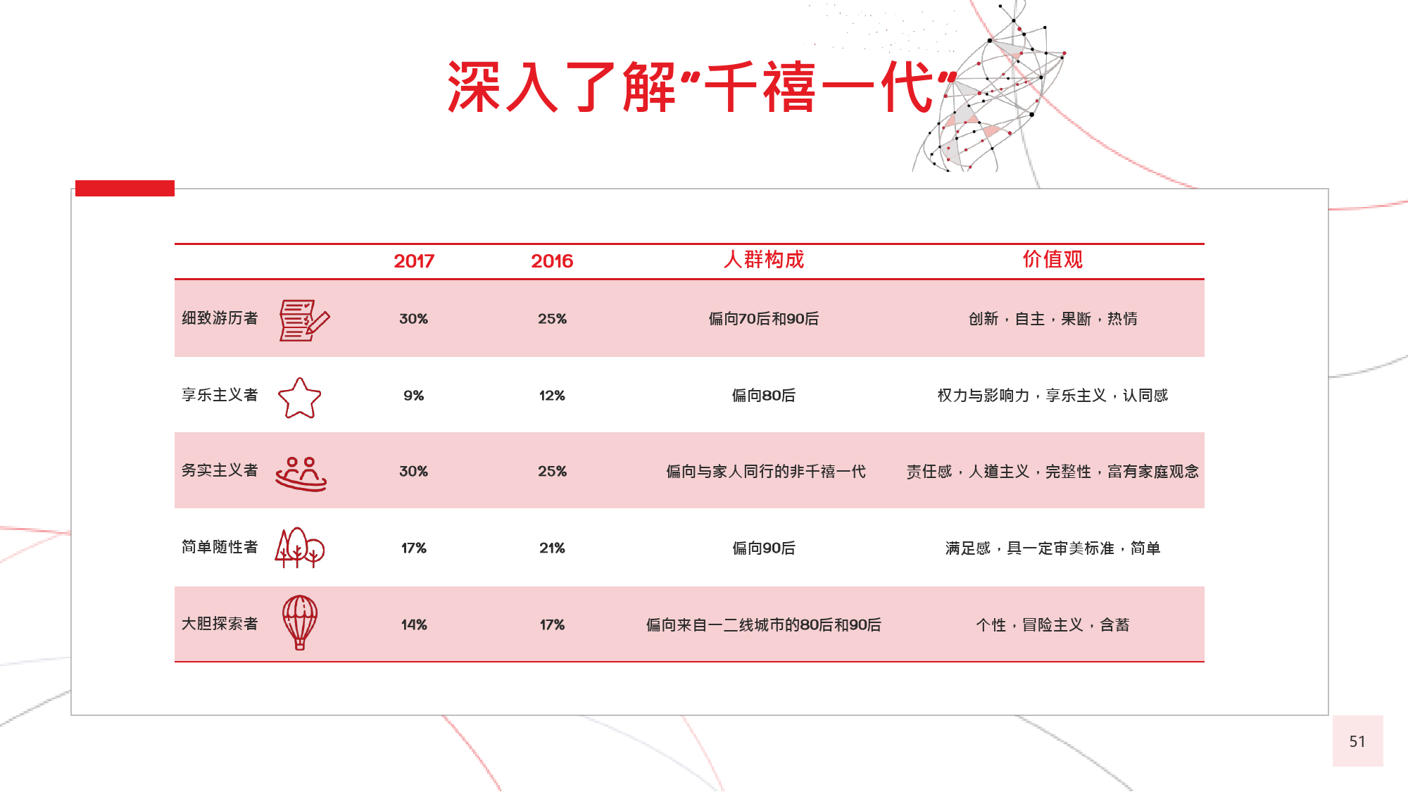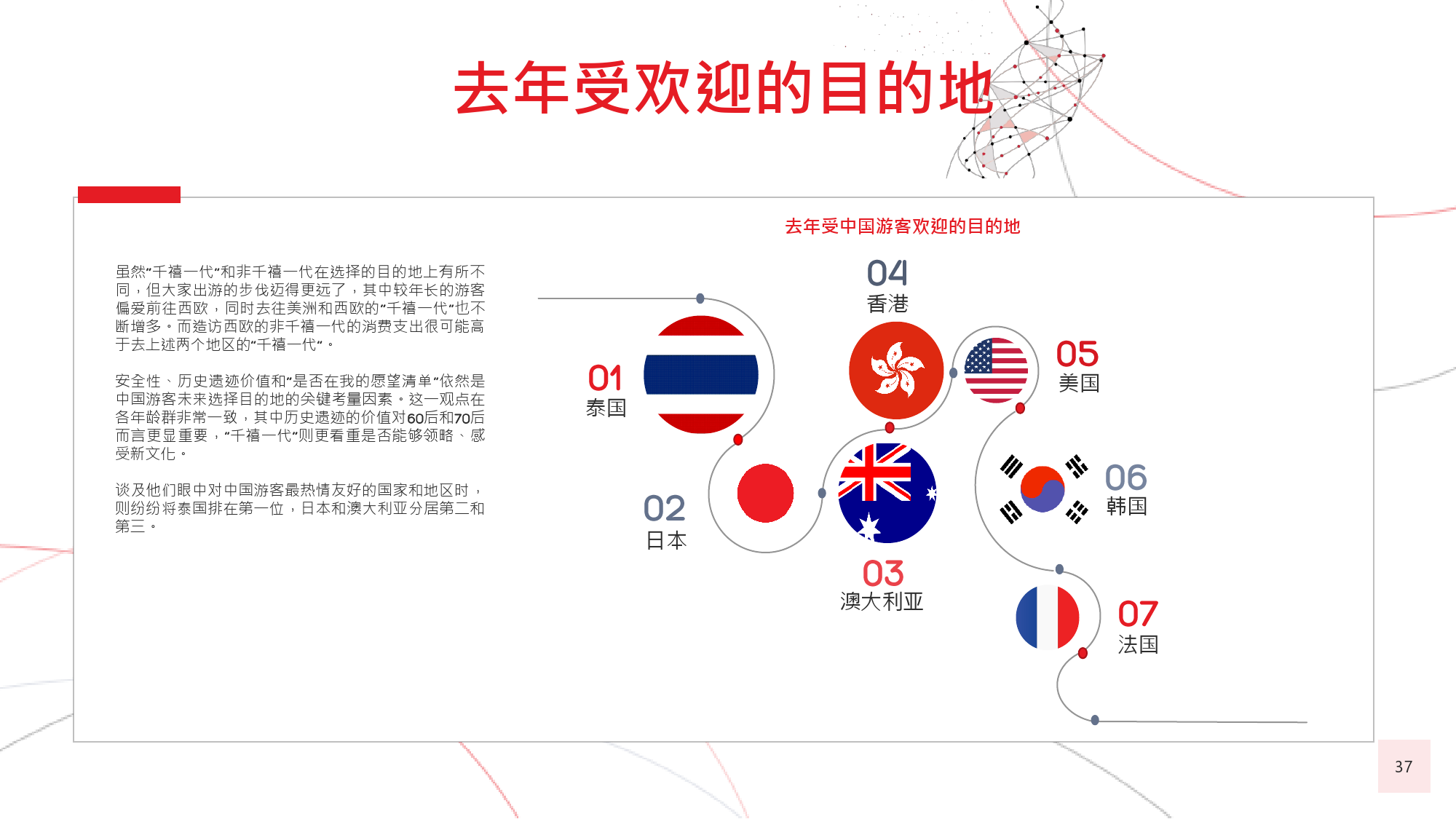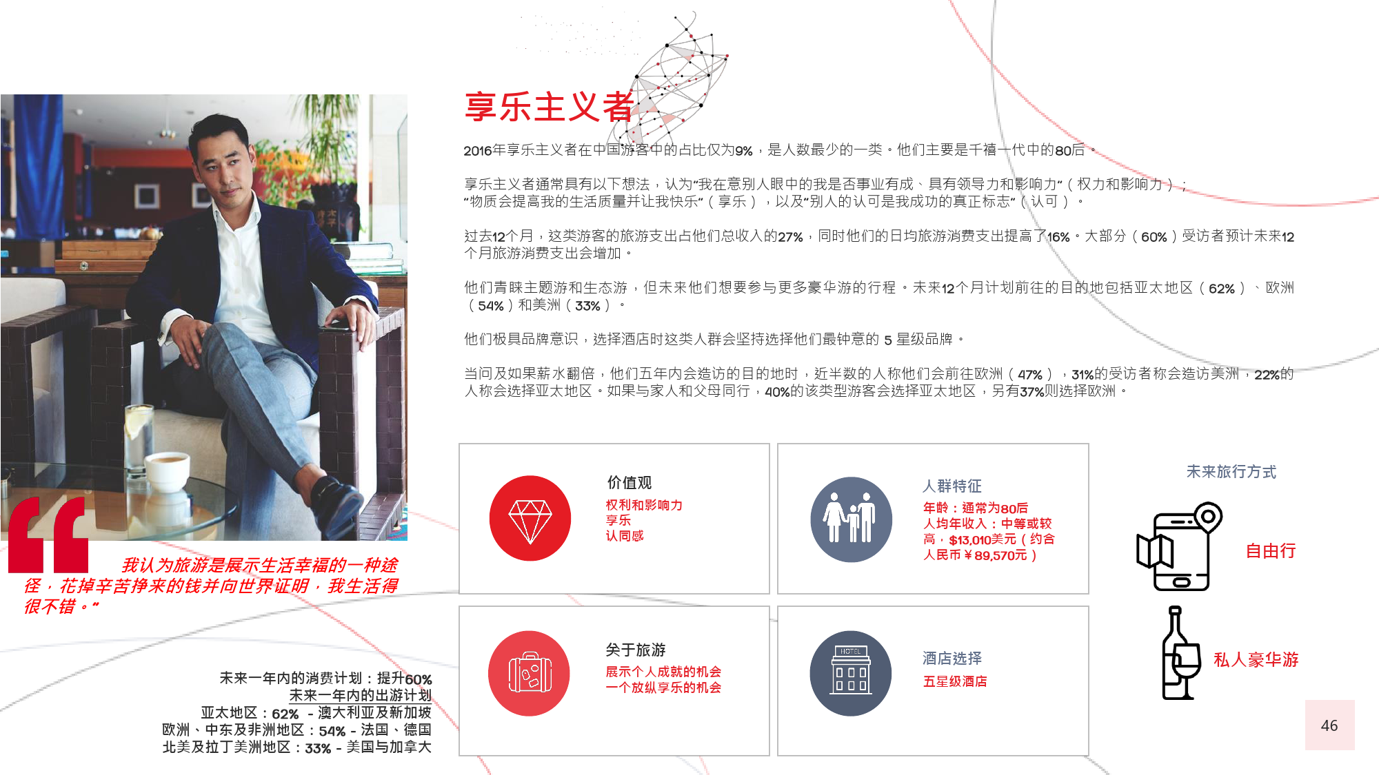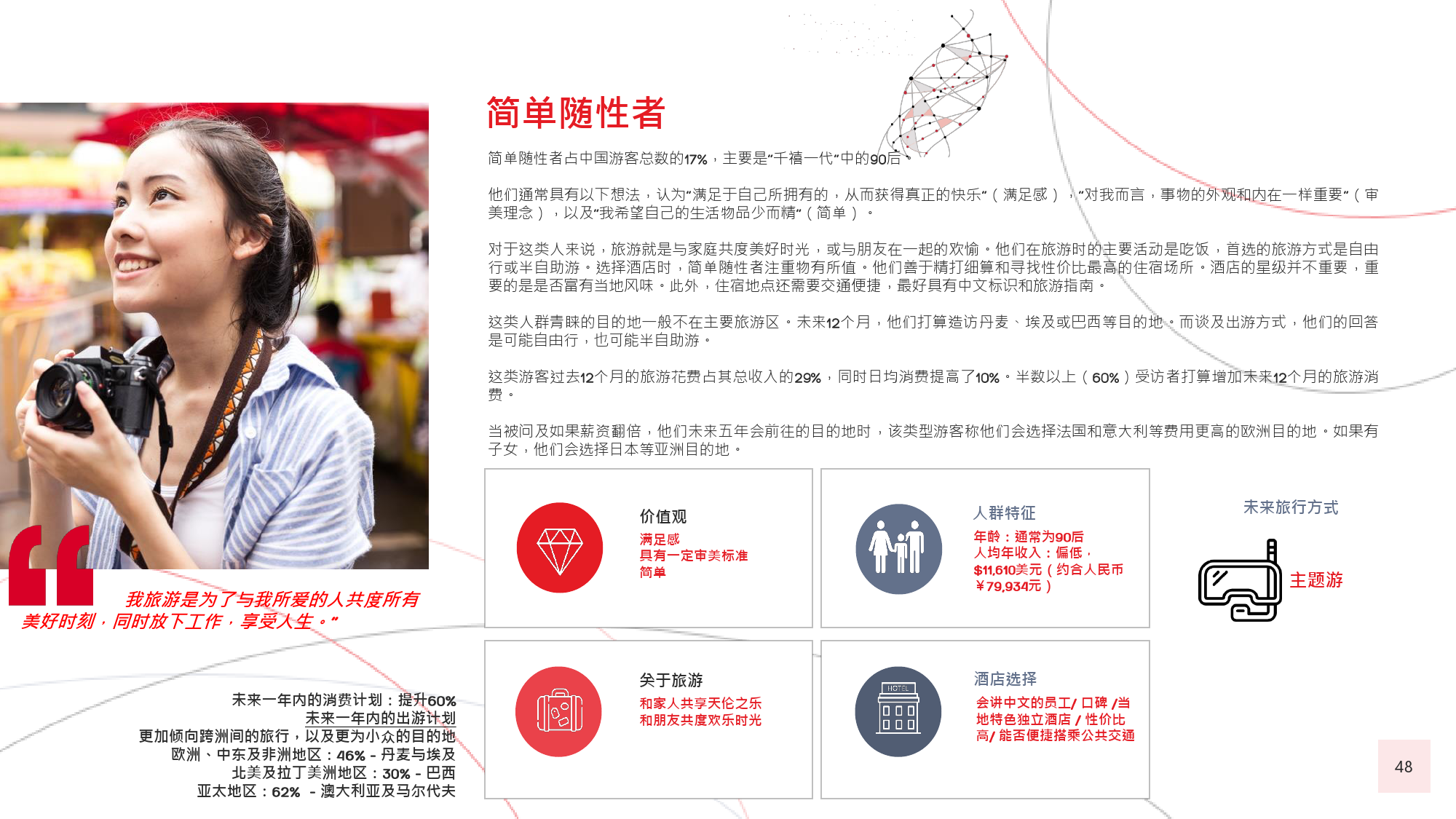 60后游客曾殷切地期盼能够参与更多冒险之旅,并且憧憬着走出国门,去到更远的地方,游历更多新的目的地。80后和90后的年轻游客也是如此,这种风气十分盛行,以致于很多80后推迟了结婚生子等传统的人生阶段,以便更加大胆自由地游历更广阔的世界。
